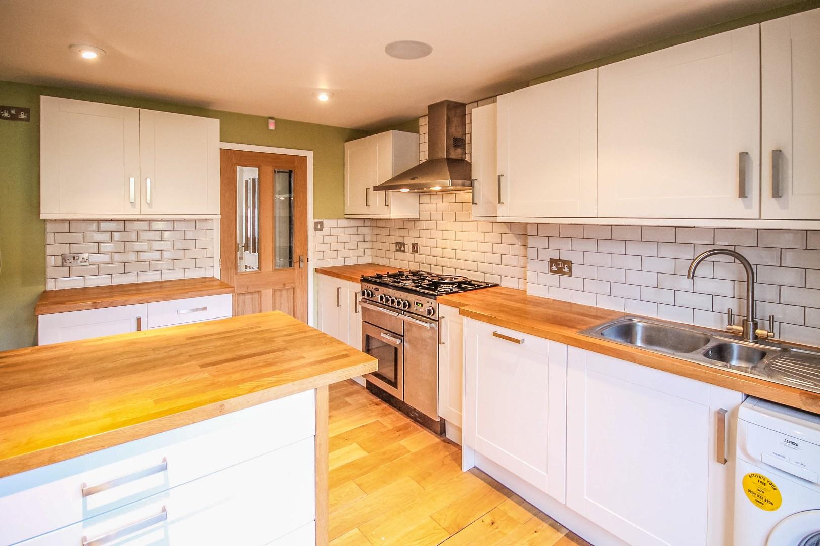 The open plan sitting / dining room has attractive oak flooring, built-in storage/media unit located under the staircase rising to the first-floor accommodation, which is enclosed from the room. The full-width kitchen / breakfast room offers an extensive range of contemporary units and drawers, solid wood countertops with tiled upstands, matching Island / breakfast bar and space and plumbing for freestanding appliances. Glazed double doors provide access to the garden.