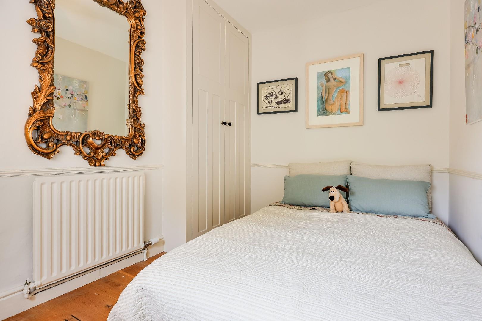 The accommodation comprises a well-proportioned reception room with sash windows, wooden floorboards, panelled staircase, bespoke recess book shelving and an effective inset woodburning stove. A sliding door opens to a refitted and well-equipped kitchen, which provides low-level units and drawers under a granite working surface with matching upstands, wall-mounted shelves and space for freestanding appliances. There is access to a courtyard area and a separate access leading to an extensively glassed dining area providing views of and access to the garden.