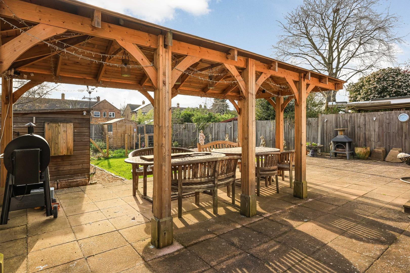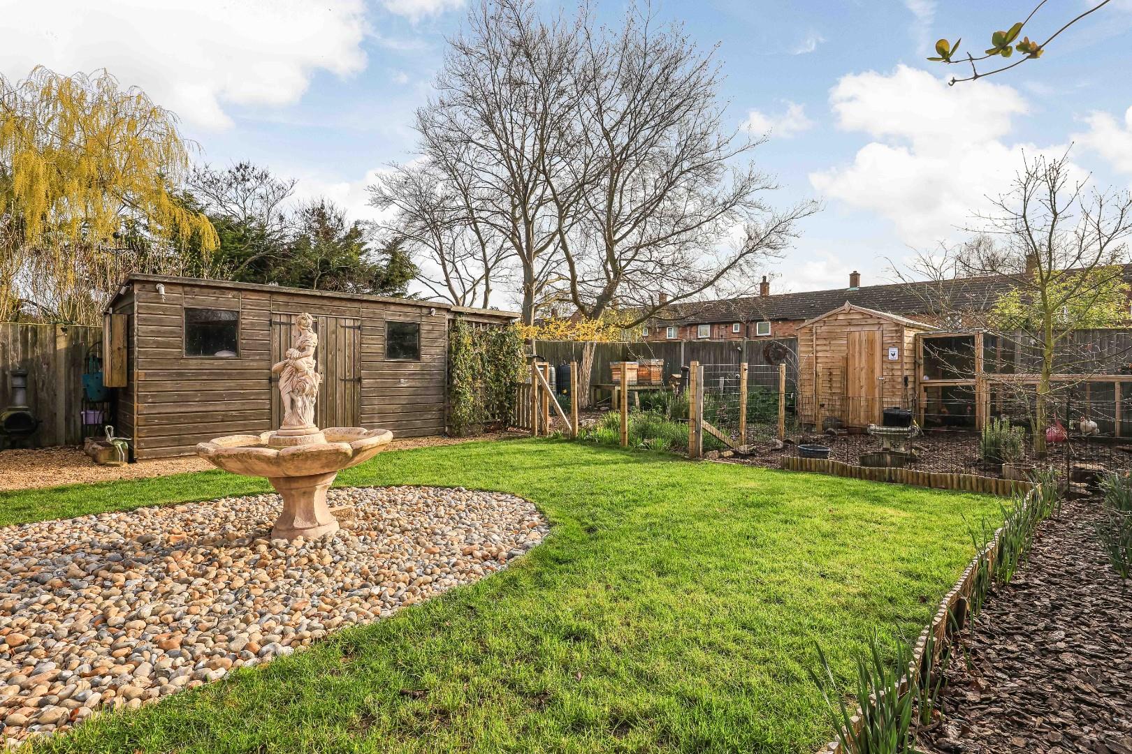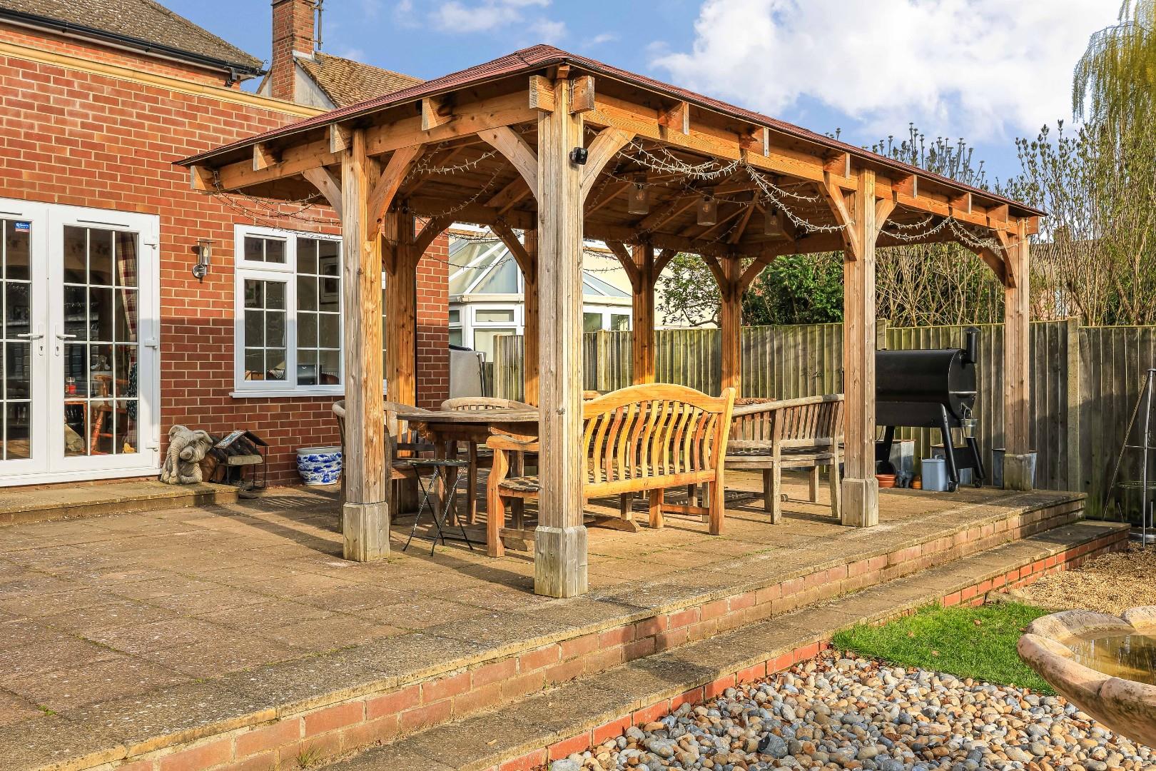 Side pedestrian access leads to a broad south-facing rear garden. There is a large, paved sun terrace with an oak-framed covered seating area, lawn, enclosed chicken run and a kitchen garden. A timber shed and covered side area provide useful storage.