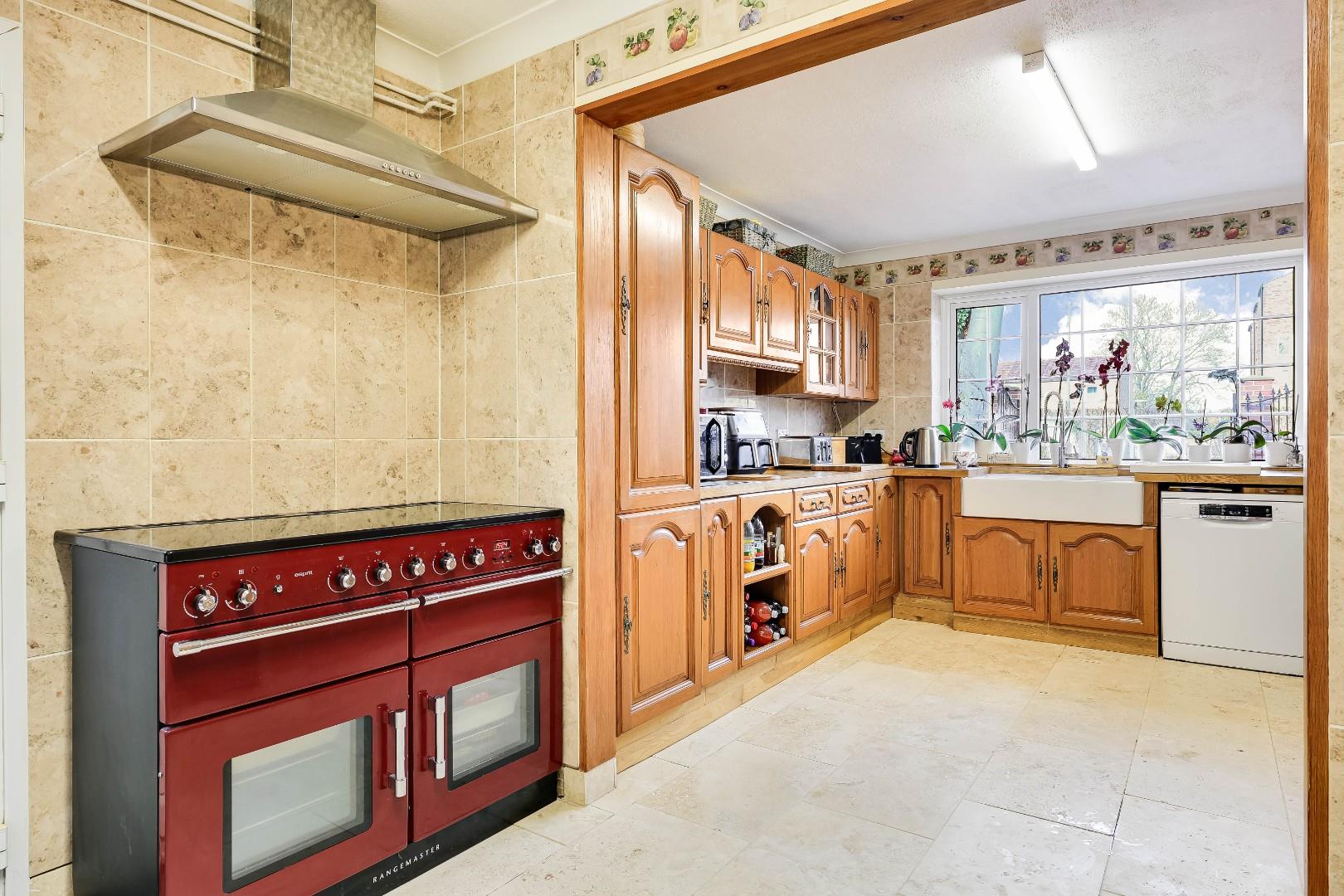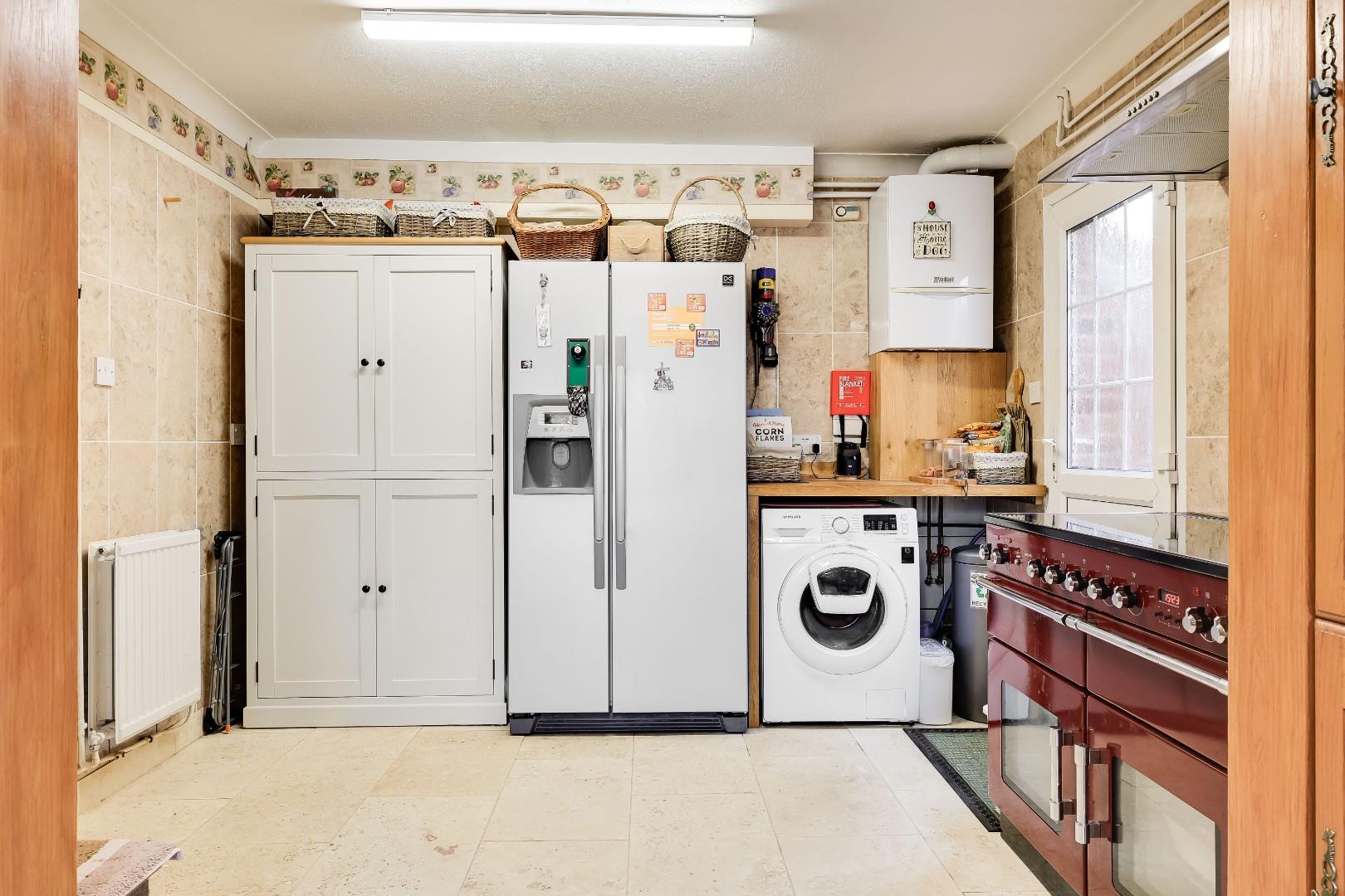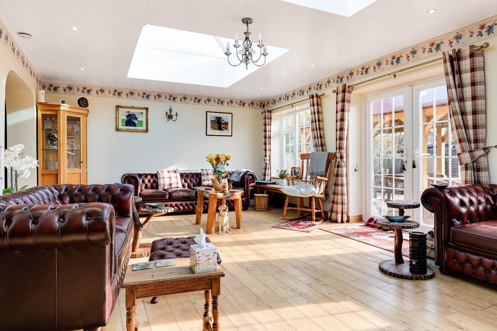 Side pedestrian access leads to a broad south-facing rear garden. There is a large, paved sun terrace with an oak-framed covered seating area, lawn, enclosed chicken run and a kitchen garden. A timber shed and covered side area provide useful storage.