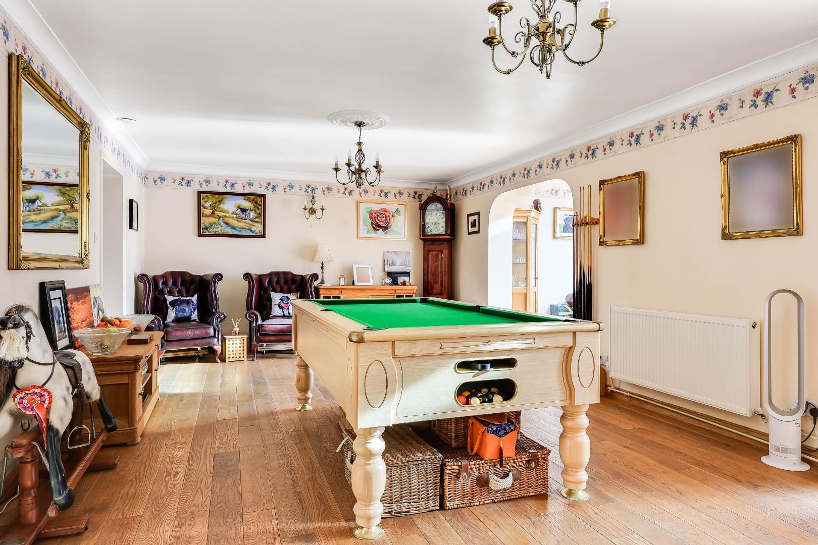The accommodation comprises a central entrance hall which leads to a cloakroom/WC. There is a well-equipped, open plan kitchen with space for a dining table and chairs and access to the outside. A generous formal dining room opens into a 27 ft wide family/games room, which connects to a large living space with roof lanterns, woodburning stove and glazed doors opening to an extensive sun terrace.
