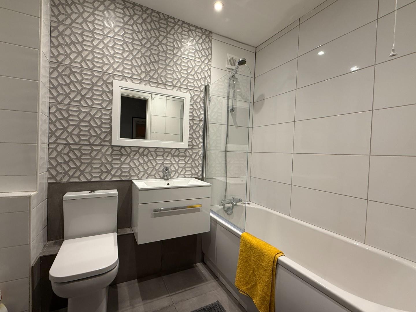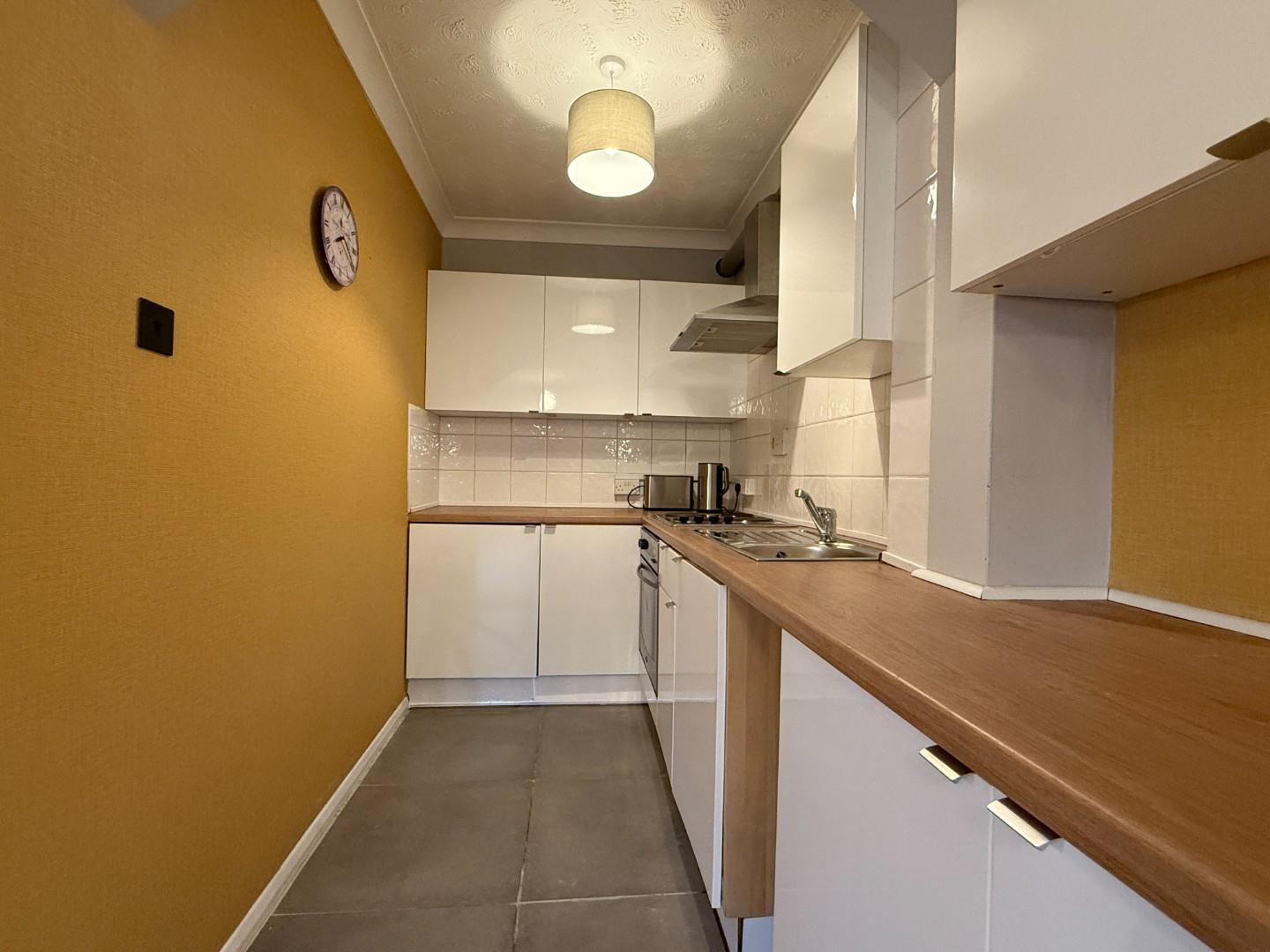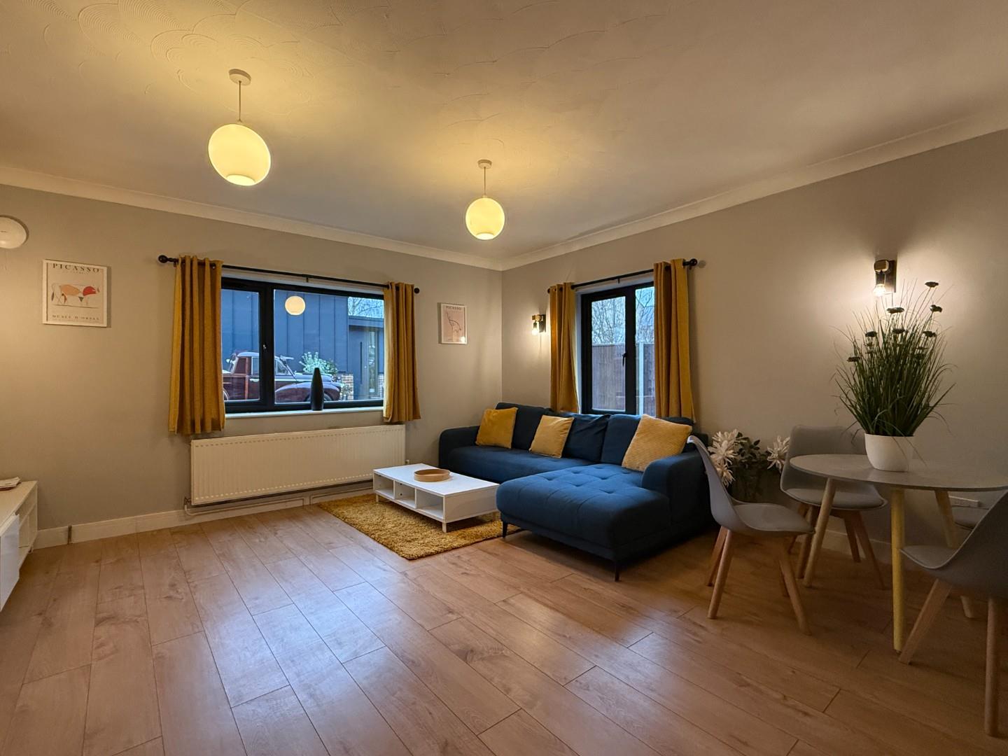 Situated in a select, well maintained development, the property provides good size, well planned accommodation. The entrance/utility room has a work top and storage and also a washing machine and tumble dryer. The entrance hall has a large built in storage cupboard and doors off to both of the bedrooms which have double wardrobes, wooden framed double beds and set of drawers. There is a modern bathroom with white suite comprising bath with shower attachment over, vanity wash hand basin and w/c. There is a storage unit ideal for towels and a large wall mounted mirror. The spacious living/dining room is dual aspect and has a nice feeling of space and two, two seater sofas and a dining table with four chairs. An archway then leads to the kitchen which has base and eye level units and has an oven and hob and fridge supplied. Throughout the property there are double glazed windows with hardwood surround and gas fired central heating via radiators. Externally there is the added advantage of allocated parking space and bike rack.