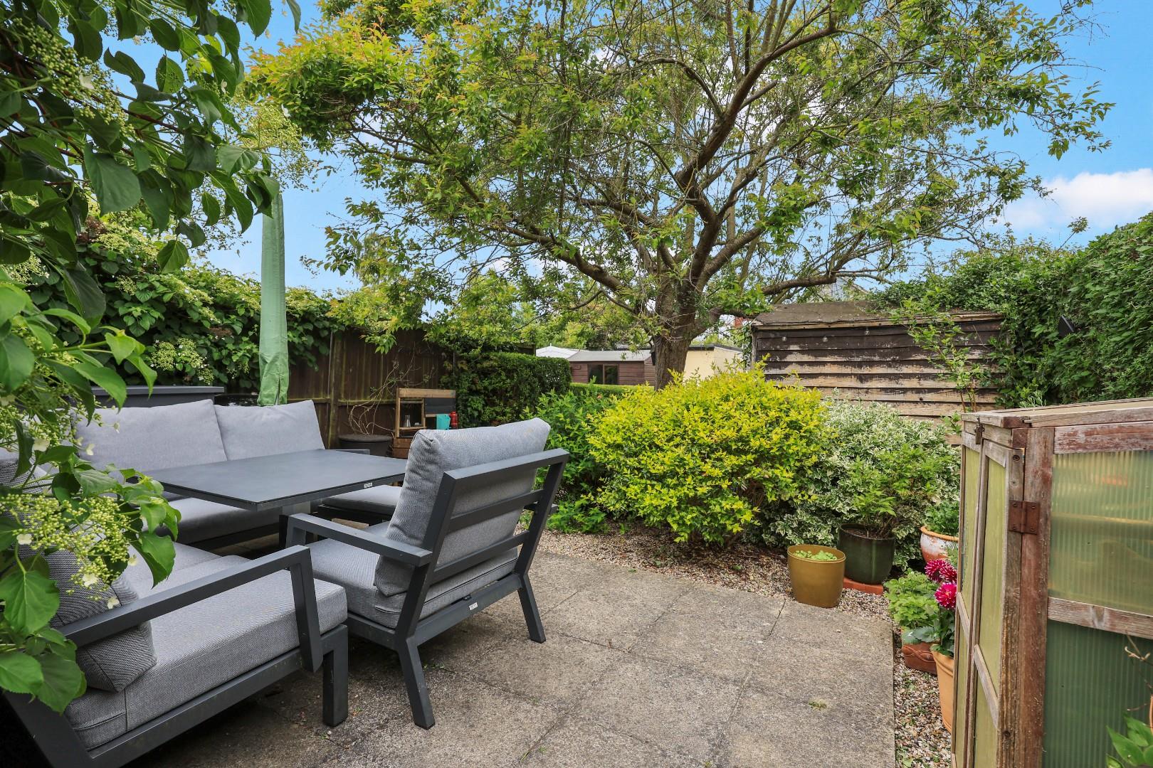 Outside, an established west-facing rear garden provides a private seating area, lawn with colourful and well-stocked borders and a neat pathway leading to a studio, which has a bespoke solid oak desk for two people, and a broad garage with an electric powered door.