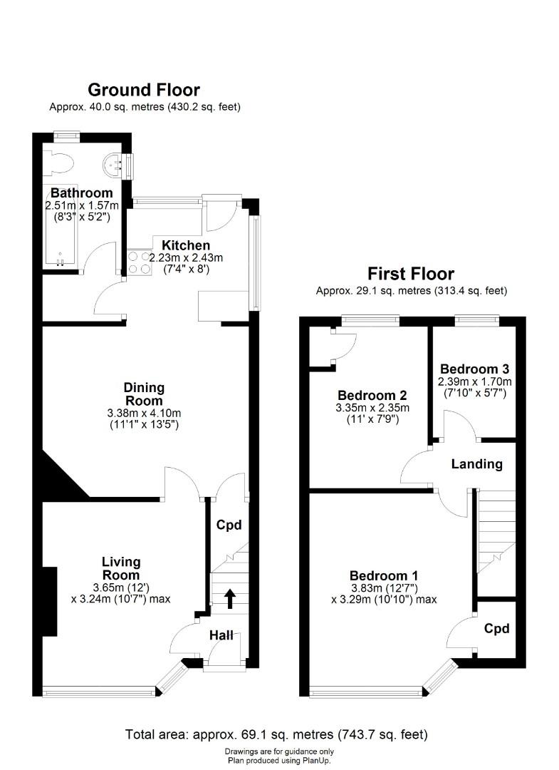 Upstairs, a landing area leads to three bedrooms. Bedrooms one and two both provide built-in storage.