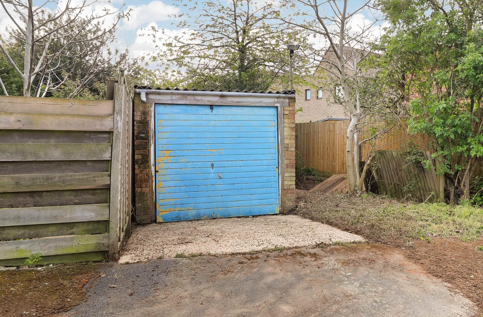 The property is set back from the road behind a generous frontage with side access to an enclosed rear garden with a detached garage and a parking area beyond.