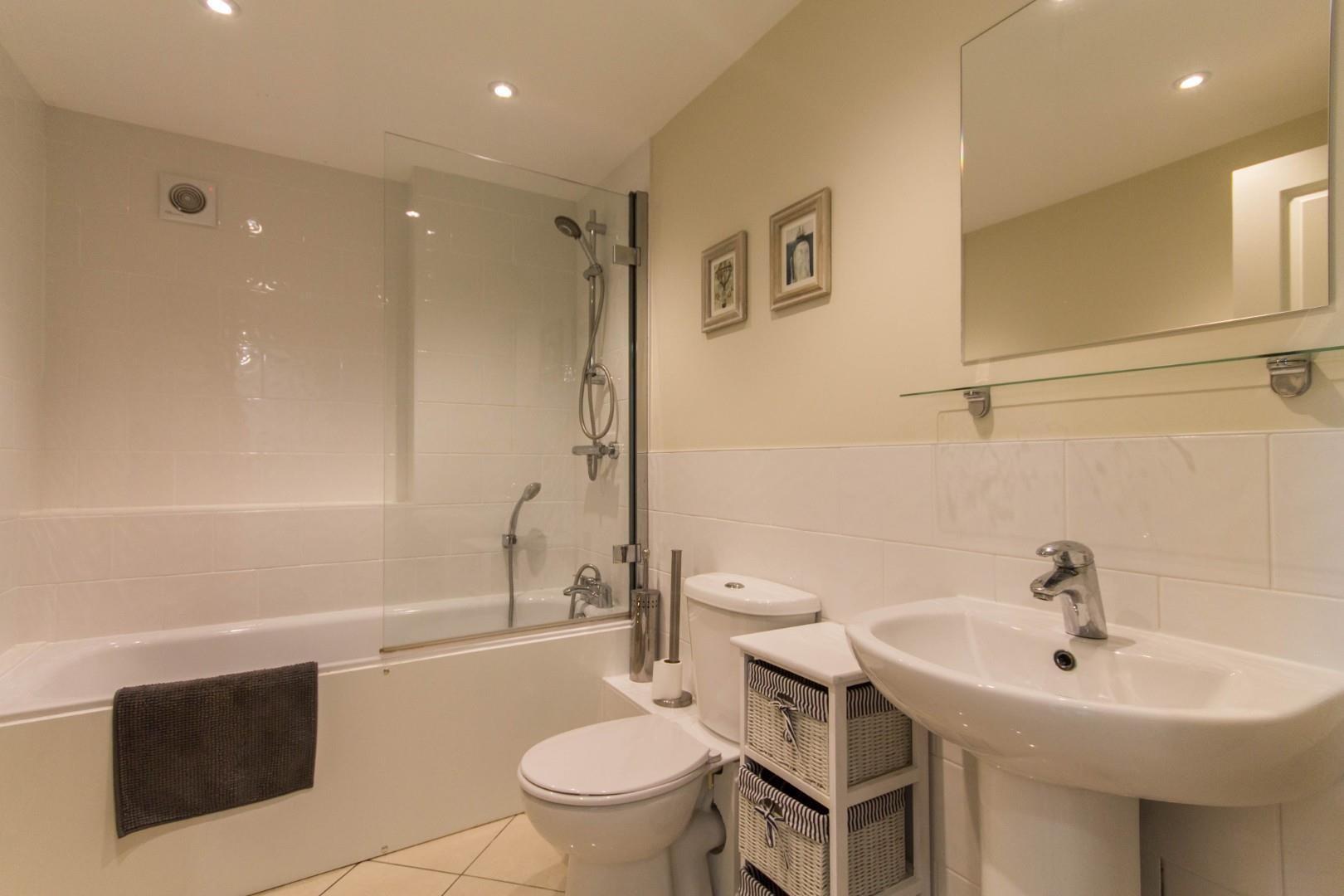 To the first floor are two generous double bedrooms, each with plenty of space for storage as well as a large bed. The family bathroom which serves each bedroom is tiled, has a paneled bath with shower above and is completed with a WC and pedestal sink basin.