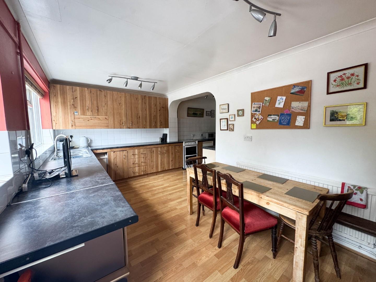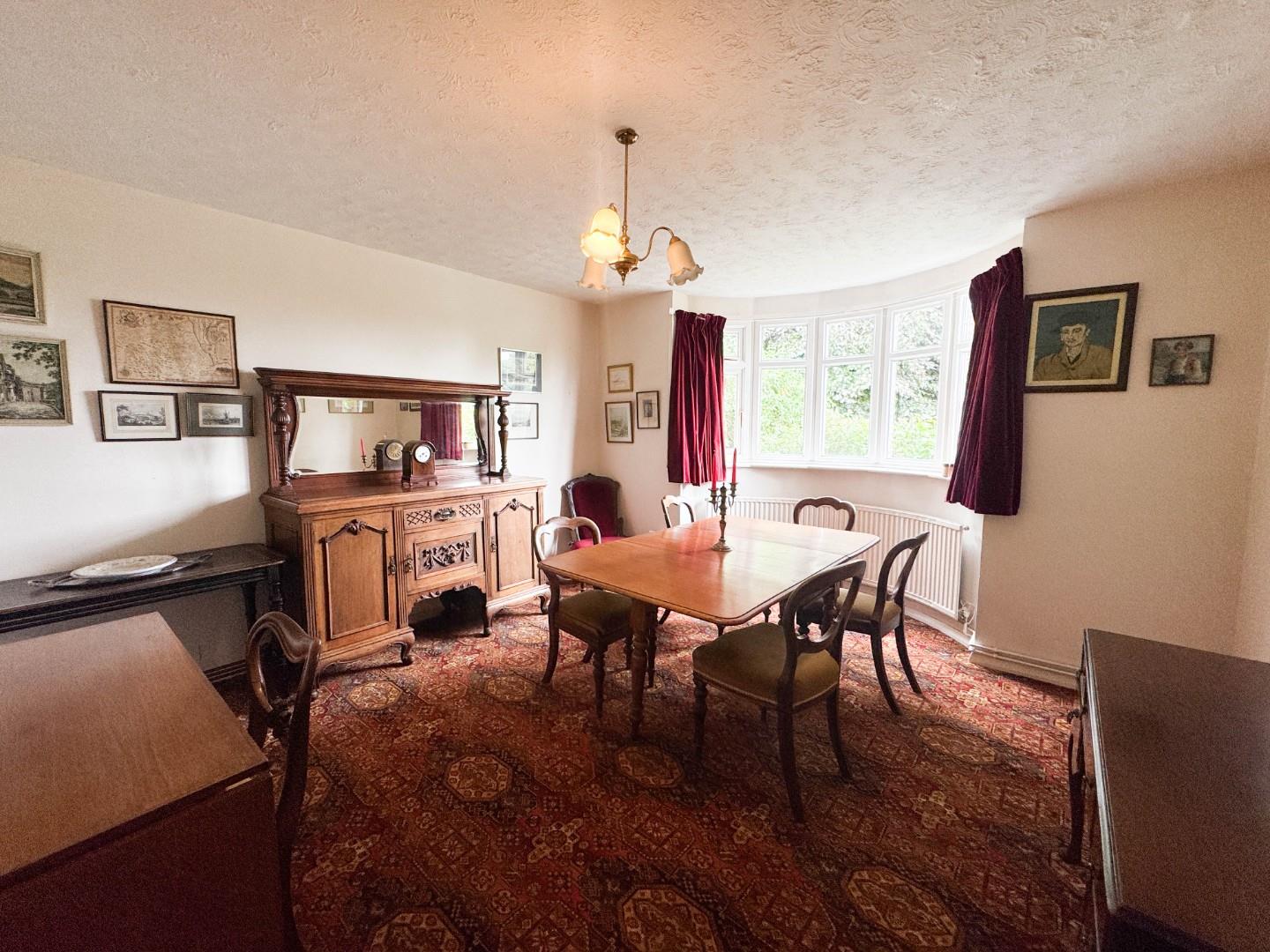 The property enjoys a fine no-estate position, set back and screened from the road with ample parking, a large one car garage and gardens and grounds of approximately a third of an acre.. The property offers great potential for further enlargement, reconfiguration and modernisation. The accommodation comprises a welcoming and generous reception hall with a cloakroom/ WC just off the inner hallway plus a door into the garage. There are two reception rooms including a generous sitting room with open fireplace and a bay windowed dining room. The kitchen/breakfast room overlooks the garden and is generously proportioned, fitted with a range of base level and wall mounted storage cupboards, ample fitted working surfaces with inset one and a half sink unit with mixer tap and drainer, gas cooker point, pantry cupboard, space for a washing machine, dishwasher, fridge/freezer and tumble dryer.