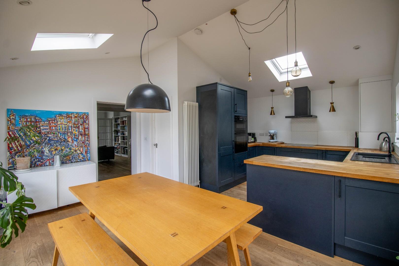 There is a generous bay-fronted living room with several storage cupboards and benefitting from a dual aspect. The room is finished with engineered wood flooring, which continues through to the noteworthy kitchen/dining room with a vaulted ceiling, triple aspect windows and three skylights. The kitchen has been fitted with a comprehensive range of modern units, includes a number of integrated appliances and is finished with solid oak worktops. Completing the ground floor accommodation is a refitted bathroom with a separate bath and shower, complemented by attractive tiling and a heated towel rail.