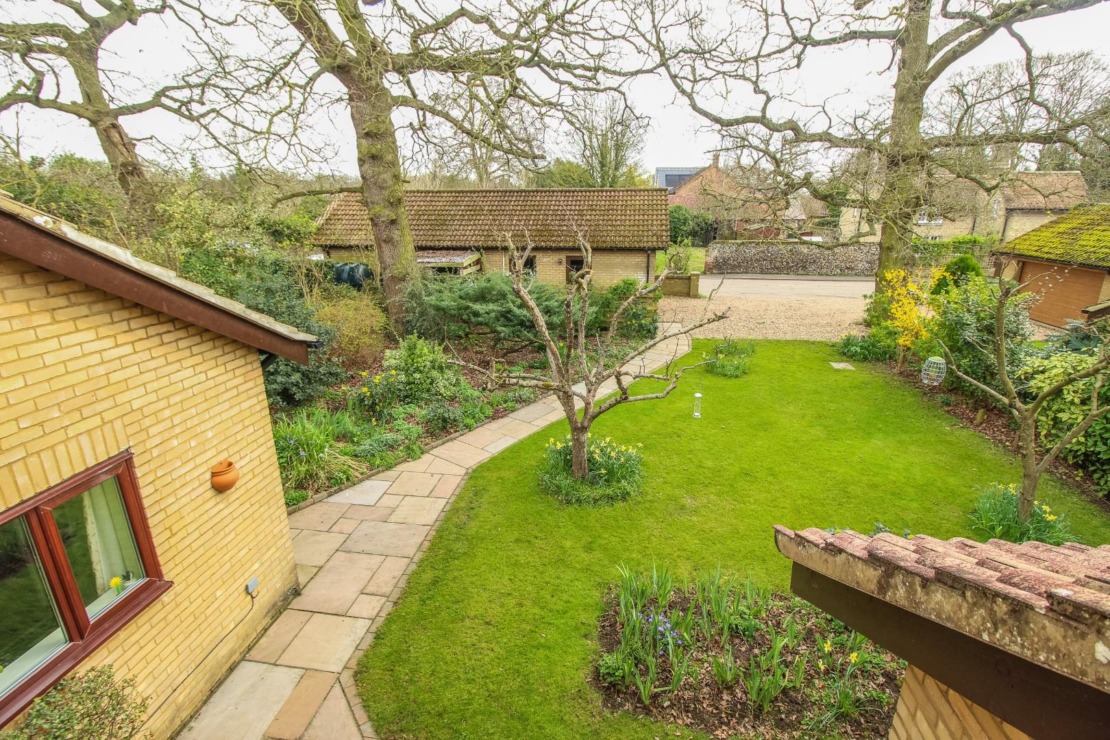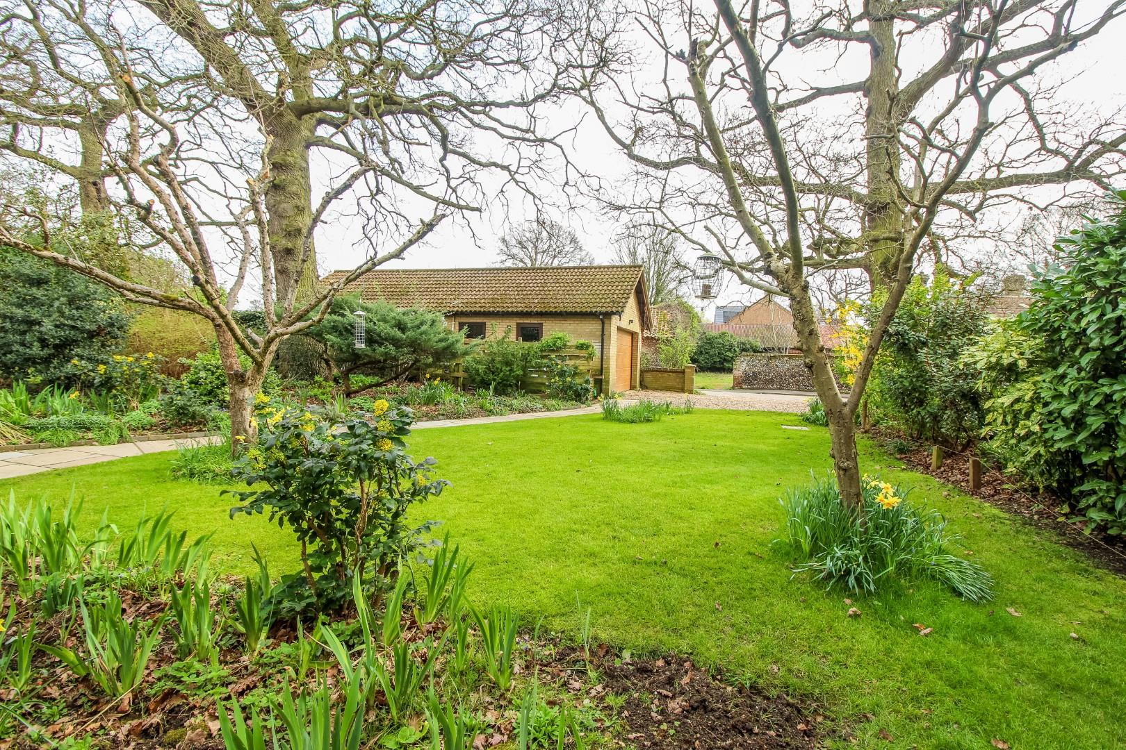 Outside, a gravelled driveway provides parking for several vehicles and leads to the double garage, which has power and light connected. The front garden is laid mainly to shaped lawns with well-stocked flower and shrub borders and beds and two mature oak trees. Gated access leads to the rear garden, which again is laid to a neat lawn with well-stocked flower and shrub borders, a generous paved patio area and all enjoys good levels of privacy, with views over the church in the distance.