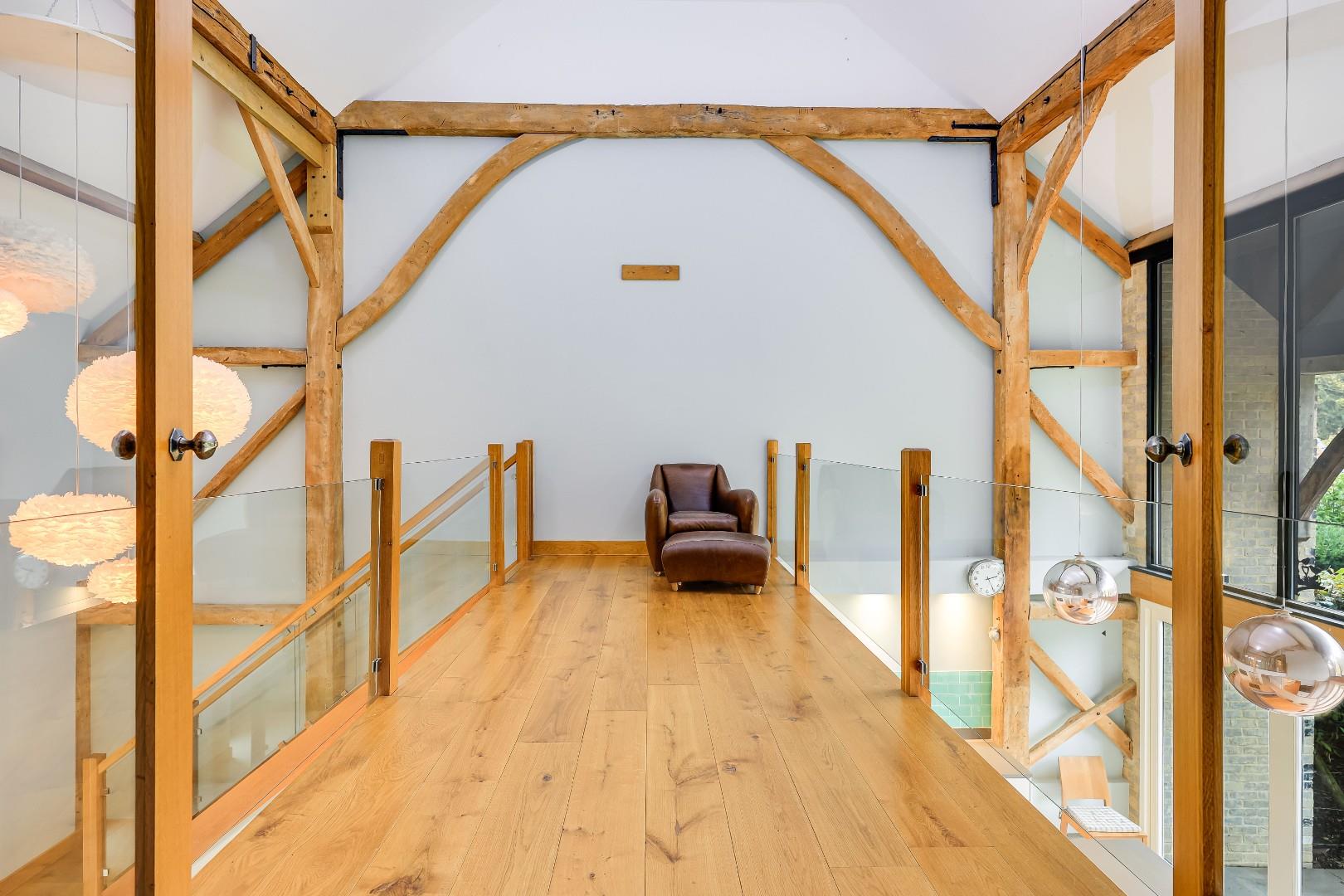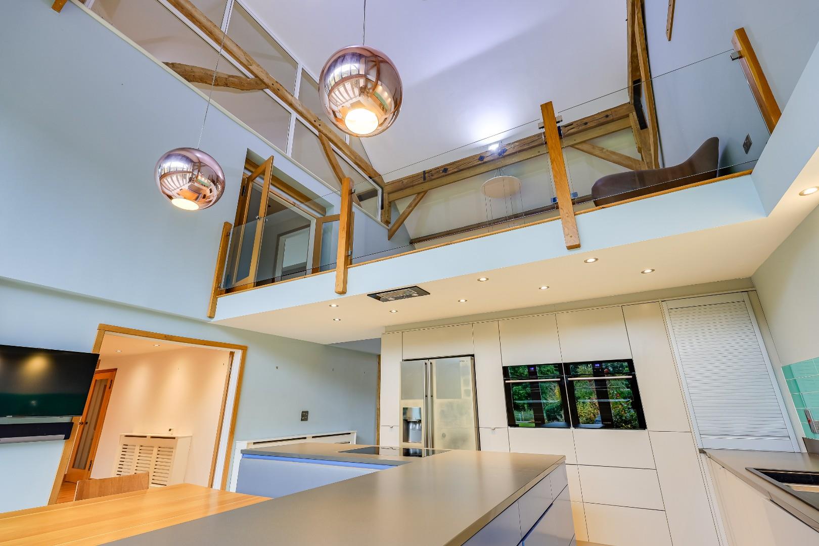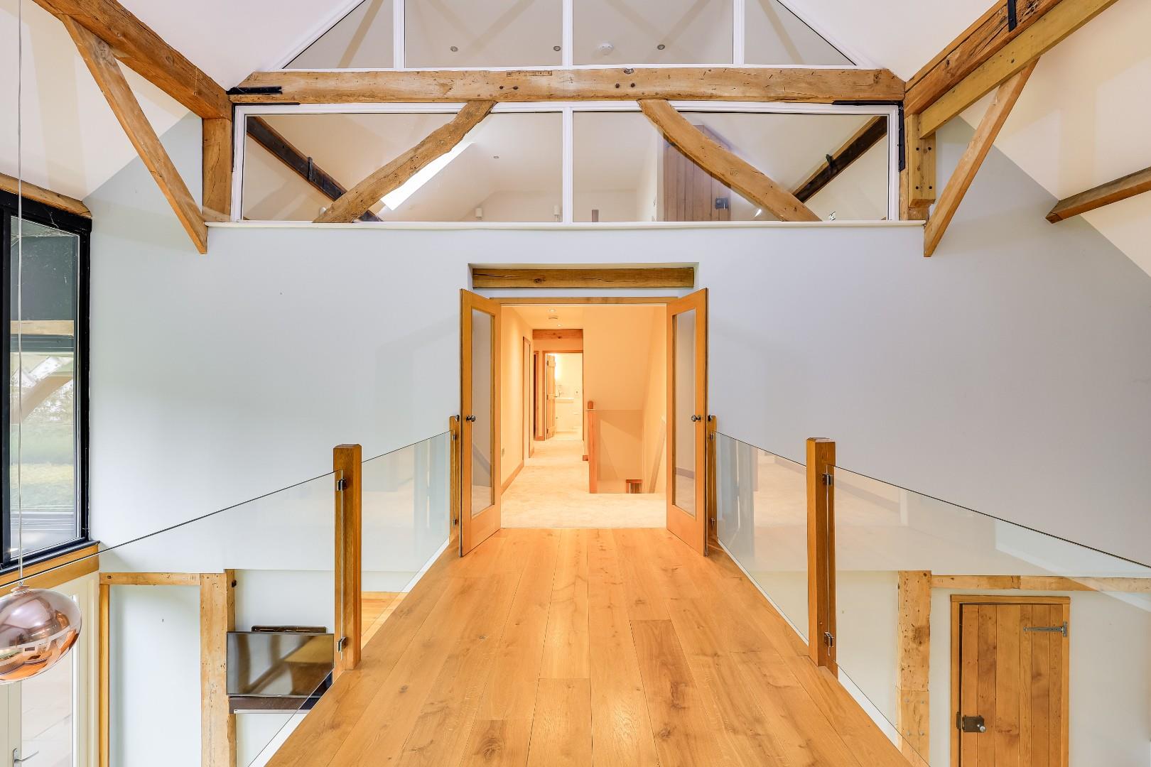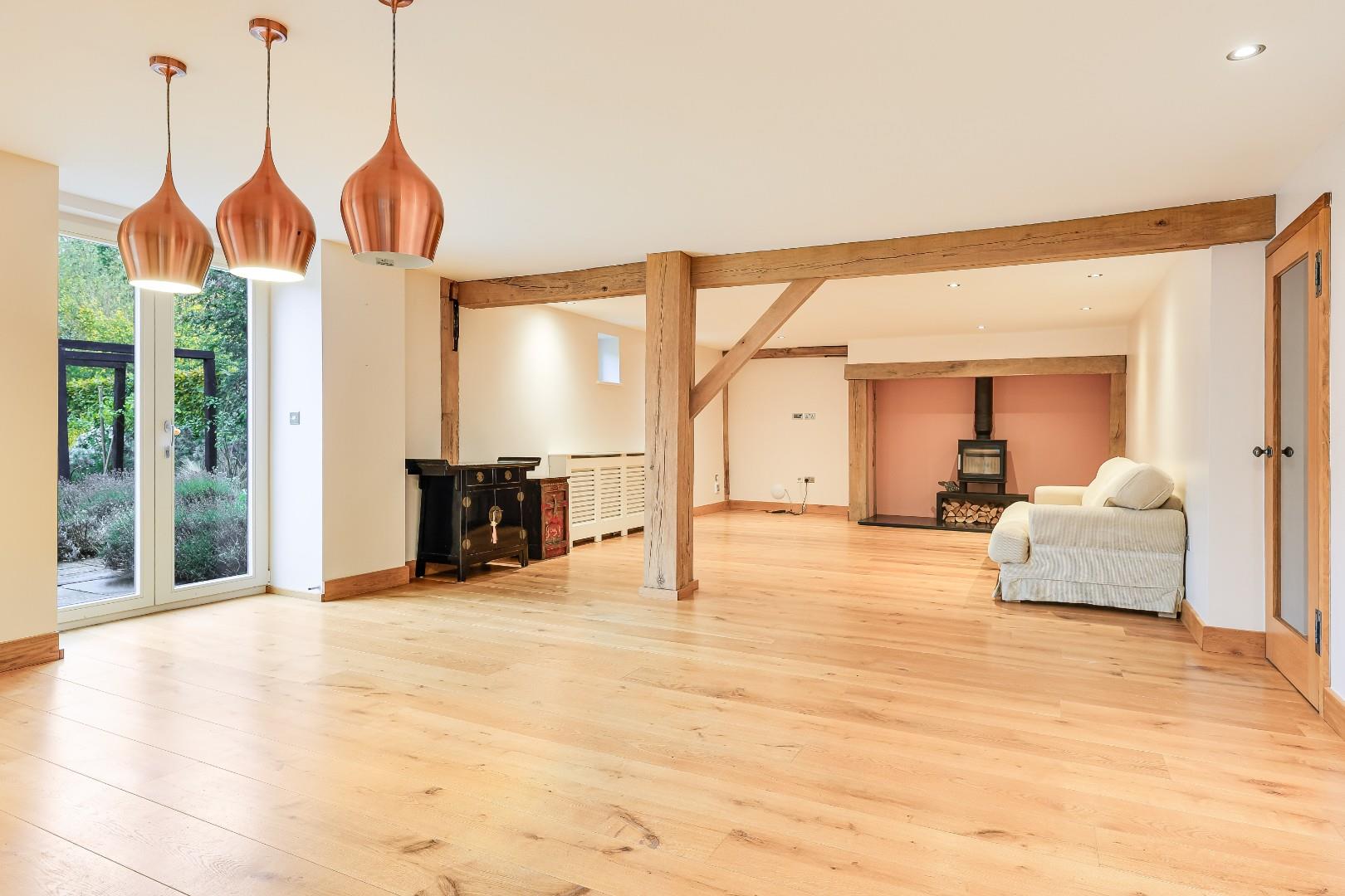 The open-planned living/dining room boasts exposed timbers, French doors to the garden and a feature fireplace housing a wood burning stove. Off the inner hallway is a large bedroom with fitted wardrobes and a luxury en-suite bathroom with walk-in shower. From the inner hallway is a second staircase leading to the first floor. Over the first and second floor, there are four further large double bedrooms and three bathrooms (two en-suite). Bedroom five makes a wonderful office/studio with a glazed elevation which overlook the vaulted area.