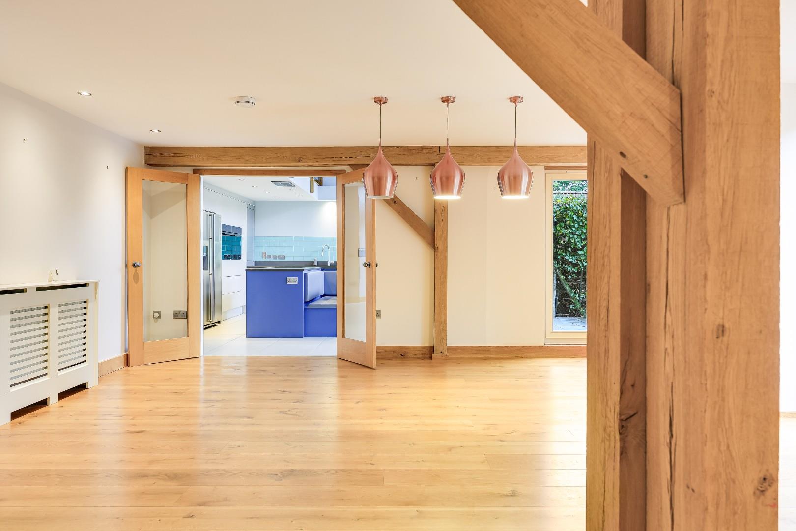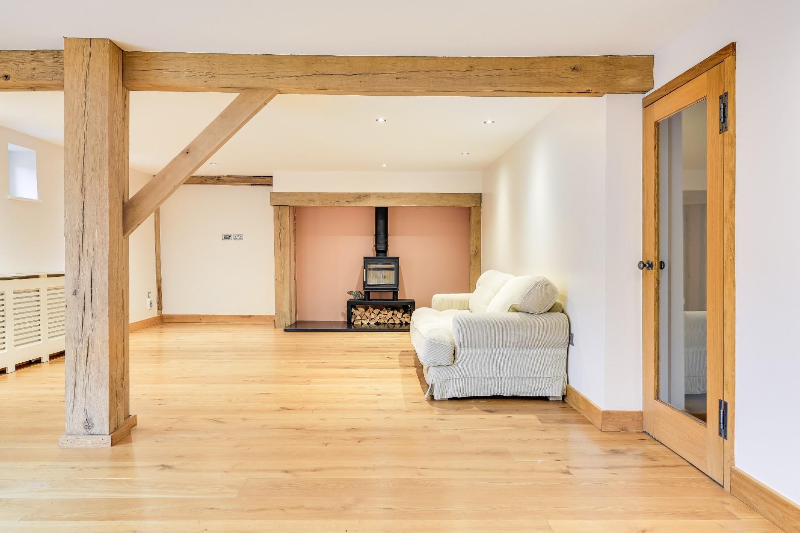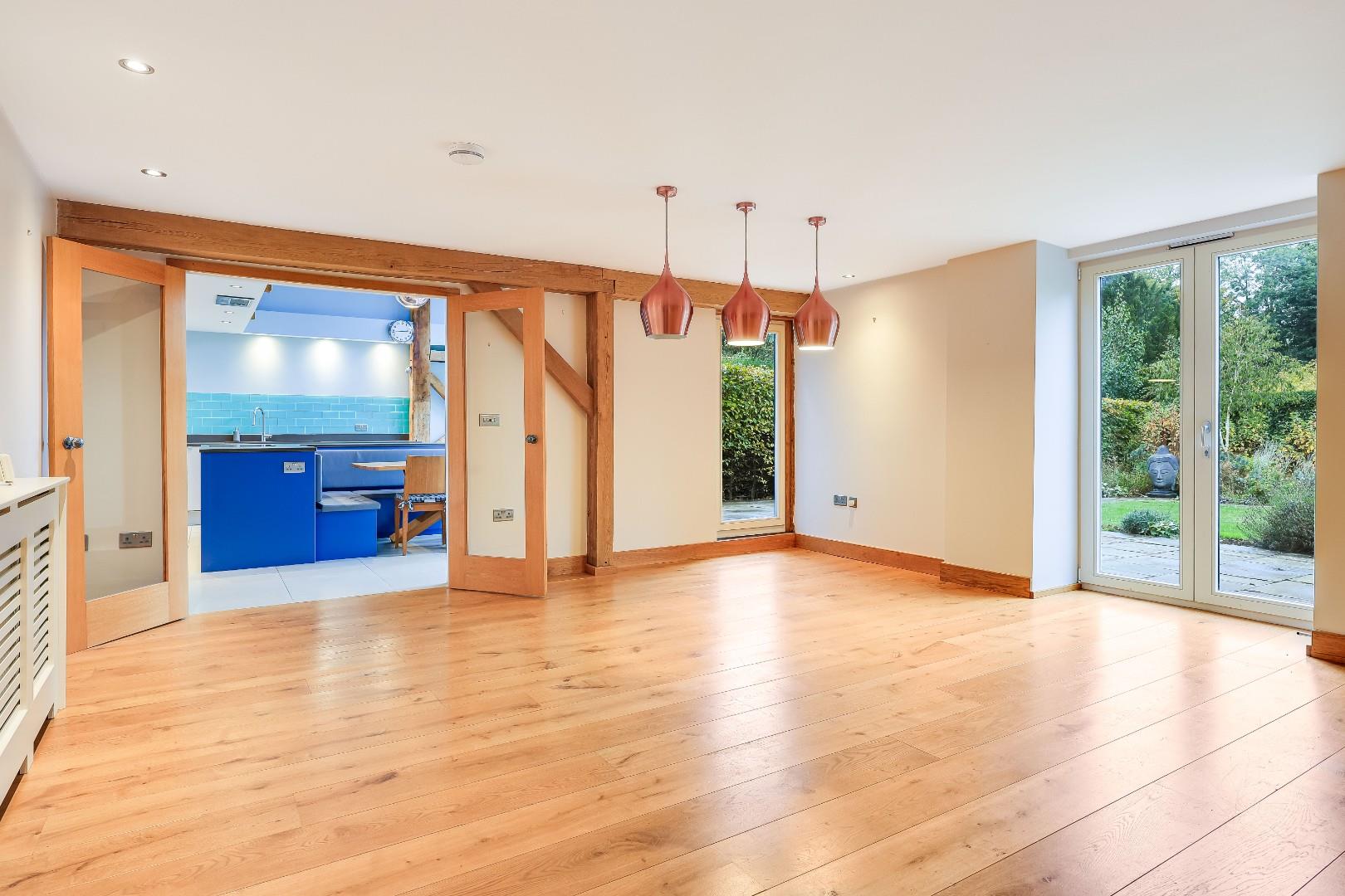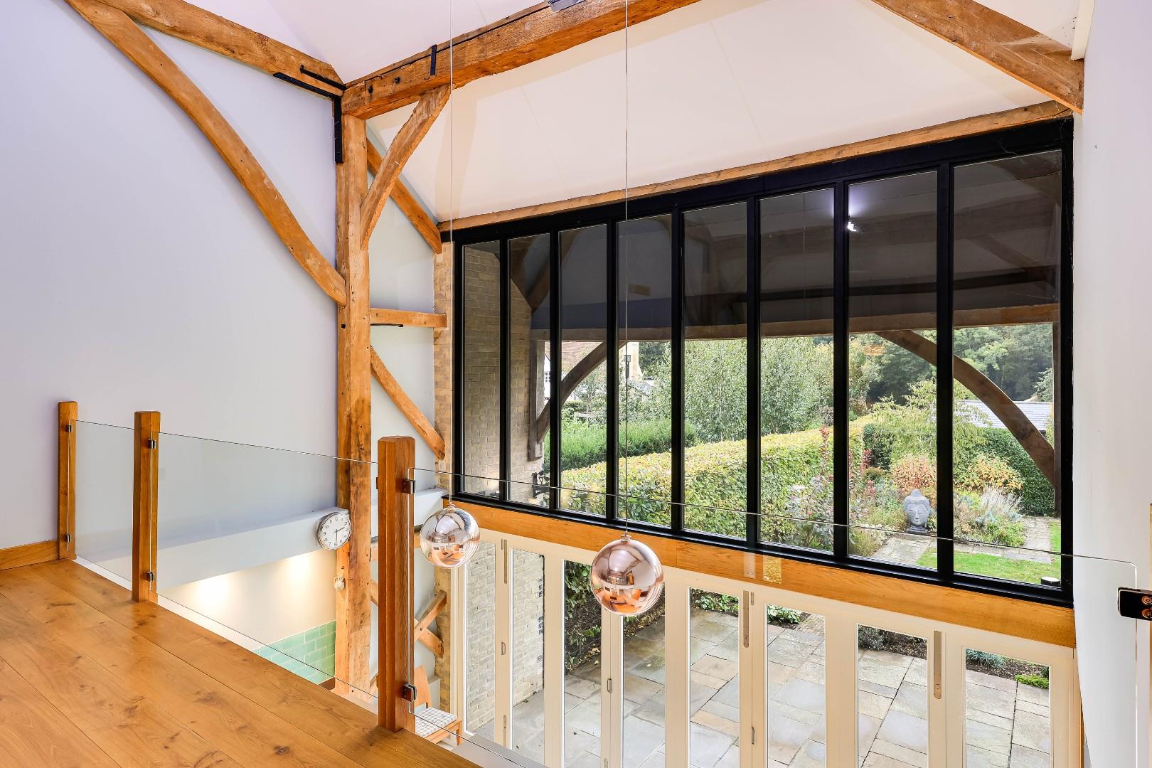 The open-planned living/dining room boasts exposed timbers, French doors to the garden and a feature fireplace housing a wood burning stove. Off the inner hallway is a large bedroom with fitted wardrobes and a luxury en-suite bathroom with walk-in shower. From the inner hallway is a second staircase leading to the first floor. Over the first and second floor, there are four further large double bedrooms and three bathrooms (two en-suite). Bedroom five makes a wonderful office/studio with a glazed elevation which overlook the vaulted area.