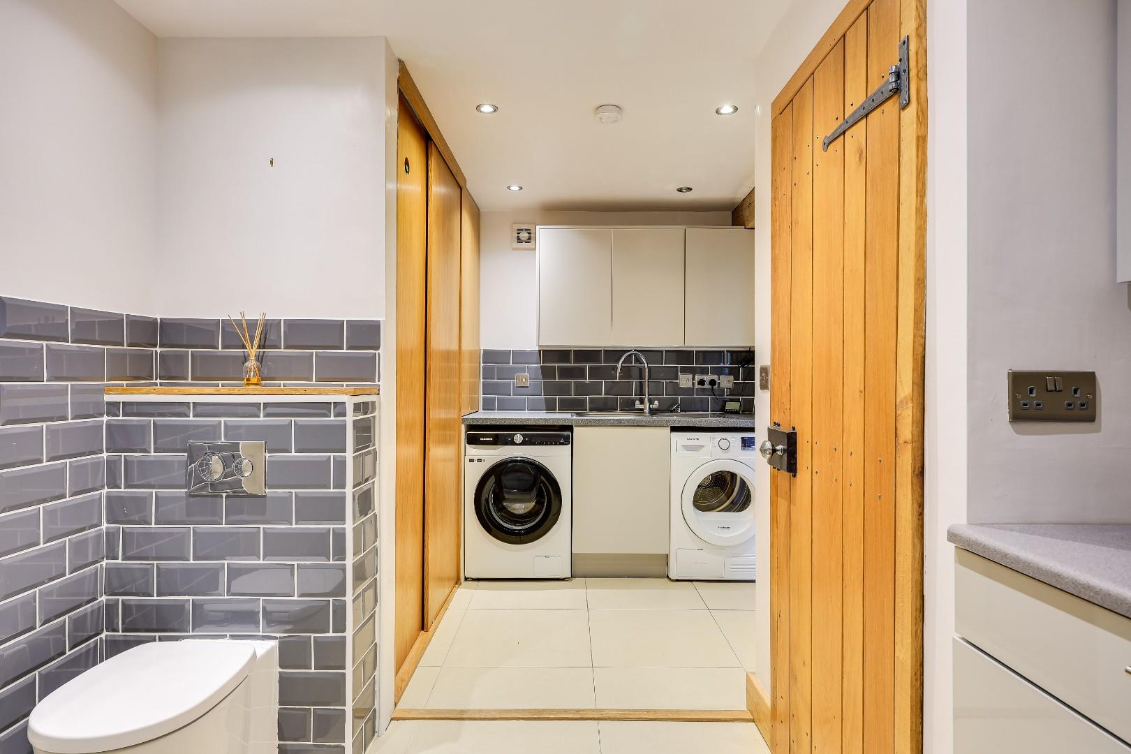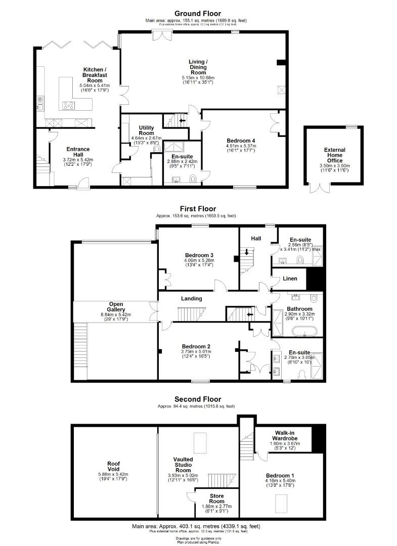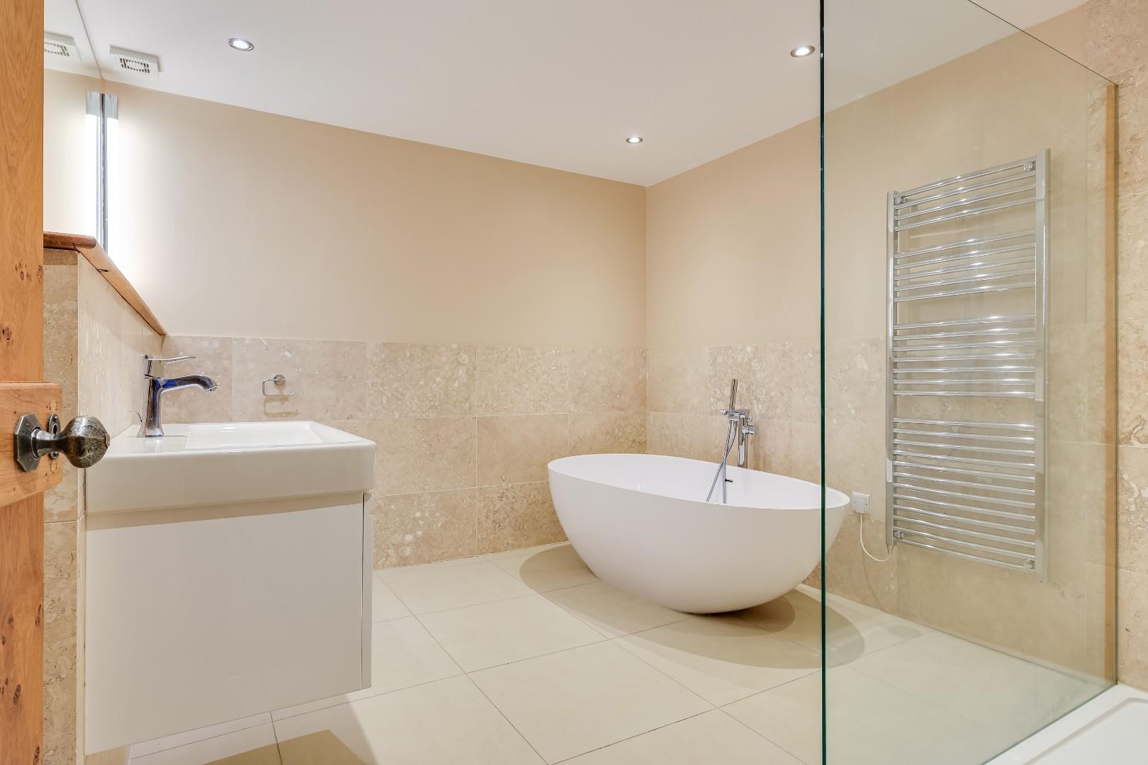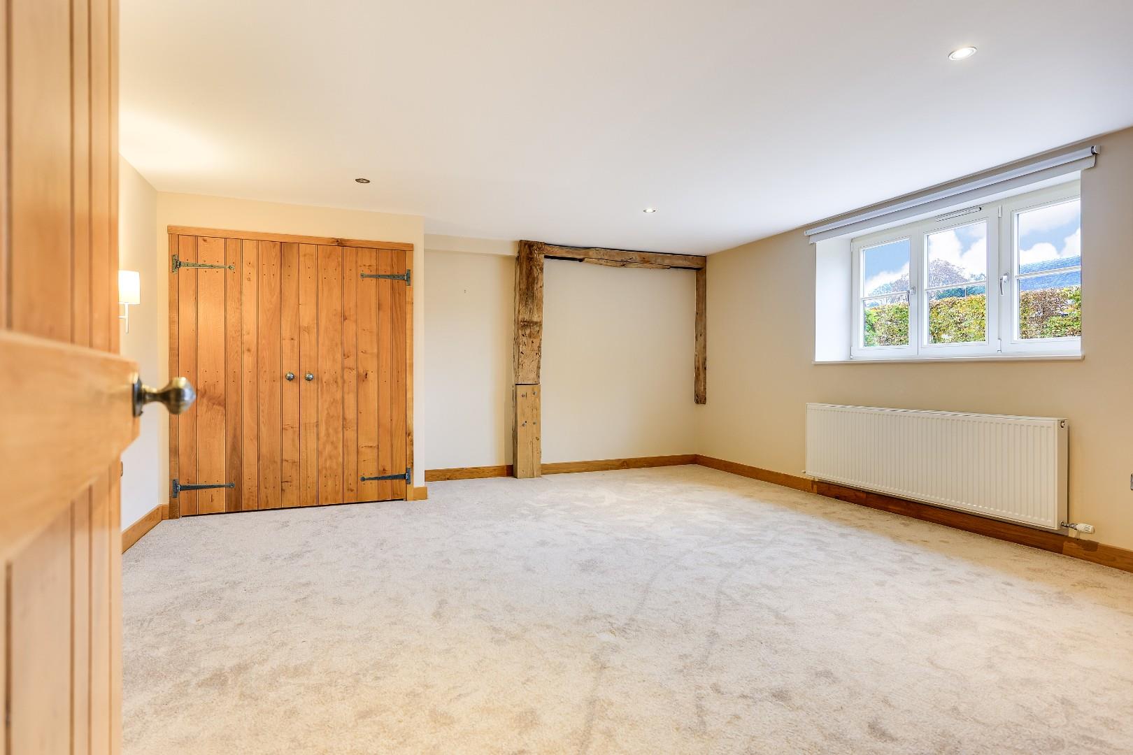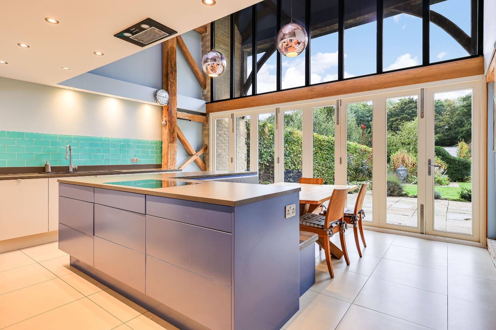 The open-planned living/dining room boasts exposed timbers, French doors to the garden and a feature fireplace housing a wood burning stove. Off the inner hallway is a large bedroom with fitted wardrobes and a luxury en-suite bathroom with walk-in shower. From the inner hallway is a second staircase leading to the first floor. Over the first and second floor, there are four further large double bedrooms and three bathrooms (two en-suite). Bedroom five makes a wonderful office/studio with a glazed elevation which overlook the vaulted area.