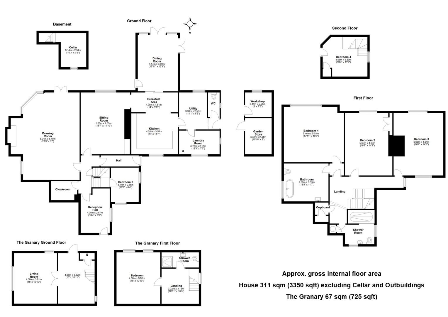 The house offers spacious accommodation of about 3350 sqft, primarily on two floors, with great charm and retains many period features. It was comprehensively updated by the present owners in 2013. It comprises an entrance hall, walk-in cloakroom, magnificent drawing room, sitting room, well-fitted kitchen/breakfast room, which opens onto the dining room. There is a wine cellar, spacious utility room, cloakroom and laundry room. The Granary is about 725 sqft with a reception hall and a sitting room / office on the ground floor, whilst on the first floor there is a landing, shower room and a large bedroom with vaulted ceiling.