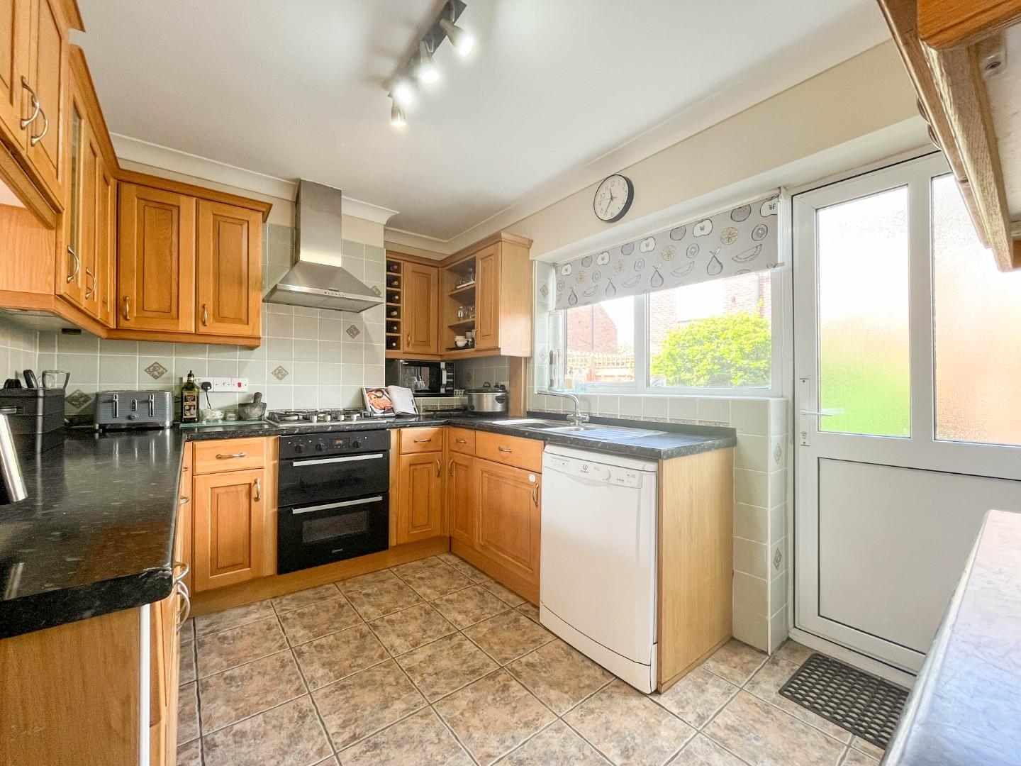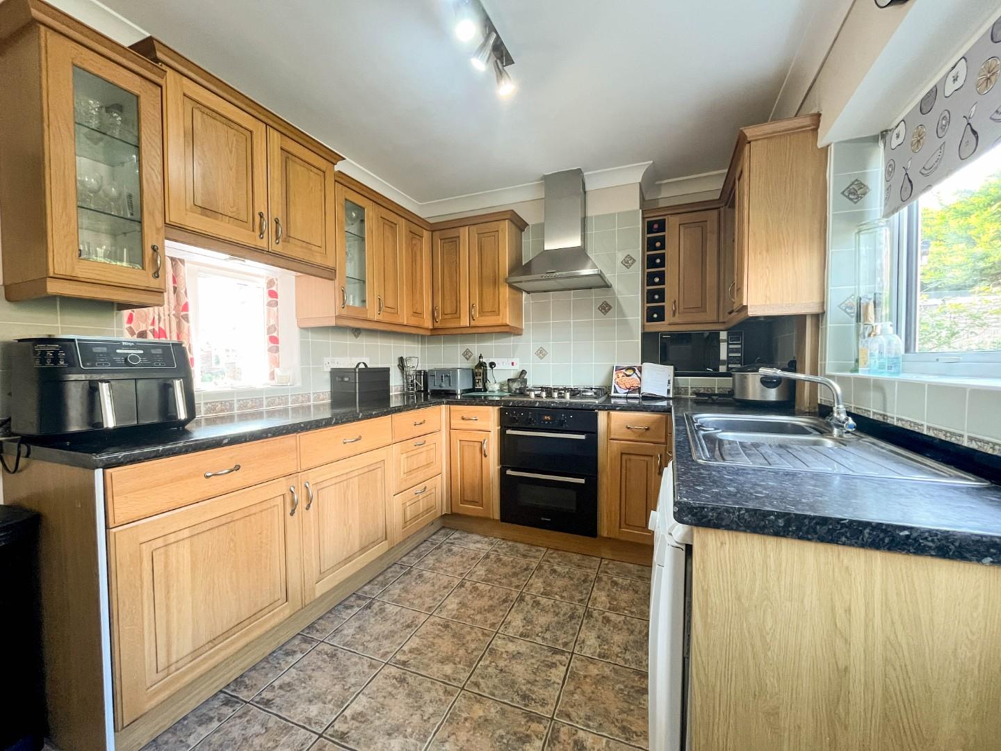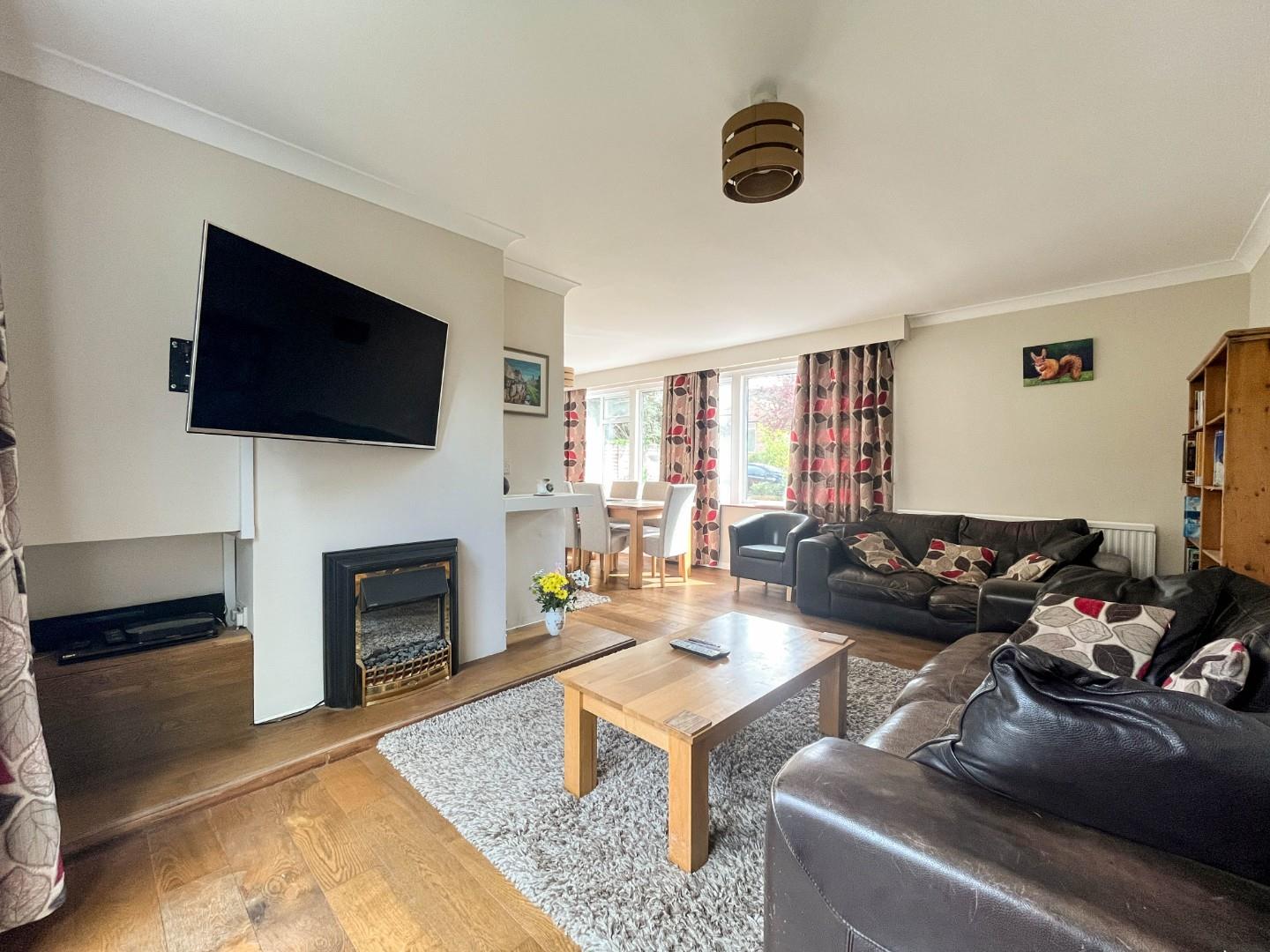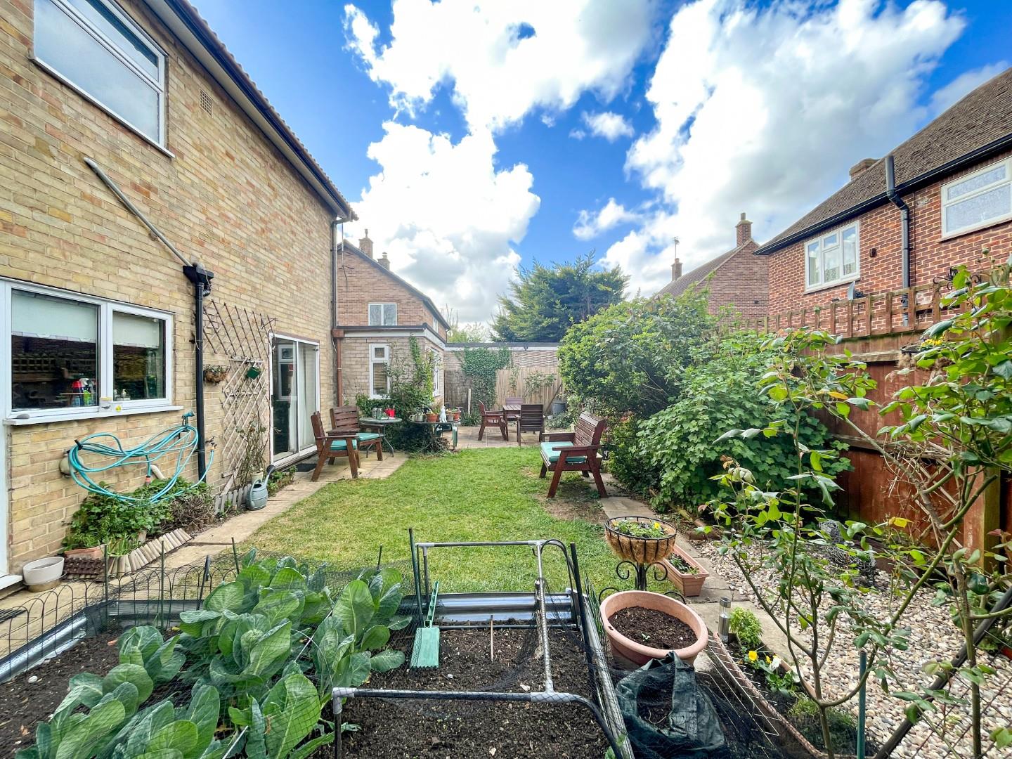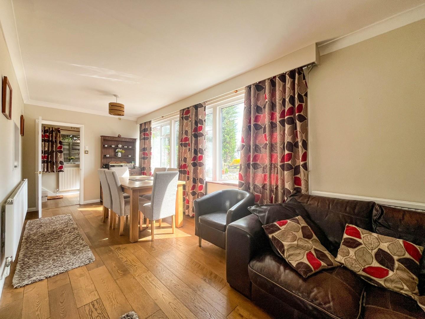 At the front, the property is set back from the road behind a low-level boundary wall and well-tended rockery with a variety of shrubs. The driveway provides off-road parking for a number of vehicles and leads to the garage, which has an up-and-over door. Gated side access leads to the rear garden, which is enclosed via fencing and has a westerly aspect. There is a lawn, patio seating area, vegetable patch and well-planted shrub borders.