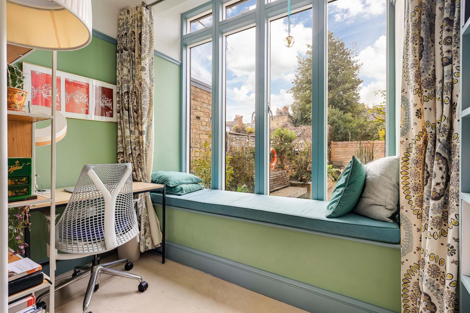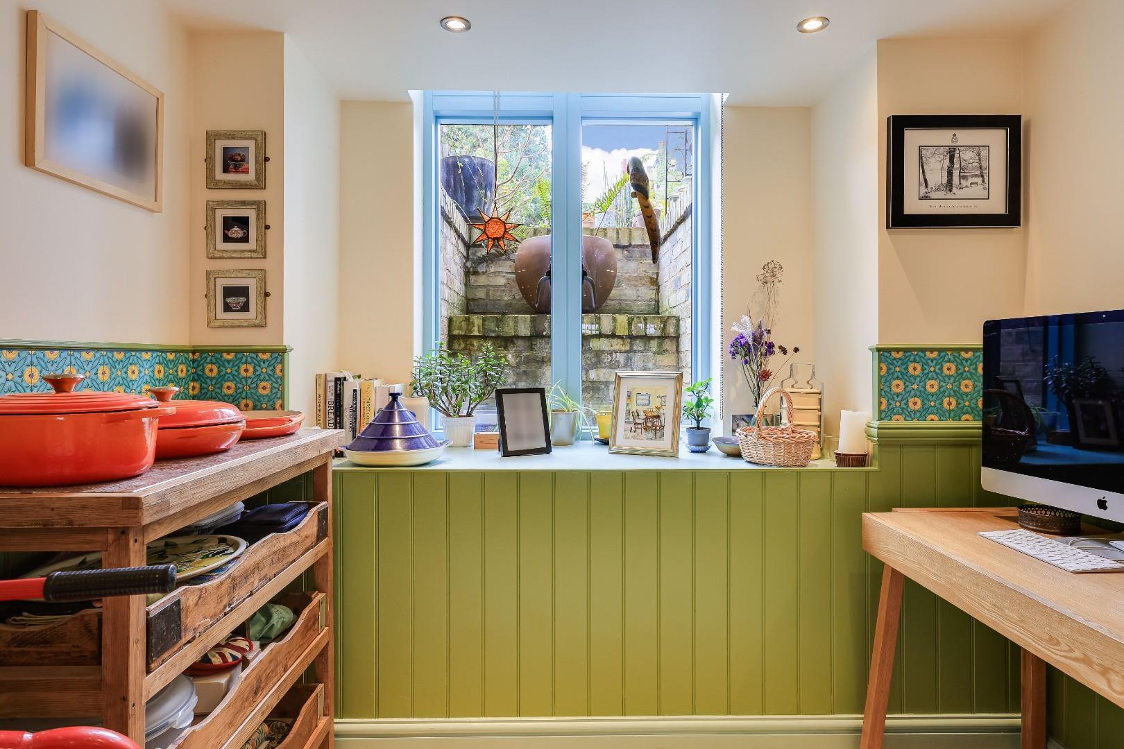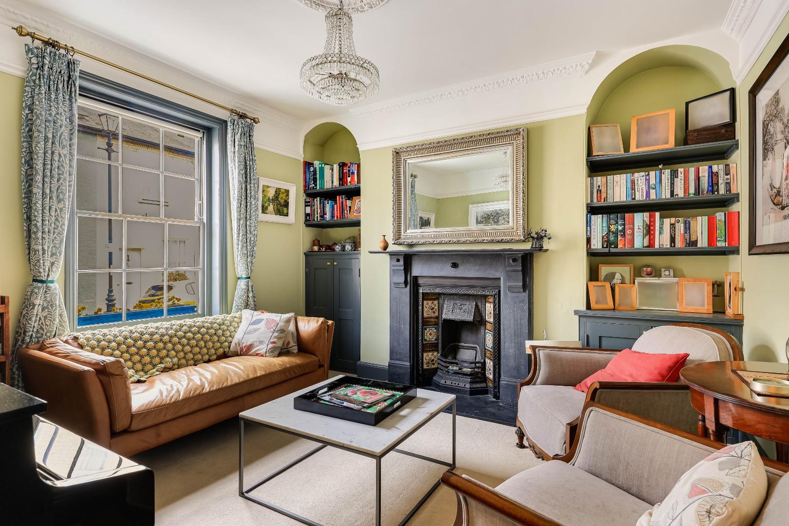 The upper ground floor level provides an entrance hall, a charming and elegant front sitting room with a period fireplace, sash window to front aspect, handmade recess cabinetry and book shelving, and decorative cornicing. The adjoining reception room has a modern finish with floor to ceiling windows and a window seat overlooking the rear garden aspect. A rear lobby and utility room with access to the garden complete this level.