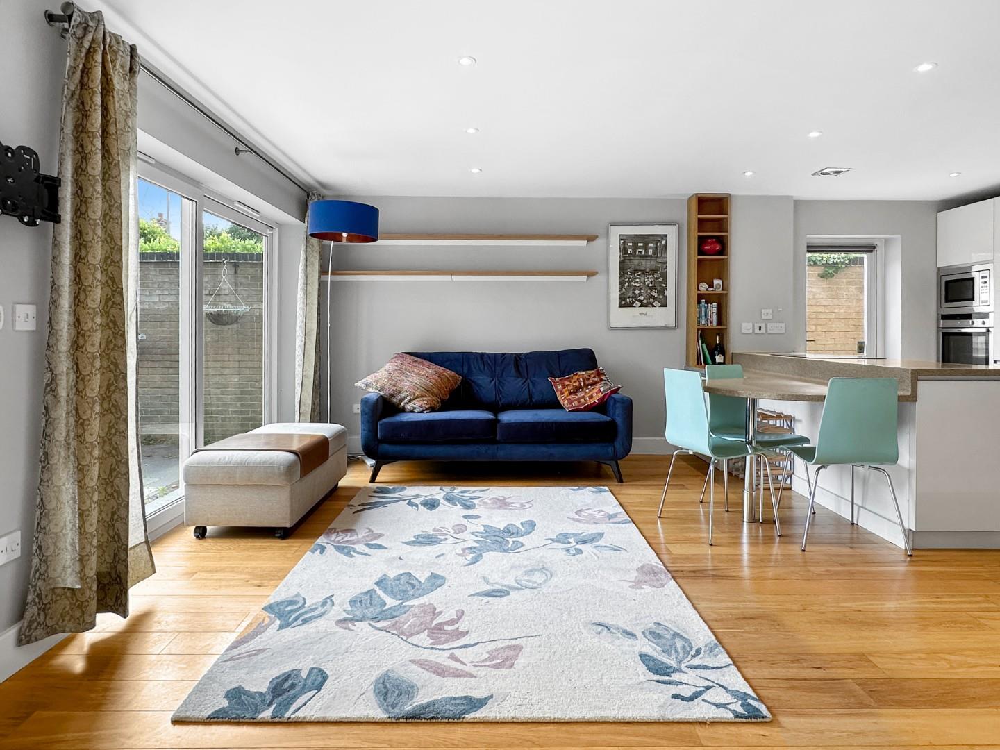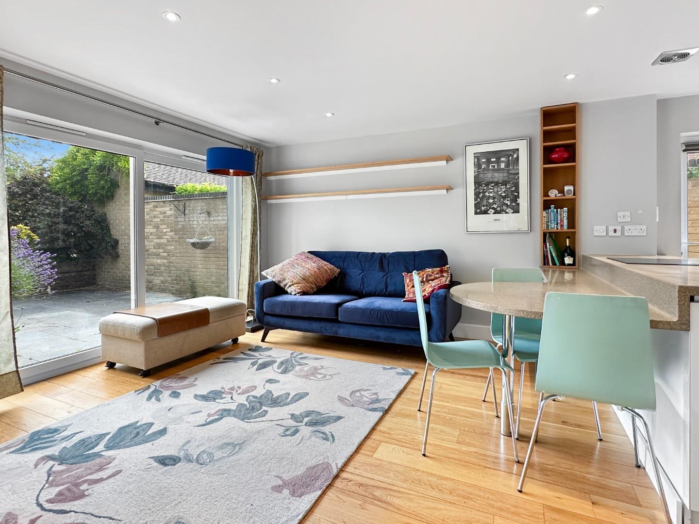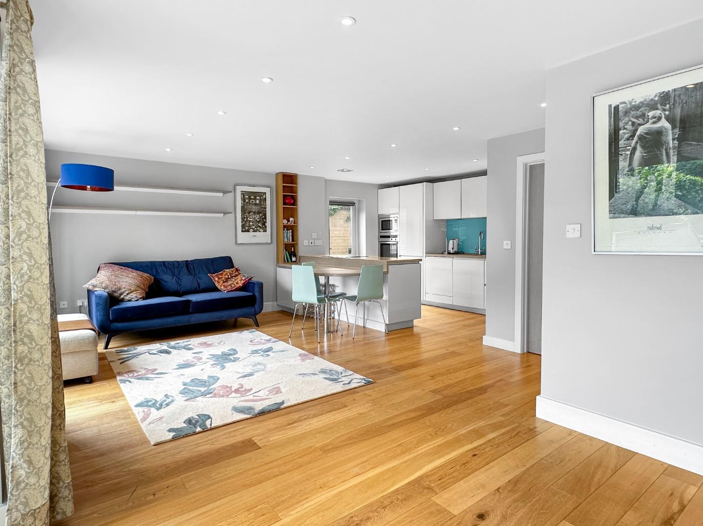 The accommodation extends to 794 sqft in total and comprises an open plan ground floor layout, which enhances space and light and provides a high-quality and well-equipped modern kitchen with Corian working surfaces, breakfast bar with seating and a range of integrated appliances. There is ample space for seating and dining arrangements and a shower room with wash hand basin and a WC. This combined space enjoys access to and complete views of a thoughtfully planted and well-screened courtyard garden and parking area.