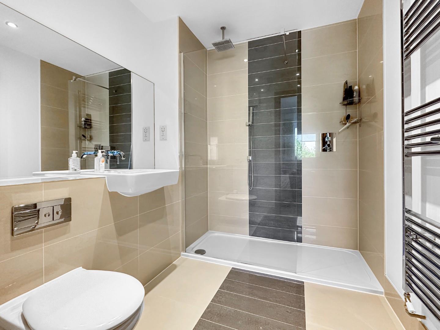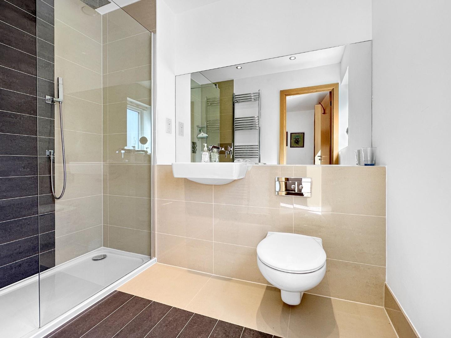 Upstairs, the first-floor landing leads to two spacious double bedrooms, both benefiting from ensuite shower rooms. Bedroom one provides a built-in double wardrobe.