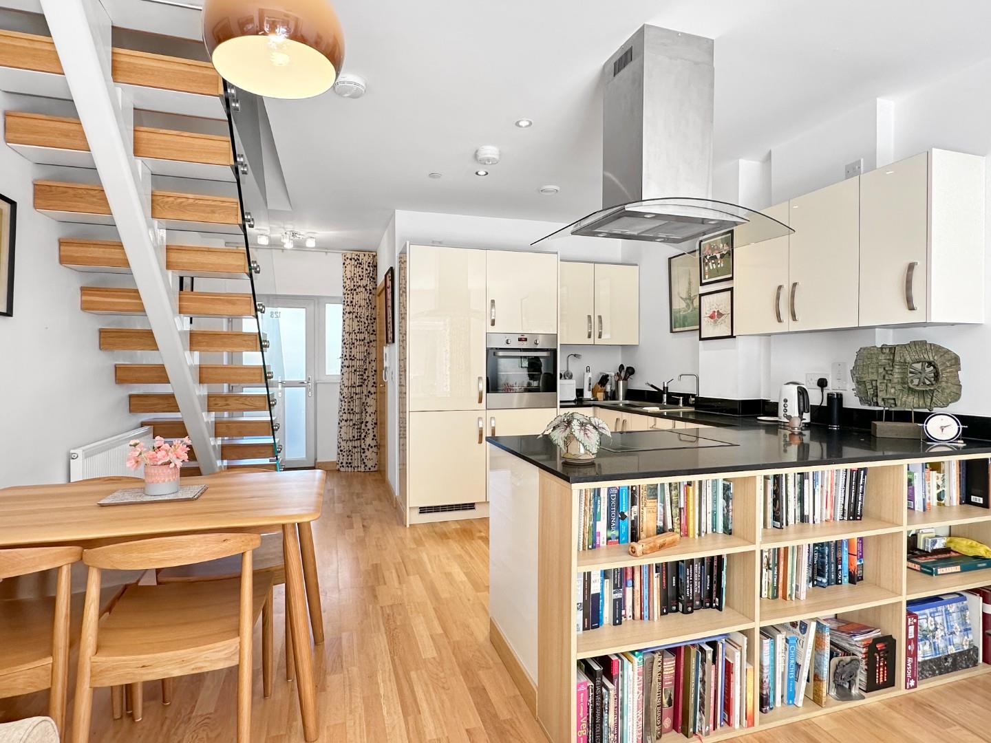 The ground floor level is largely open plan and provides an impressive kitchen/reception area with a feature staircase and wide, glazed sliding doors opening to a private landscaped courtyard garden. The kitchen is well-equipped and provides an extensive range of modern units and drawers with granite working surfaces and a peninsula housing a bespoke bookcase and an induction hob with an extractor fan above. There is a range of further integrated appliances. A reception hall leads to a WC/utility room housing a gas-fired boiler and plumbing for a washing machine.