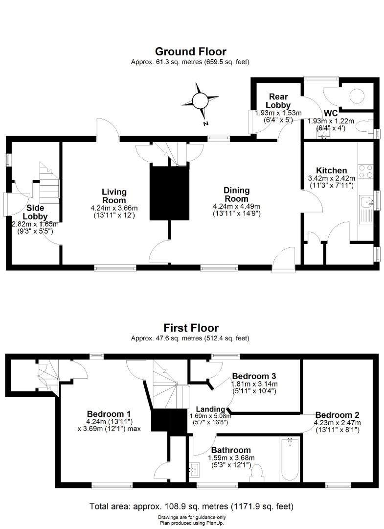 The property comprises a welcoming living room with a large feature fireplace and a separate dining room, also benefiting from an impressive fireplace, creating warm and characterful living spaces. A well-proportioned kitchen is complemented by a useful utility area, along with a boot room and downstairs WC to the rear. Upstairs are three good-sized bedrooms and a family bathroom.