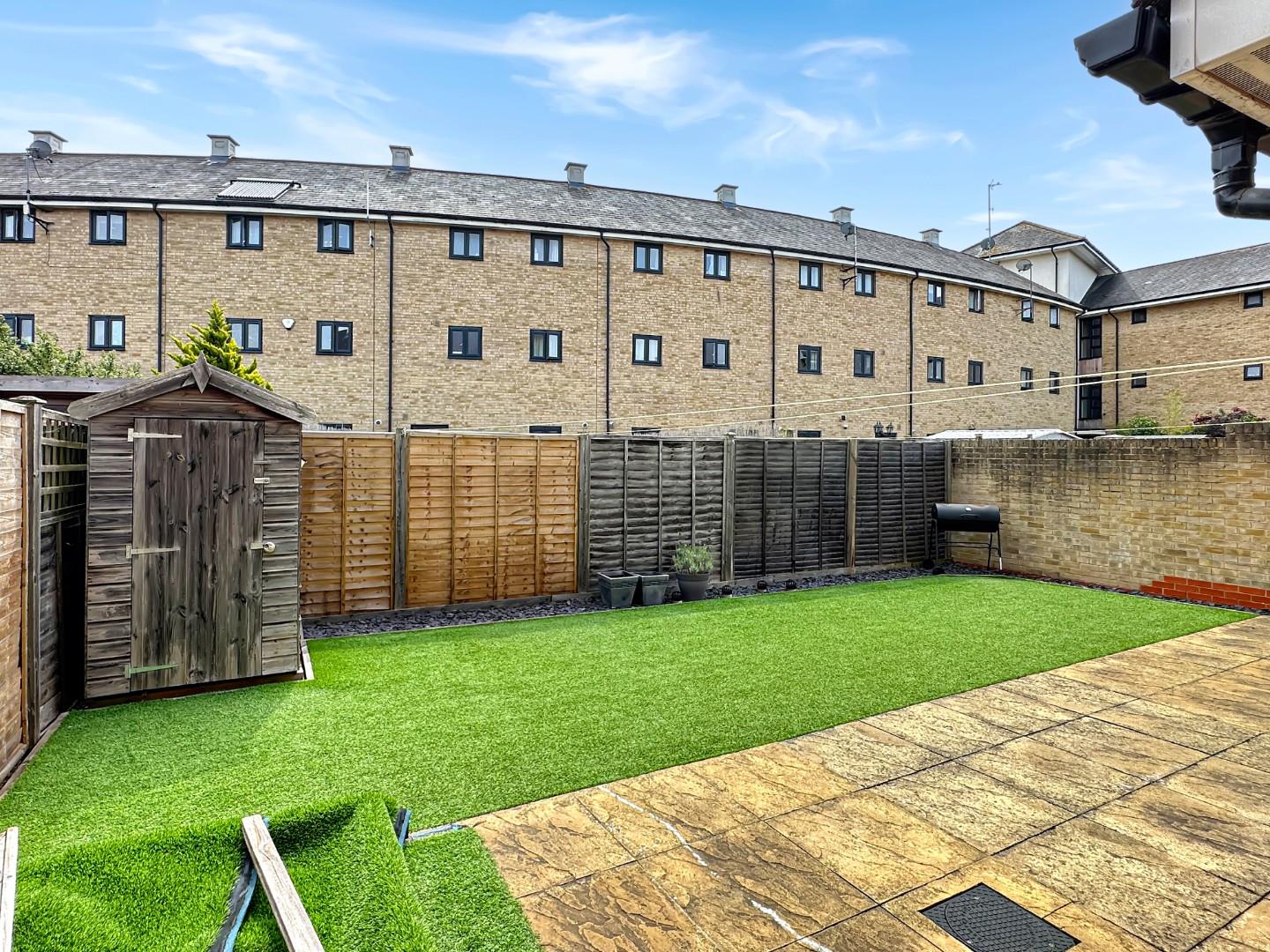Outside, there is a smart, low-maintenance rear garden, which is fully enclosed and includes a lawn area with artificial turf, side borders with slate chippings, timber shed and access to the integral garage, which has power connected.