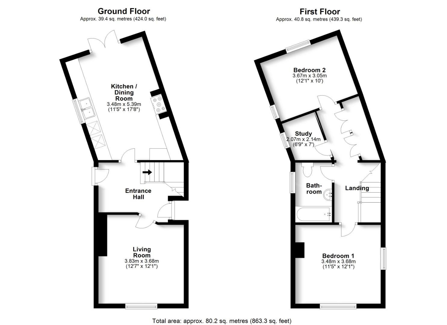 On the first floor, the landing has a hatch providing loft access and plenty of storage courtesy of fitted cupboards, with a further cupboard housing the condensing boiler and hot water tank. There are two generous double bedrooms and a further study
