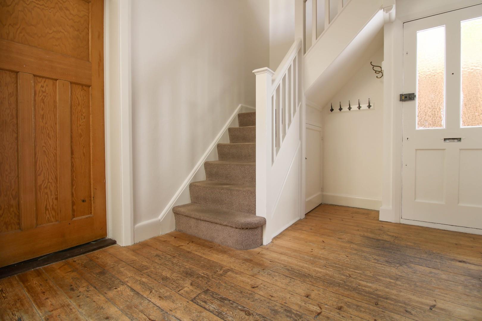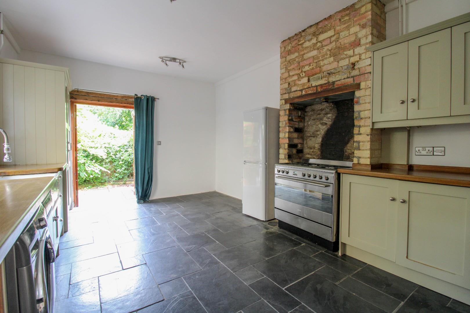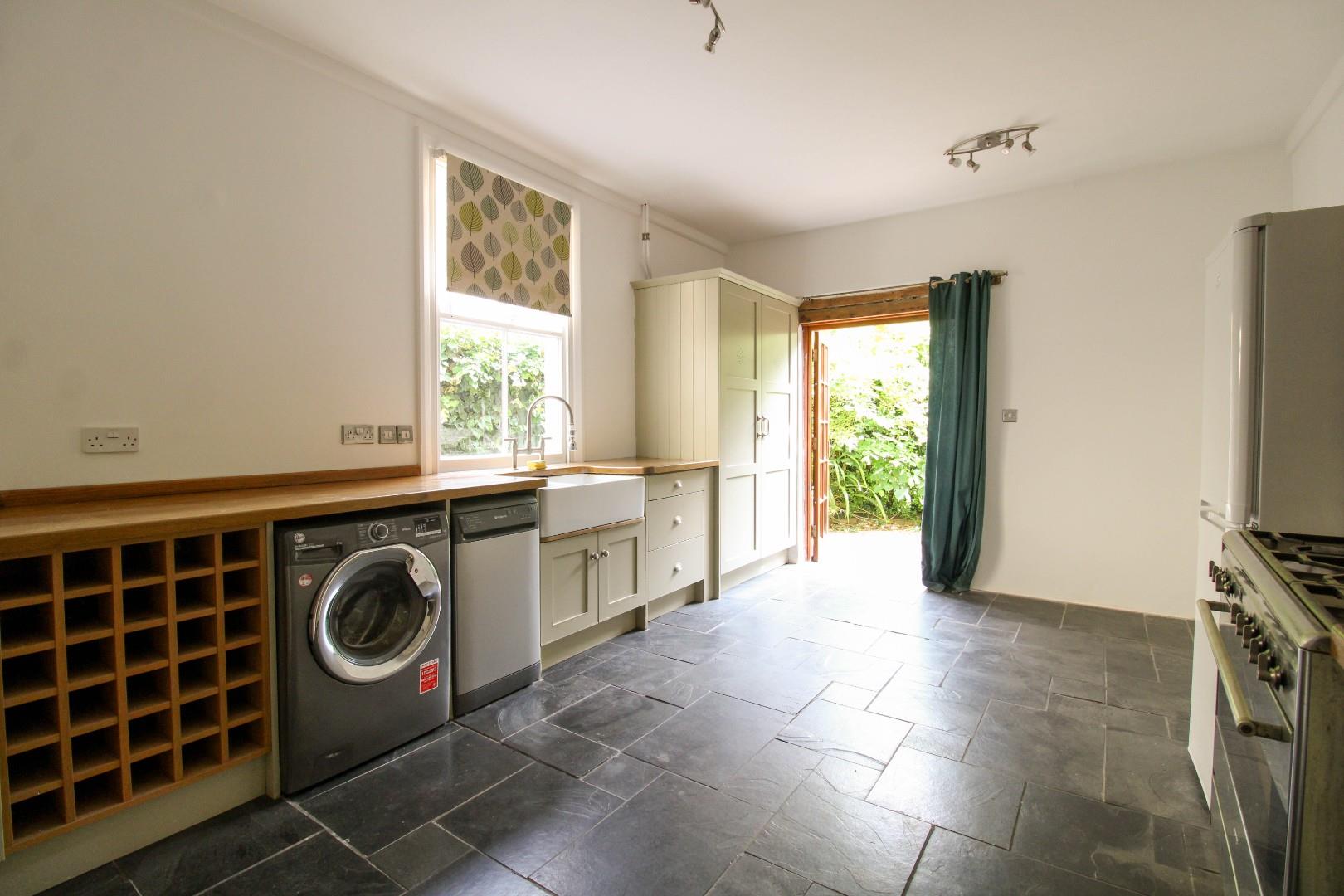 A side doorway opens into the spacious entrance hall, which has stairs to the first floor with storage cupboard under, a door to the side garden and access to the living room, which has a dual aspect and a feature inglenook fireplace (no longer in use). At the rear of the property is the kitchen/dining room, which has a slate tiled floor and is fitted with a well-appointed Shaker-style kitchen. It includes a range of fitted base and wall units, wooden worktops, Belfast sink with mixer tap, wine rack, pantry cupboards, chimney alcove providing space for a range cooker, separate space for fridge/freezer, plumbing for a washing machine and slimline dishwasher, and French doors opening onto the rear courtyard.