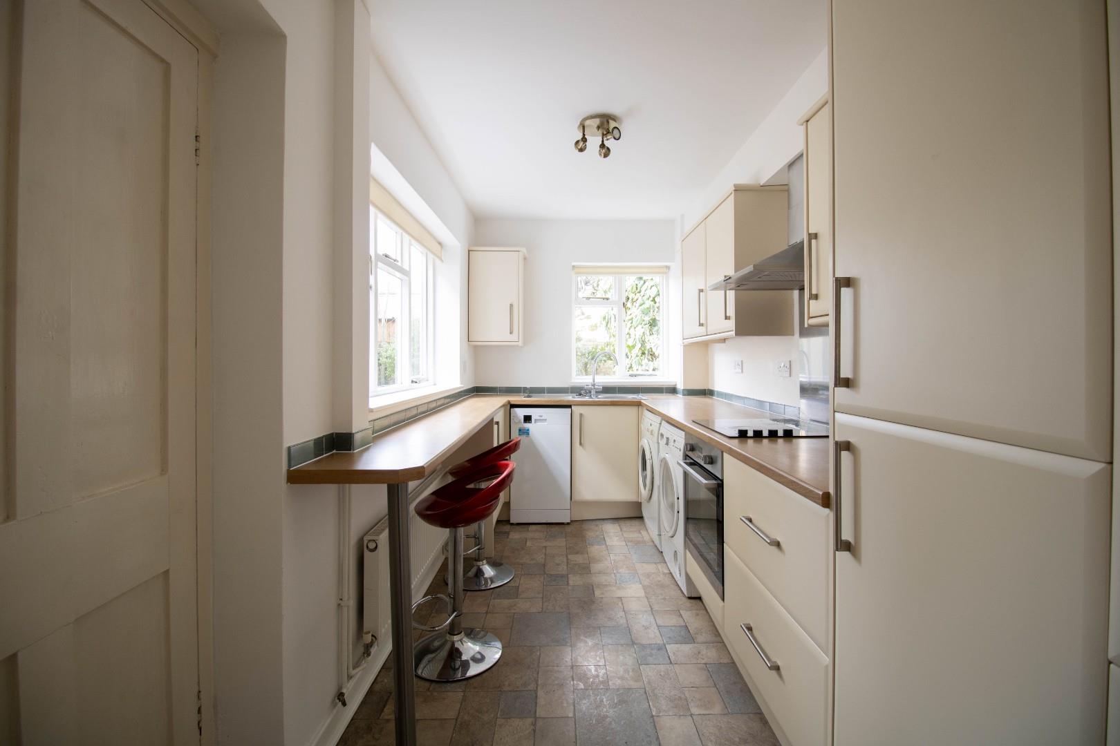 On the ground floor is an open-plan living/dining room with a feature fireplace, built-in cupboards and shelving, finished with original wood flooring. The dining area has an understairs storage cupboard and stairs leading up to the first-floor. The kitchen has been fitted with a range of base and eye-level units and includes a breakfast bar. There are various freestanding and integrated appliances, all of which are included in the sale.