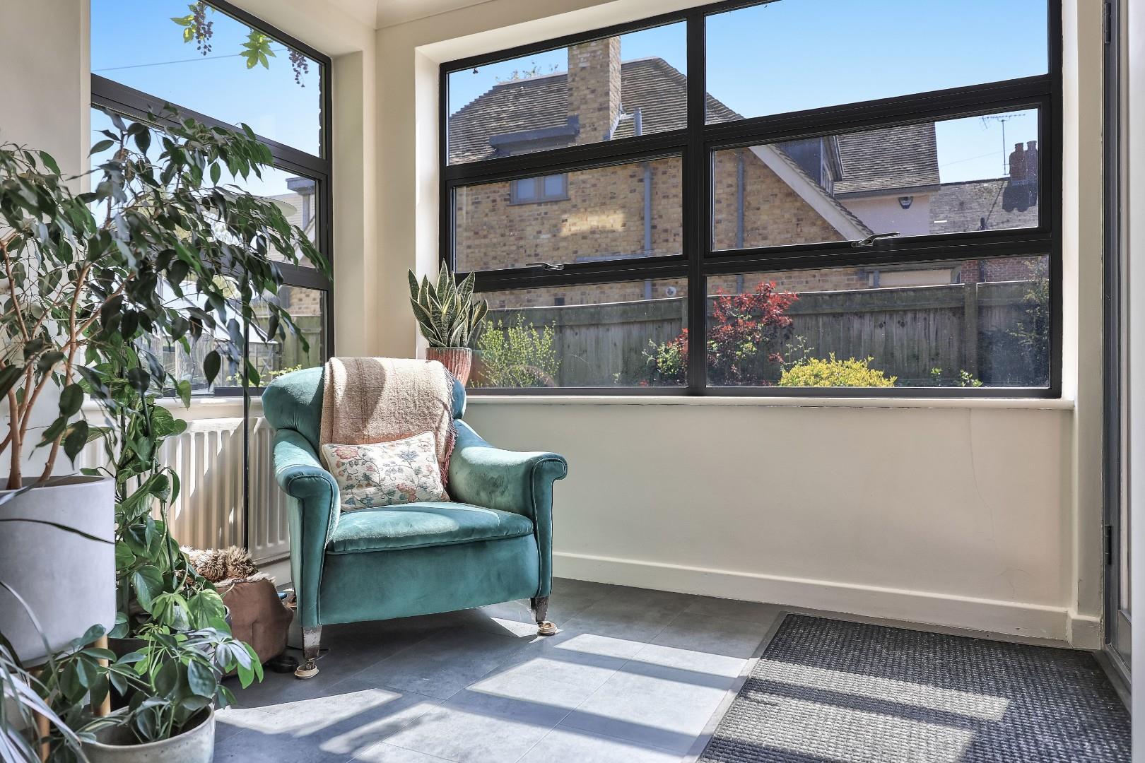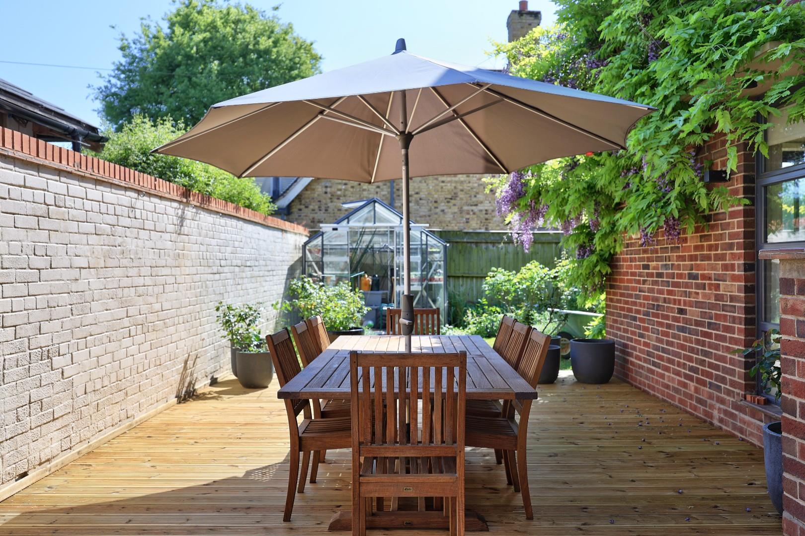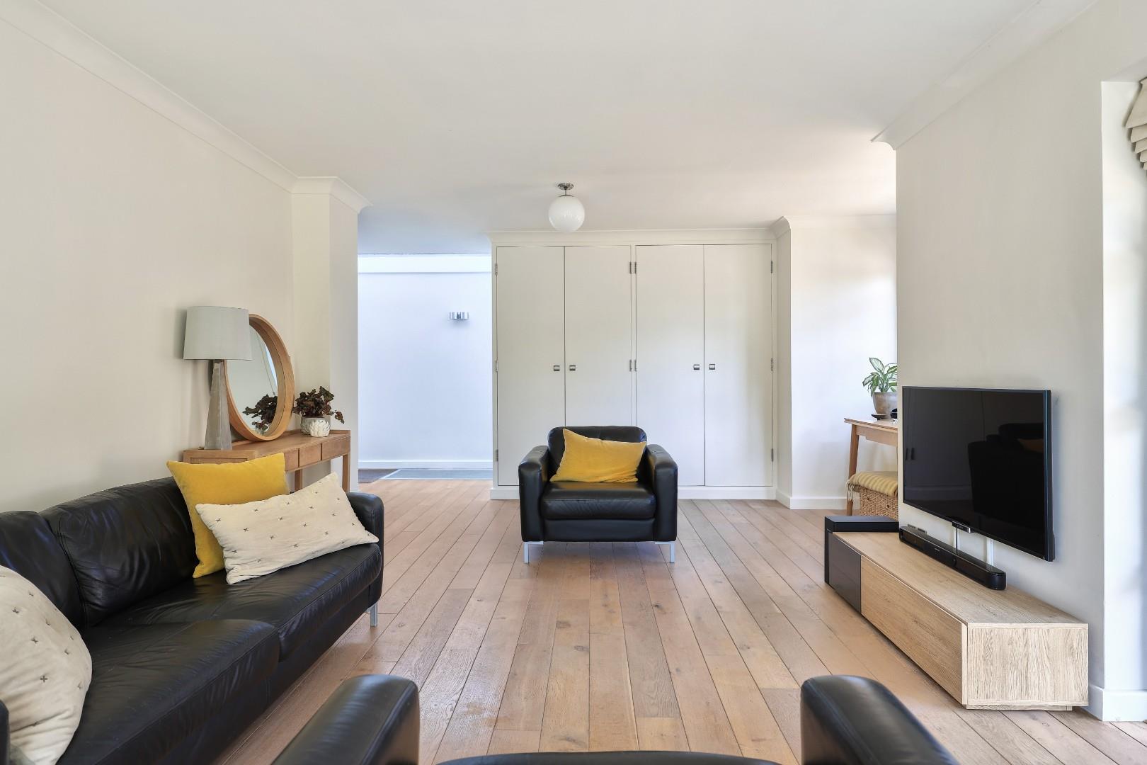 A bright and spacious central reception hall divides two impressive principal reception rooms. A broad, full-depth, dual-aspect kitchen/dining/family room enjoys views to established gardens, provides an extensive and well-equipped kitchen with ample dining space to suit all occasions and a comfortable seating area. The dual aspect sitting room has an attractive solid wood floor and bespoke storage cupboards and access to a patio area via sliding glazed doors. A stylish glazed lobby provides access to the front parking area and leads to a useful utility room and second living room with access to a private decked terrace.