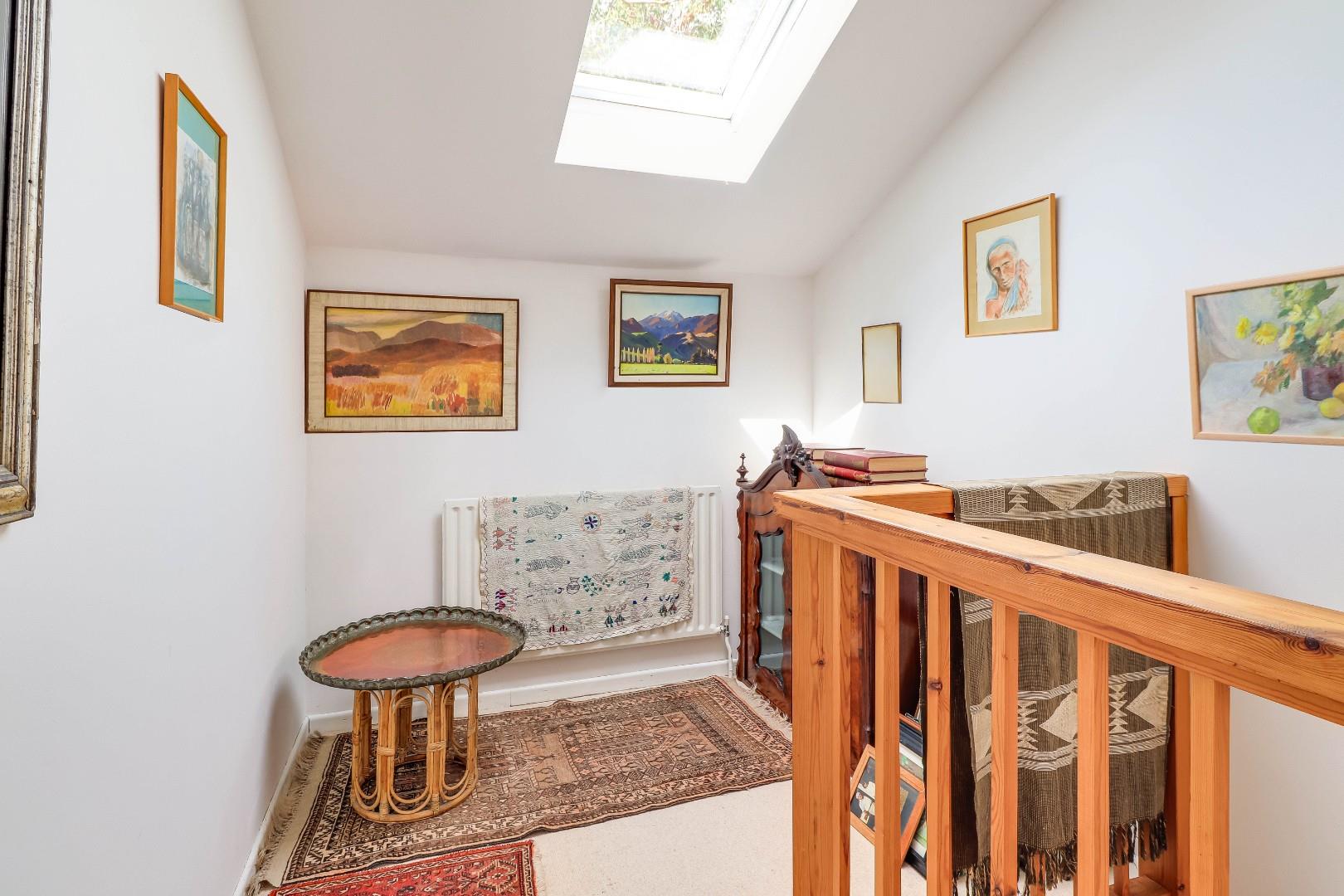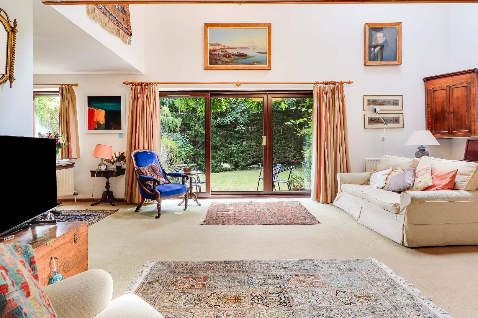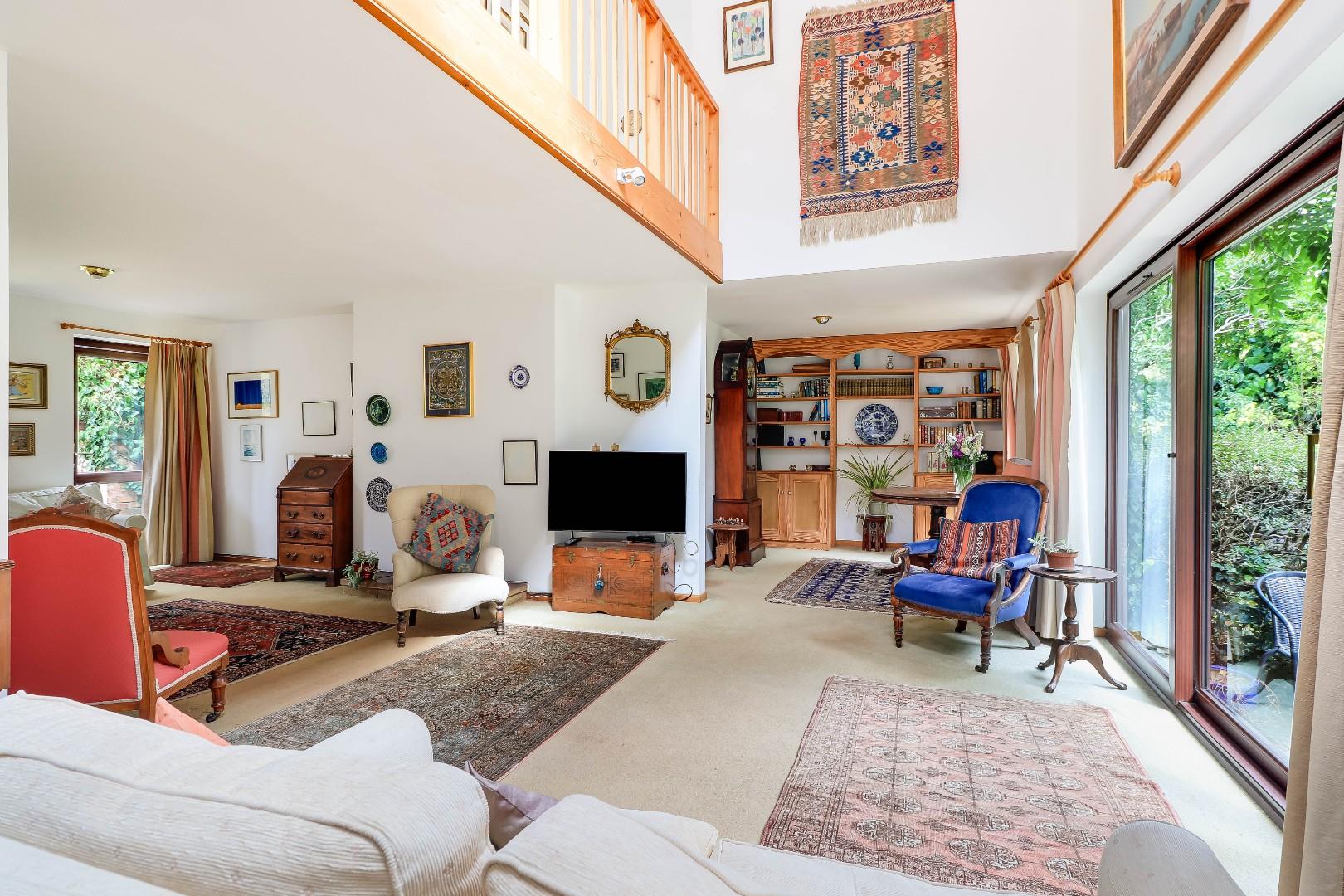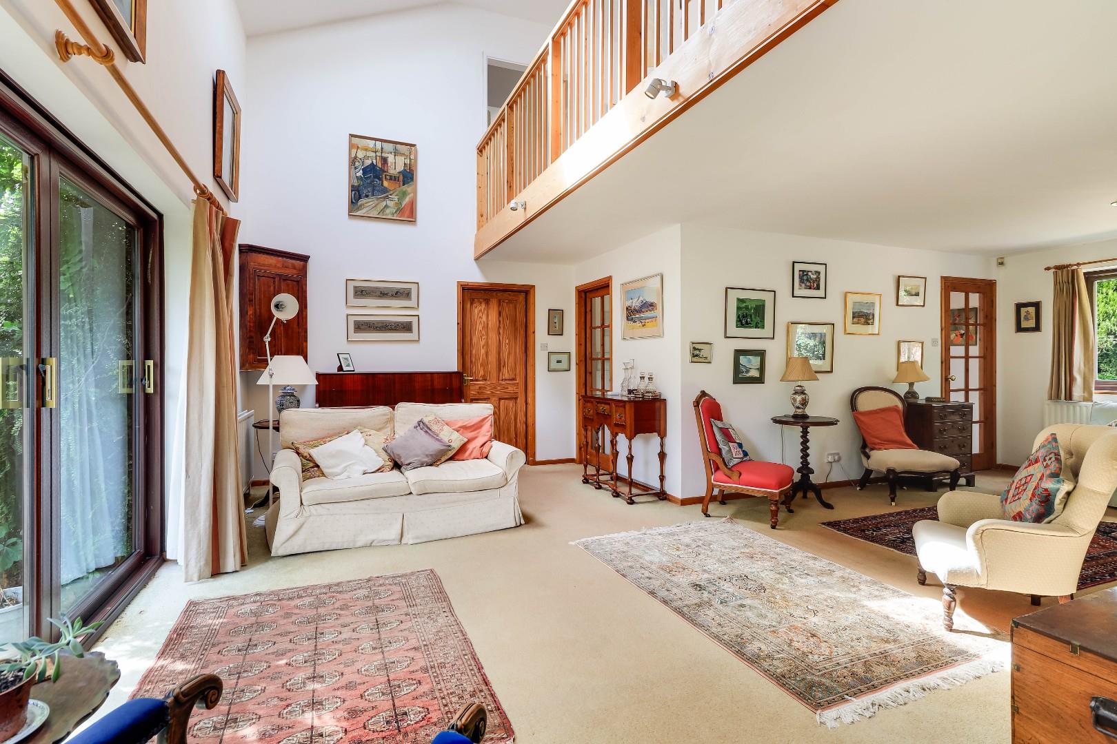 The ground floor accommodation comprises a stunning T-shaped reception room with mezzanine landing area above, an inset working fireplace, vaulted ceilings and extensive glazing to allow lots of natural light and views and access to the garden. There is a formal dining room/snug with attractive parquet floor, a large and well-equipped open-plan kitchen/breakfast room, a utility room and an internal home studio. A light and spacious entrance hall and shower room complete the ground floor level.