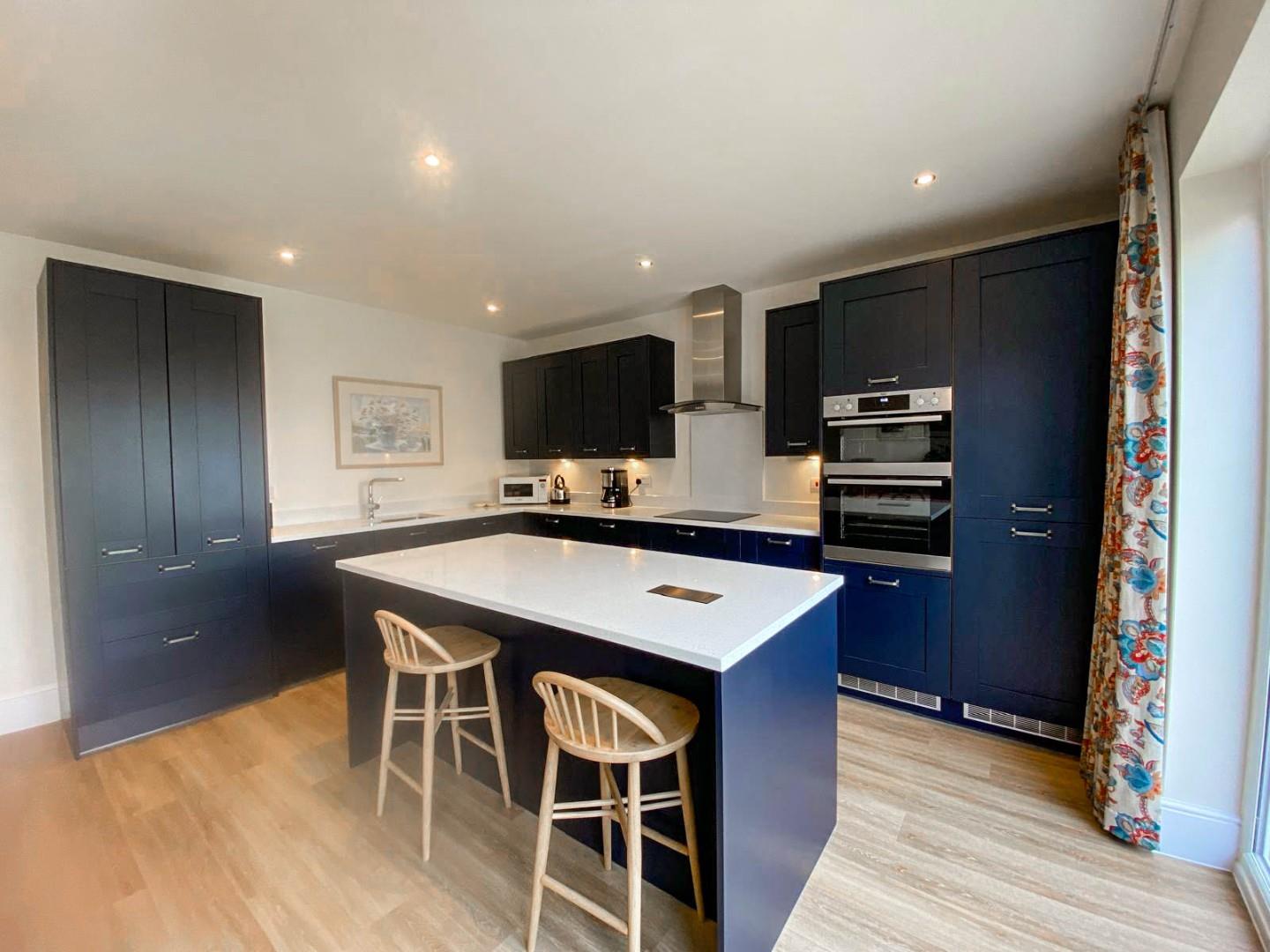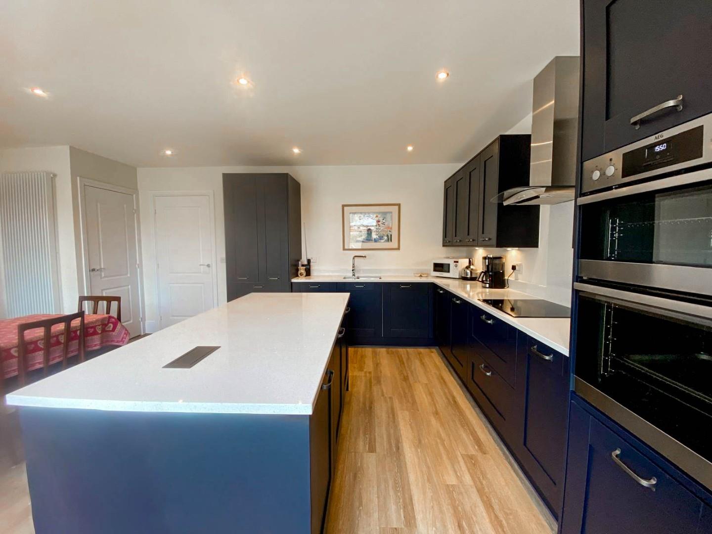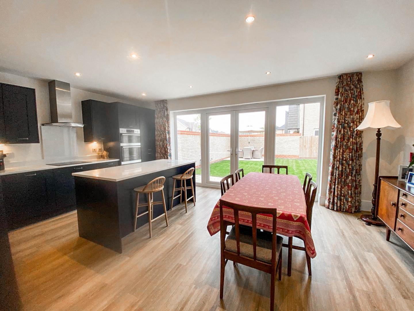 The accommodation comprises a generous and welcoming reception hall with stairs to first floor accommodation, Karndean flooring, under-stairs cupboard and a cloakroom/WC just off. The dual aspect bay-windowed sitting room enjoys views over the neighbouring green space and the wrap-around front garden to the side. The large kitchen/dining/family room has French doors opening onto the garden and is fitted with a range of attractive contemporary cabinetry, ample quartz working surfaces with inset one and a half sink unit with mixer tap and bevel drainer plus a matching central island/breakfast bar, again with a quartz top. There are a range high-end integral appliances and these include: an induction hob, double oven, extractor, fridge/freezer and dishwasher. Furthermore there is a laundry cupboard with space for a washing machine and a tumble drier.