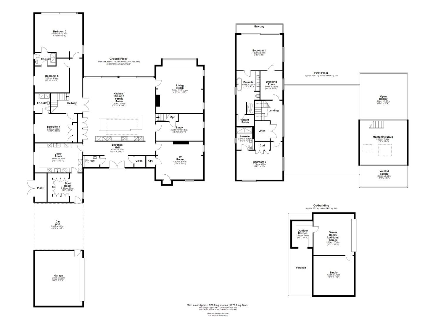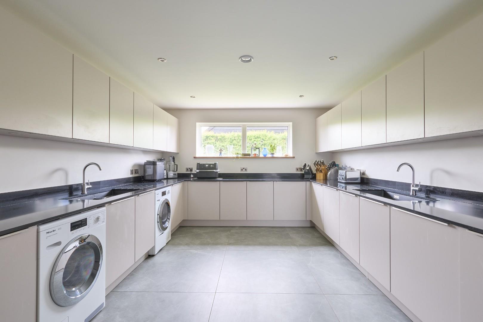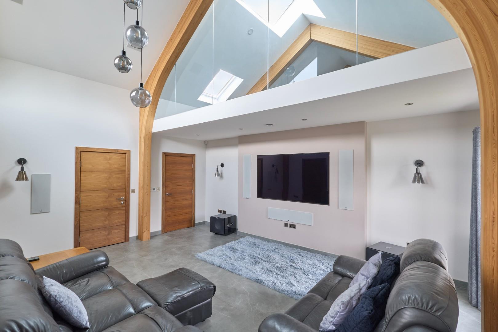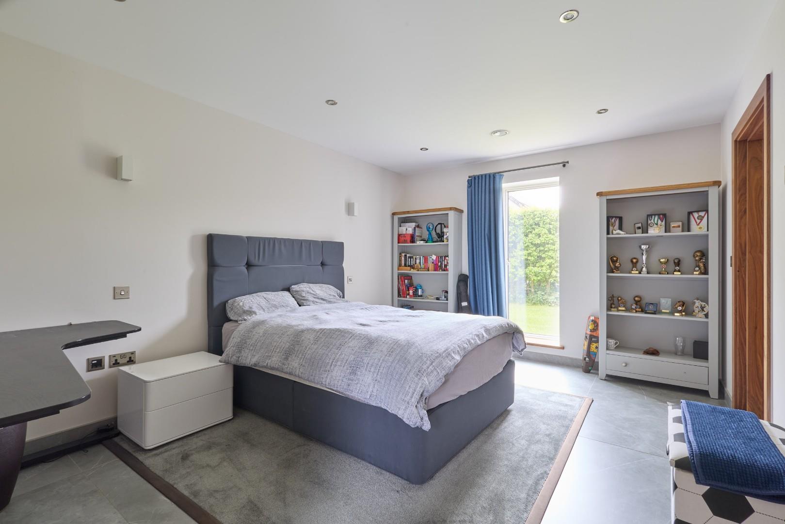 • Architect designed modern house, constructed in 2022 • Impressive reception hall with bespoke Italian marble wall • Spacious open plan kitchen /dining room / family room • Living room • TV room • Study • Mezzanine/snug • Utility room/second kitchen • Boot room • Principal suite with walk-through dressing room and luxury ensuite with steam room • 4 further en-suites bedrooms • Detached outbuilding/games room, with sound proof studio and covered outdoor kitchen • Car port • Double garage • Air source underfloor heating • Triple glazing windows and doors • CAT 5 wiring