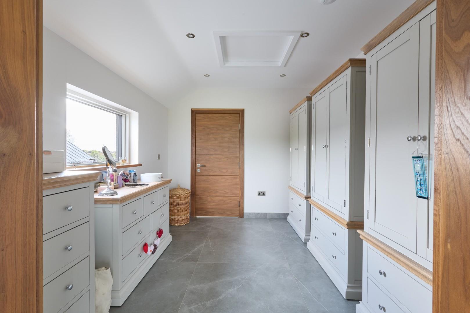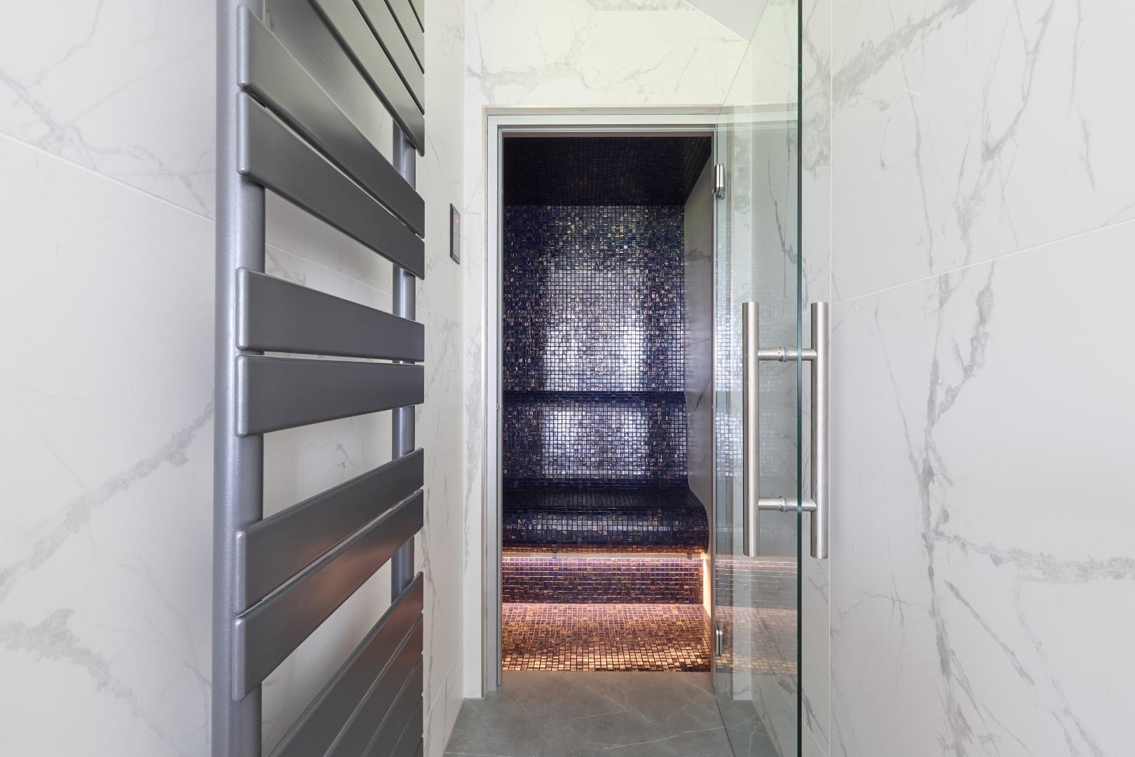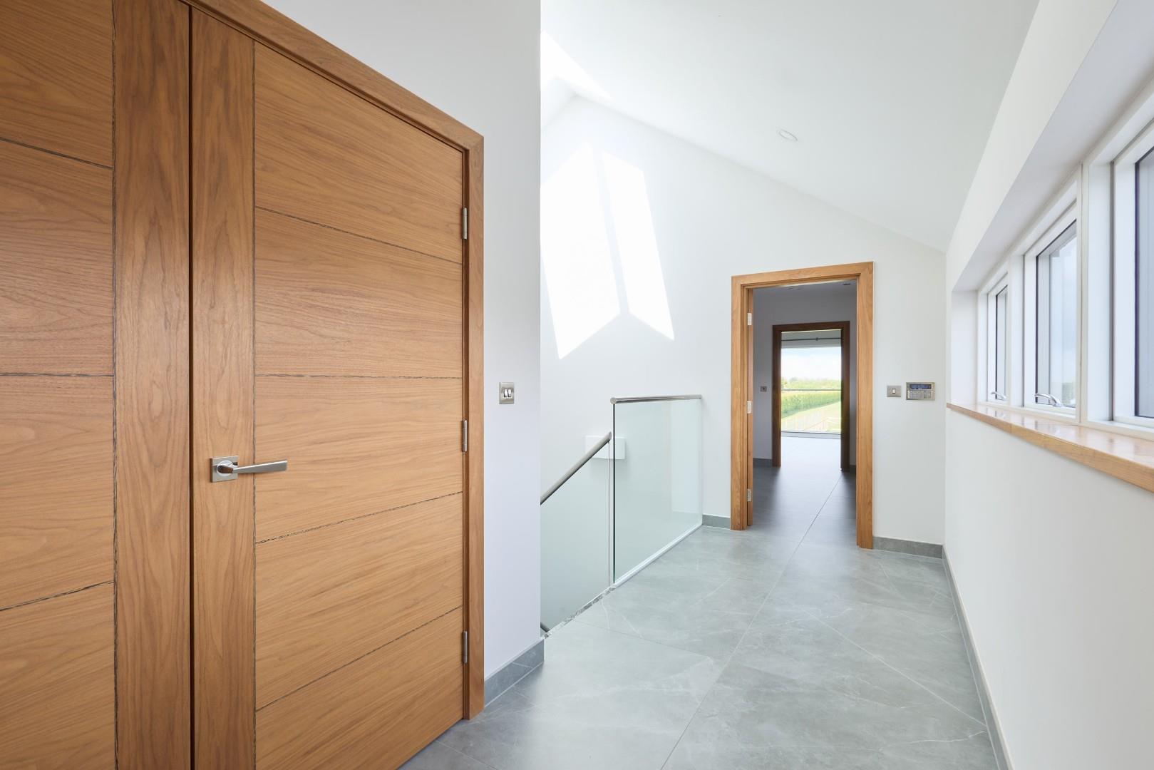 The bedroom wing with an inner hall comprises three generous double en-suite bedrooms on the ground floor, with bespoke staircase leading the landing where there are a further two en-suite bedrooms, to include the principal bedroom with a balcony and beautiful views over the gardens, a bespoke dressing area and a large walk-in, luxuriously appointed ensuite bathroom with a steam room.