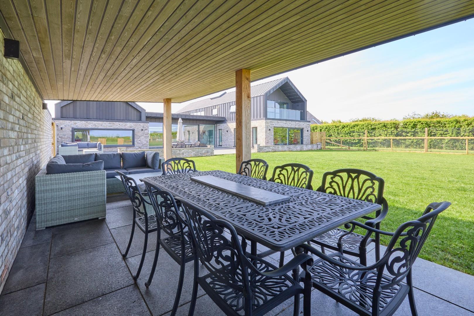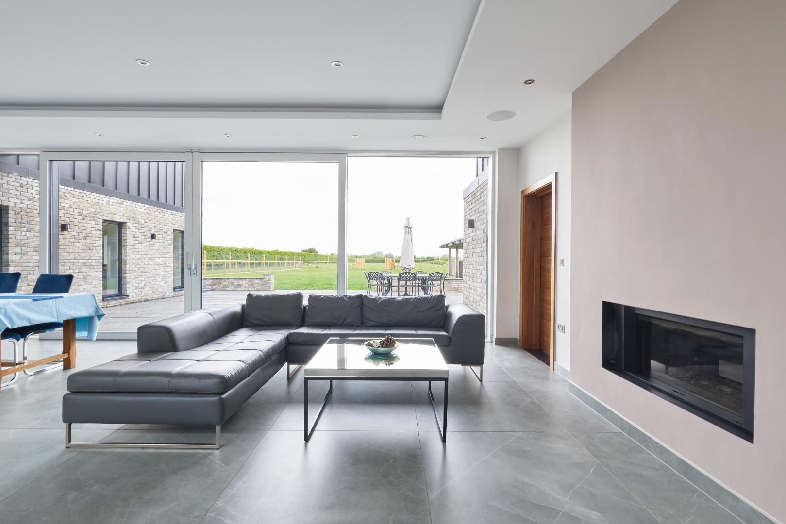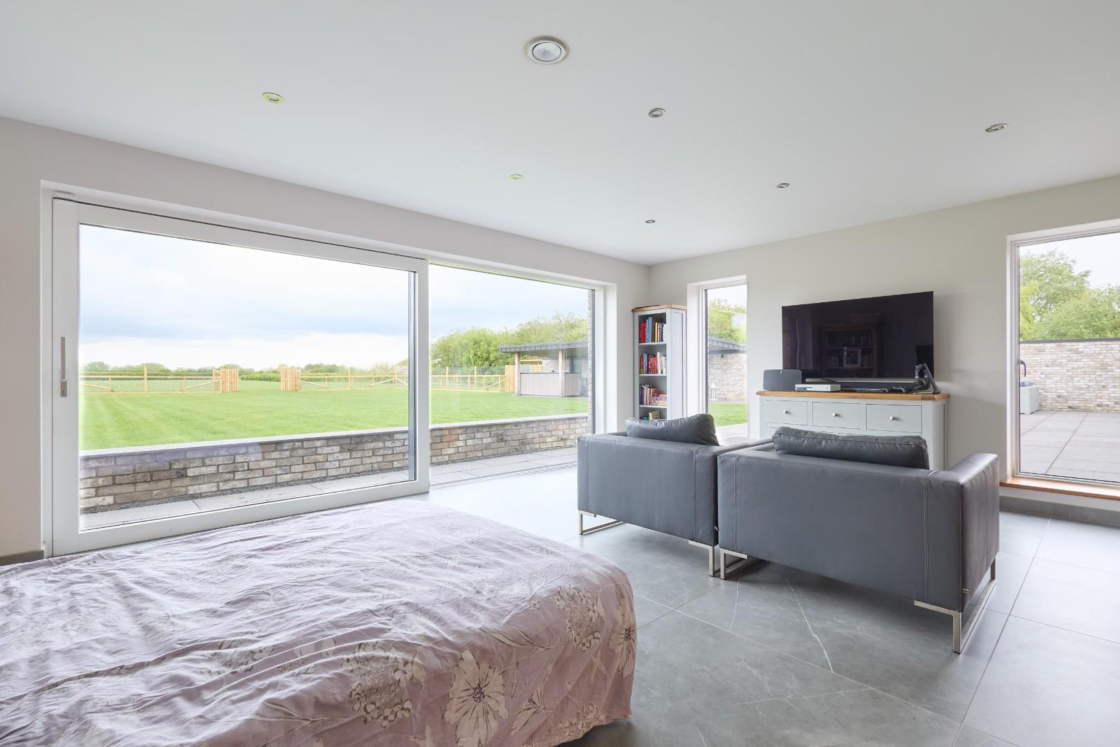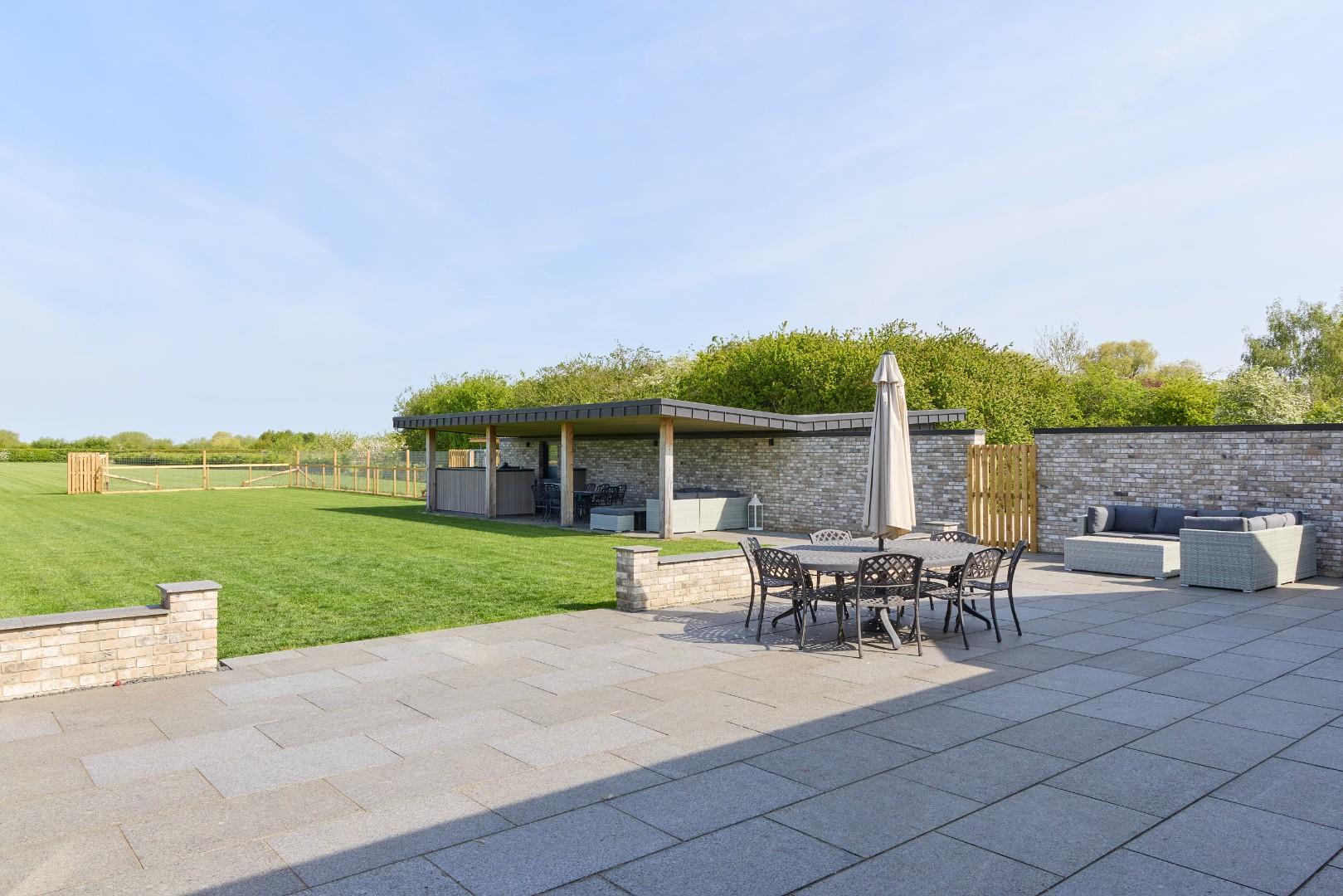 A stunning and beautifully presented contemporary village home, built to a high specification by the current owners, providing spacious and versatile accommodation on two floors. The property enjoys a rural setting on the edge of the village and backing onto farmland with an RSPB Nature Reserve and lakes beyond. The property is located on a no-through road and set back with a large gravel driveway. The bespoke front door leads to the generous reception hall with a feature Italian Marble wall and a large glass roof light over. The bright and spacious hall leads through to the impressive 29'9" x 25'11" open plan kitchen/dining/family room, which is a true centre to the home, with a 25' wide full height sliding glazed wall opening to the rear terrace and gardens beyond, creating an amazing entertaining space. The kitchen is fitted with high quality German Ballerina handleless units, integrated appliances and Granite/Corian worksurfaces and splashback. There is also a 19'7" x 12'1" utility room/second kitchen. Doors lead from the open plan entertaining space to the separate living room, with contemporary double-sided 'Stuv' wood burning stove and a feature box window seat. There is a further TV room with fully automated Dolby Atmos wiring; a separate study/home office and a first floor mezzanine/snug with glazed walls and gallery.