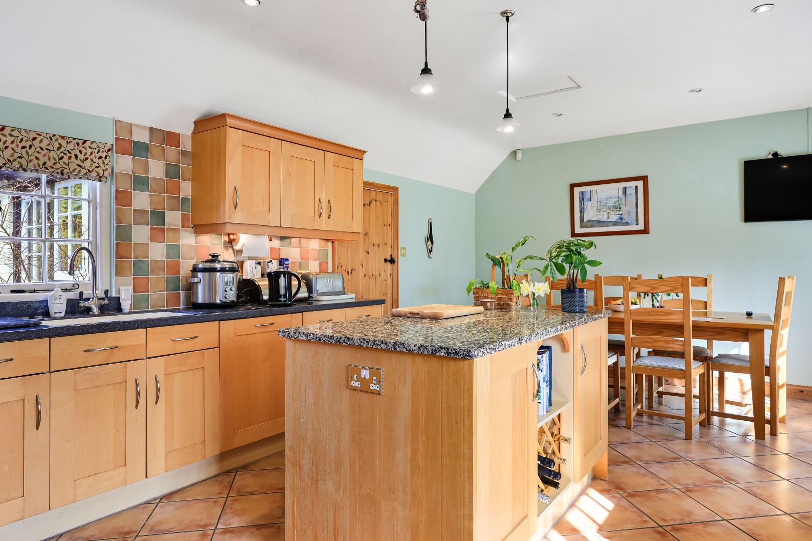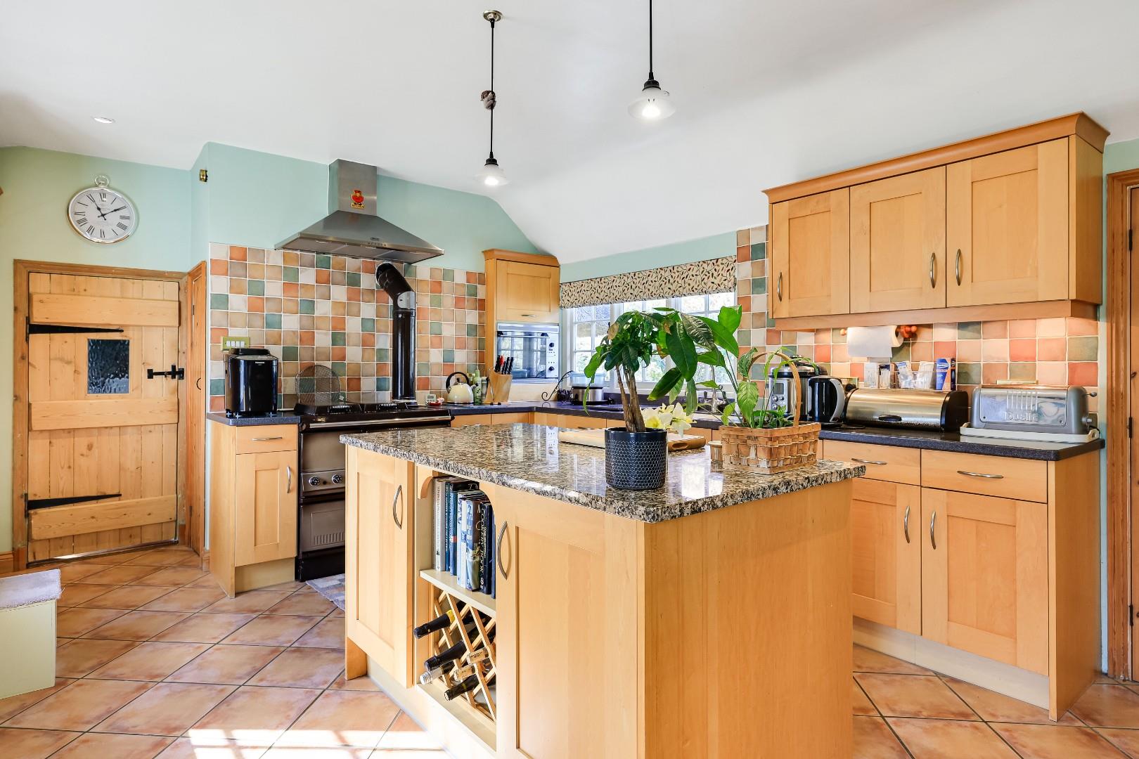 The accommodation comprises an entrance porch to a reception hall area with parquet flooring and fixed book shelving. This opens to a dual aspect dining room with feature fireplace and parquet flooring. The sitting room is also dual aspect with a beautiful inglenook fireplace with inset wood burning stove and a wealth of exposed timbers. This steps up to a snug area with feature fireplace with inset gas stove and exposed timbers. The kitchen/breakfast room is a generous family space, fitted with attractive cabinetry, ample Corian work surfaces, with inset double sink unit with mixer tap and drainer, a central preparation island with a granite top and cupboards below, an oil fired Stanley range style cooker which also provides heating and hot water as well as cooker. Furthermore, there is a two ring ceramic hob, combination oven and extractor, ceramic tile flooring and a fitted window seat. Just off is a handy utility/boot room with a cupboard housing a washing machine and tumble dryer and leading to the family bathroom, plus a door to outside. There is a large ground floor master bedroom beyond with fitted wardrobe cupboards and an en suite shower room.