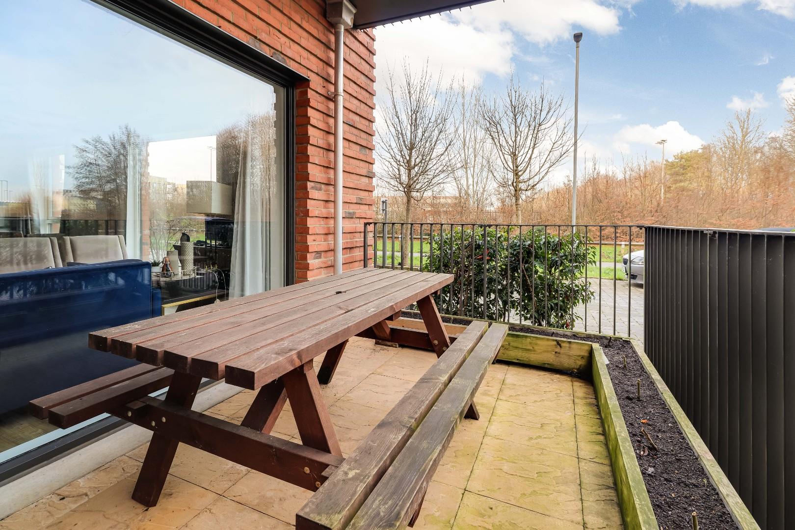 The spacious open-plan kitchen/living/dining area is flooded with natural light, courtesy of a large window and a door leading to the generously sized, covered terrace. The stylish kitchen features a range of modern base and wall-mounted units, an integrated fridge/freezer, electric oven, induction hob, dishwasher and a washing machine.