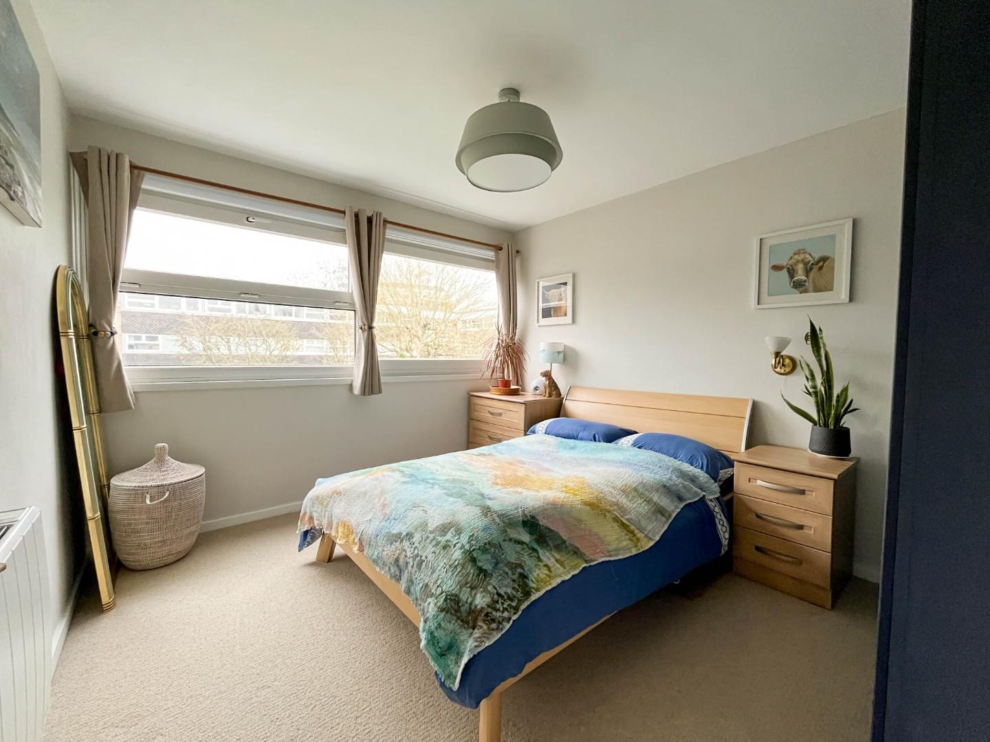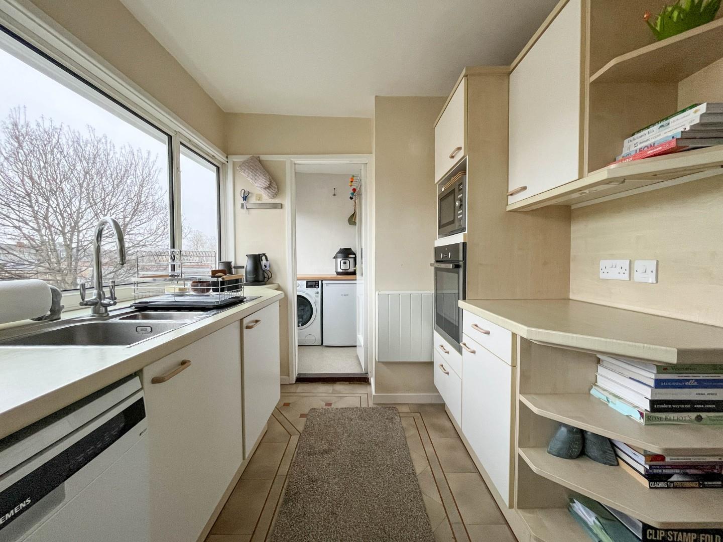 On the second floor, there is an impressive living/dining room, which is spacious, bright and airy and has access to a southeasterly balcony overlooking the communal gardens. Off the living space, the kitchen has a range of fitted base and wall units, an integrated oven and electric hob, plumbing for a dishwasher and access to a utility room, which has plumbing for a washing machine and space for further appliances.