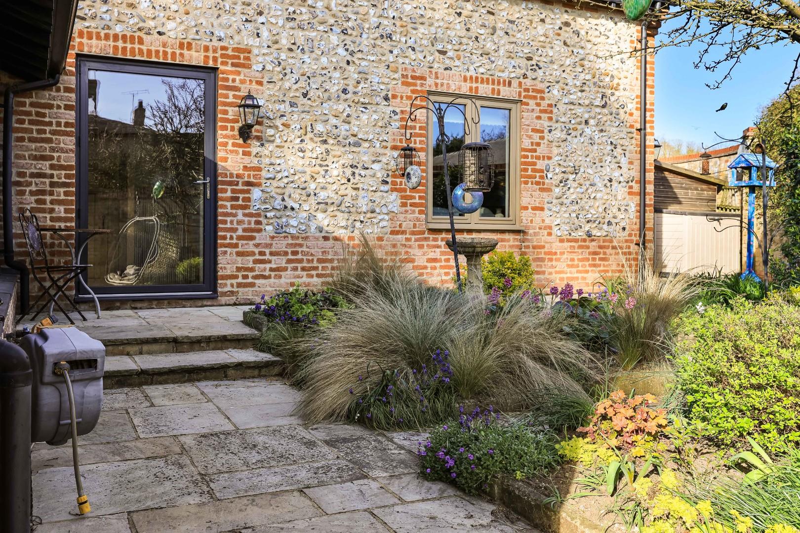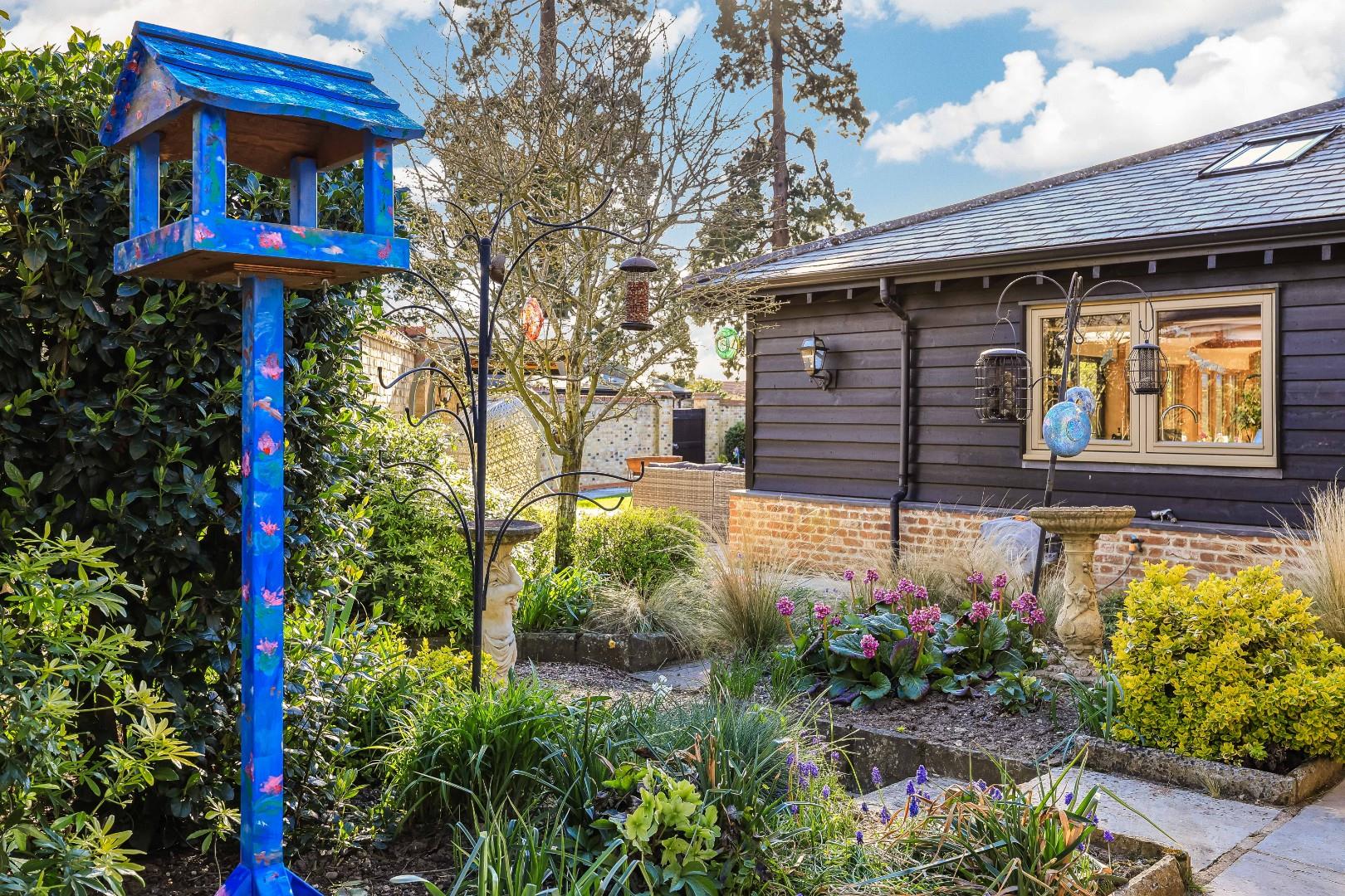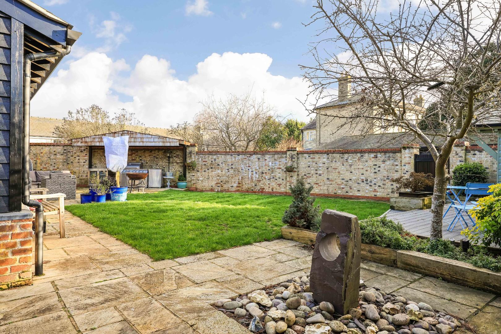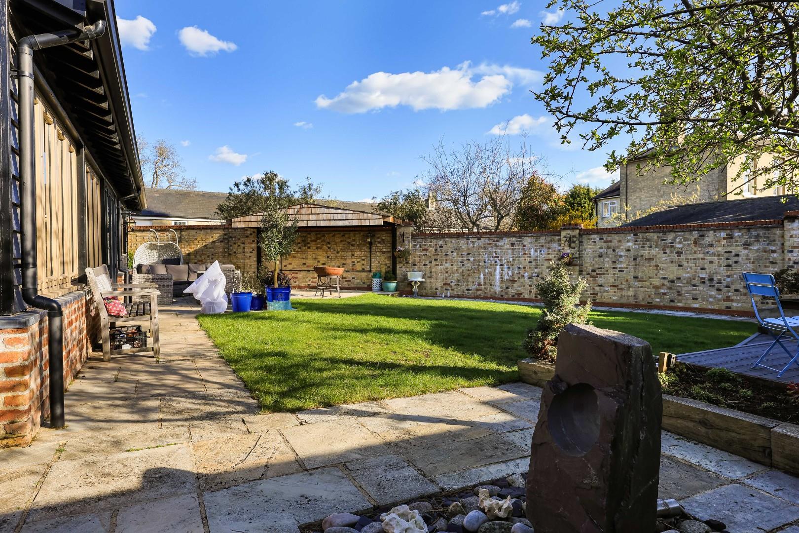 Outside, the walled rear garden has been professionally landscaped and laid to shaped and manicured lawns, bordered by a generous Indian sandstone terrace, ideal for alfresco dining with flower and shrub borders, a summerhouse, and a bin and bike store. Gated rear access leads to a further large storage shed, all enjoys maximum levels of privacy and seclusion.
