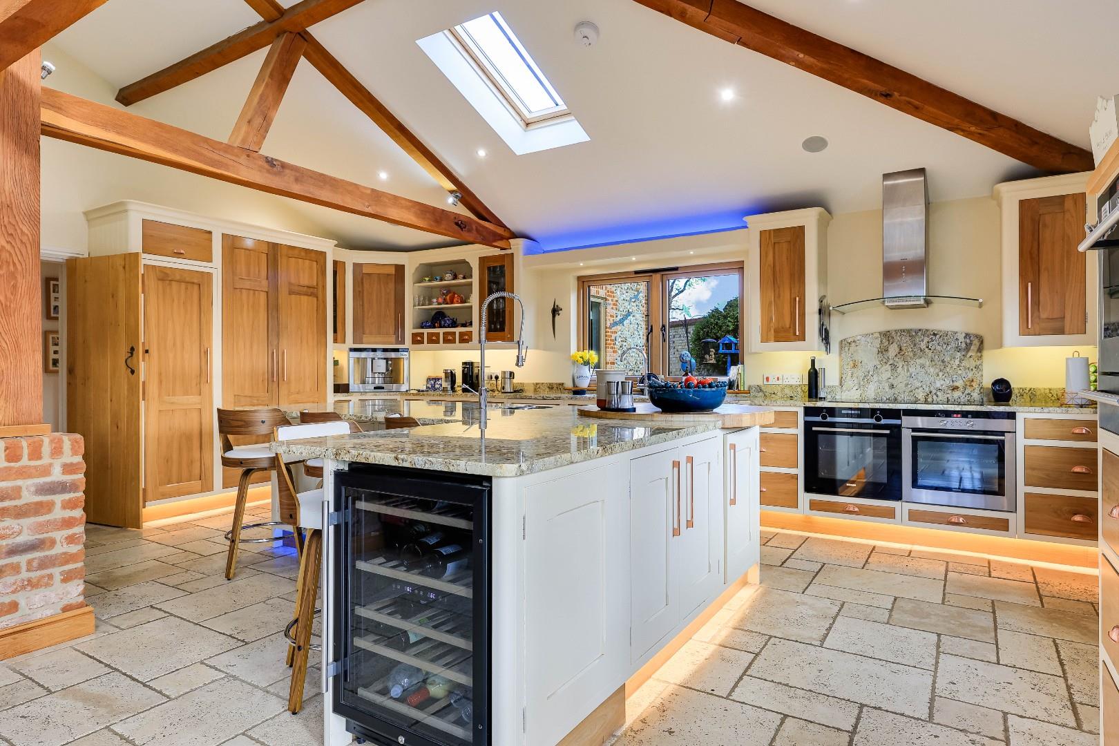 The kitchen area is fitted with handcraft solid wood cabinetry with ample granite working surfaces with matching L-shaped centre island incorporating a breakfast bar plus there is a range of integral high-end appliances and these include: fridge/freezer, dishwasher, induction hob, extractor, four ovens, two warming drawers and a built-in expresso machine. Adjacent to the kitchen is the utility room, fitted with matching cabinetry and space for the usual white goods. Beyond the utility room is a family room/snug and nearby is a secondary staircase which leads to the guest suite with luxury bathroom. From the main staircase, to the galleried landing there are three further double bedrooms with vaulted ceilings and a luxury family bathroom with bath tub and walk-in shower. The master bedroom is an impressive space, again with vaulted ceiling and a wealth of exposed timbers, dressing room and a luxury five-piece bathroom which includes a jacuzzi bath.