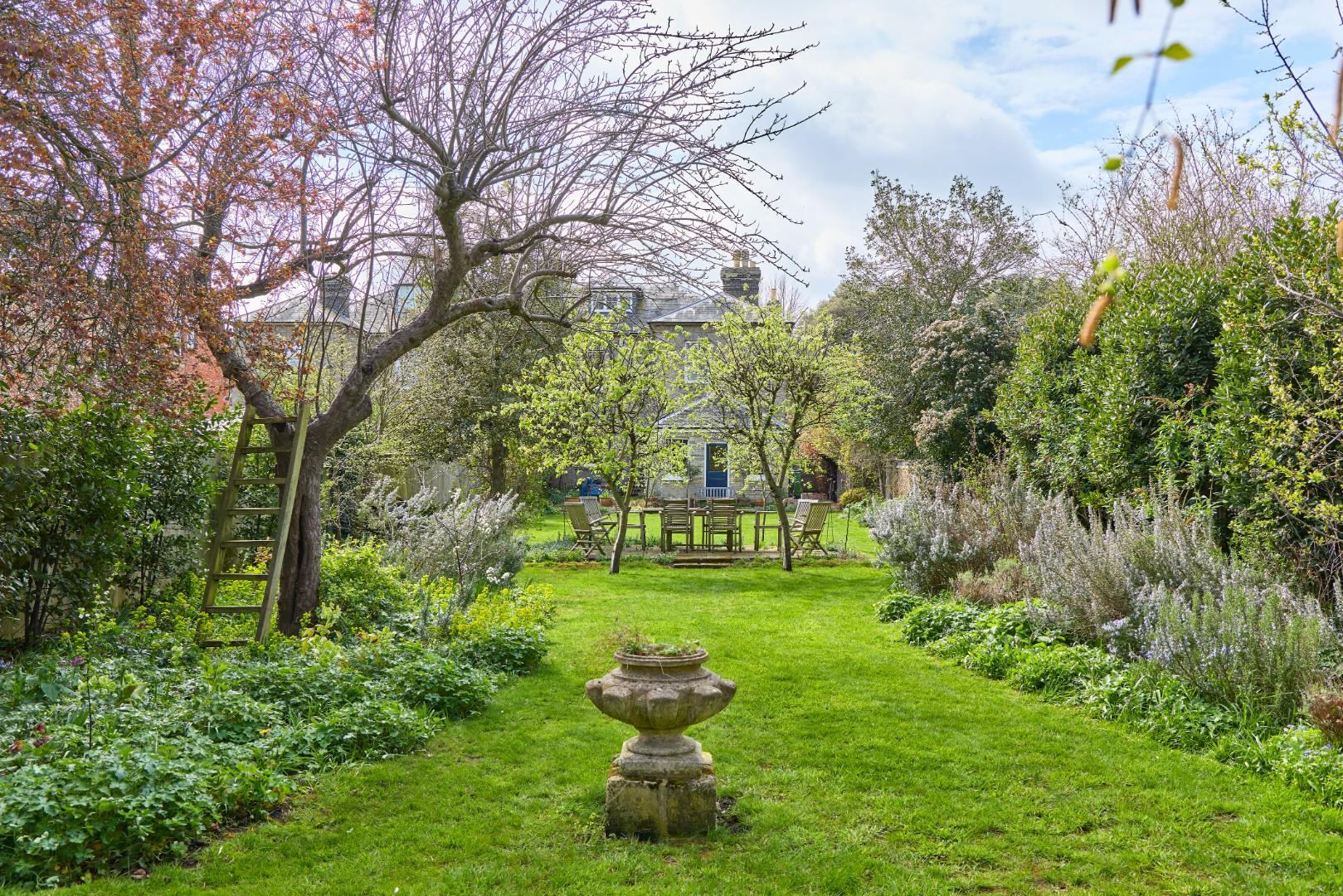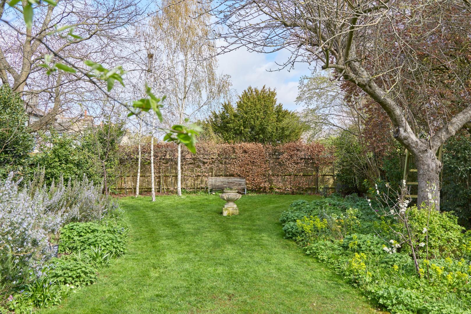 with two terraces and mature trees and shrubs.
