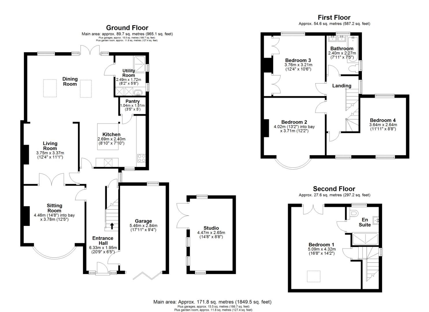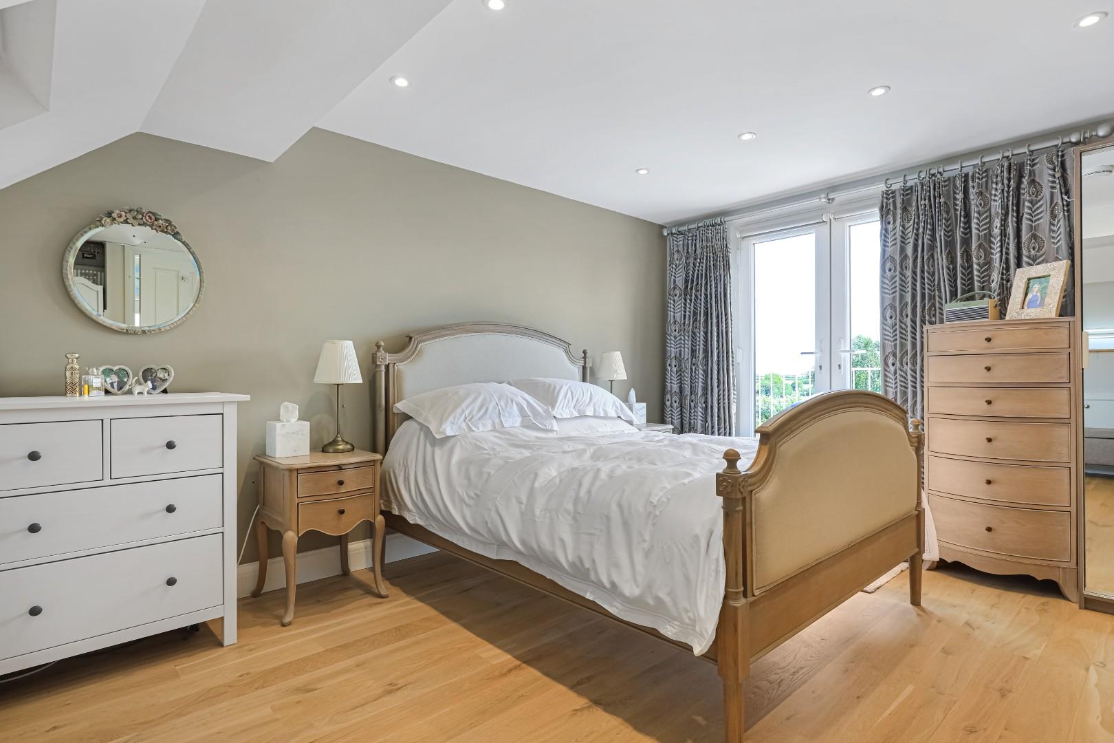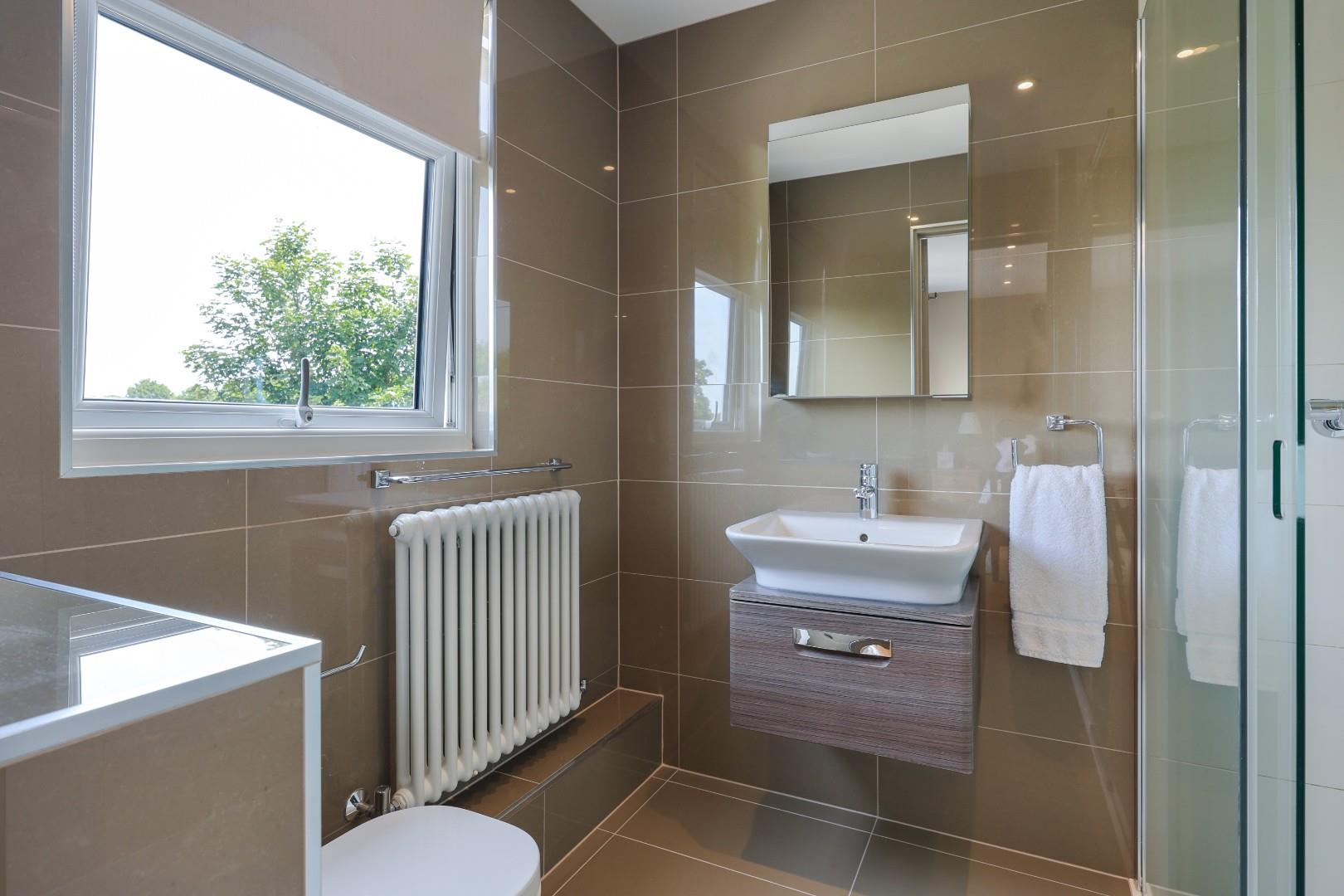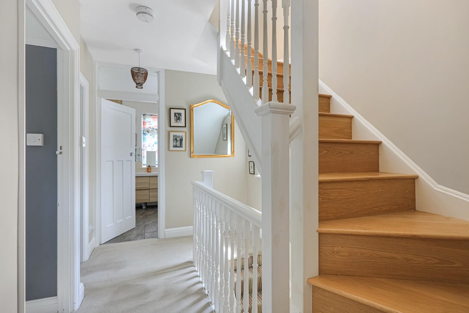 On the first floor there are three good sized bedrooms including a most attractive bay-fronted bedroom and a family bathroom comprising a low-level WC, double basin vanity unit, panel bath, fitted storage cupboards and attractive wall and floor tiles. An oak staircase rises to the second floor where the master suite is a generously proportioned room with oak flooring, eaves storage and French doors to a Juliet balcony with far reaching views over the Gog Magog Hills. The ensuite comprises a closed closet WC, vanity wash hand basin and a generous walk-in shower complemented by attractive wall and floor tiles.