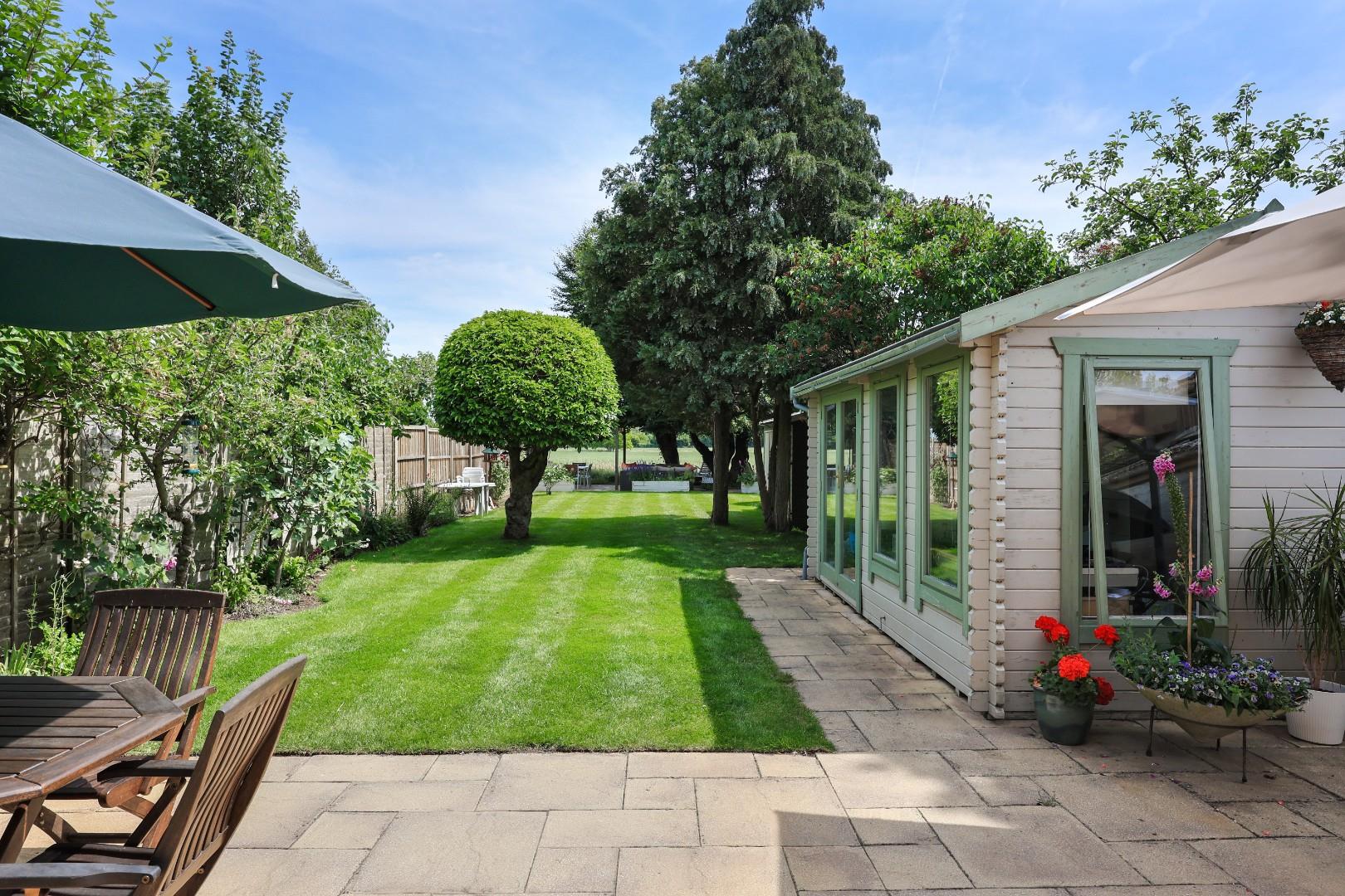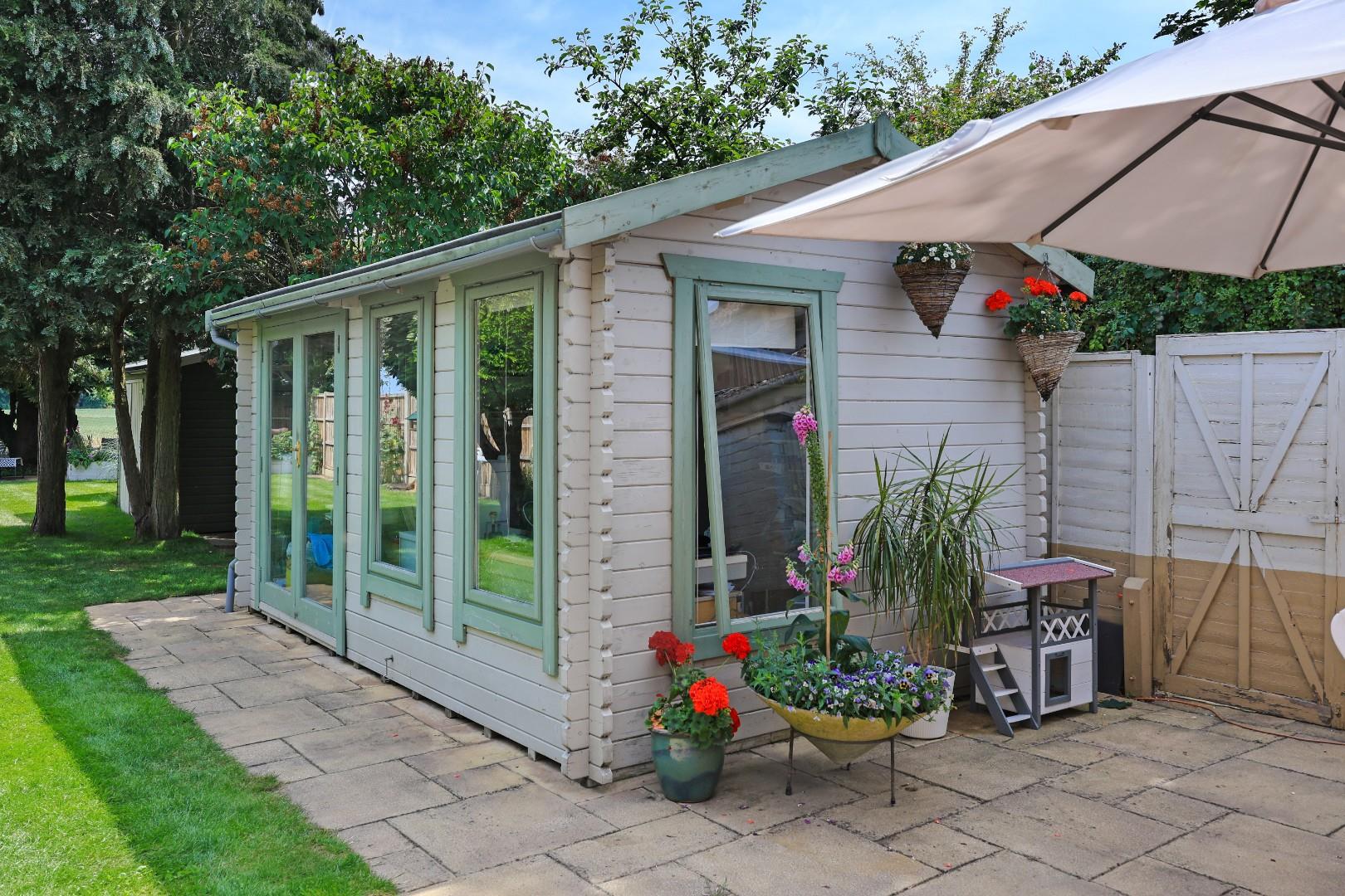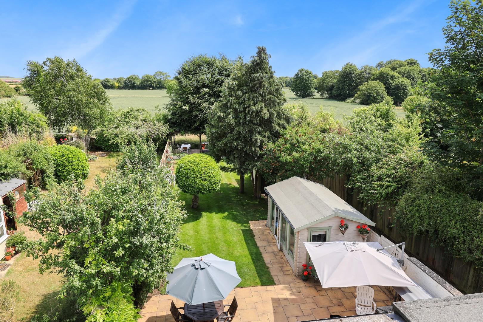Outside, a gravel driveway provides parking for at least four cars and leads to the garage with folding doors, power and light connected, fitted shelving, laminate flooring and a wall mounted gas-fired central heating boiler. The garage could easily be converted into additional living space if required, subject to planning consents. Gated access leads to the rear garden, which is laid mainly to manicured lawns flanked by well-stocked flower and shrub borders, a generous patio ideal for alfresco dining, a selection of specimen trees and bushes, plus an attractive office/studio room. At the end of the garden there is an additional patio with wonderful views over farmland.
