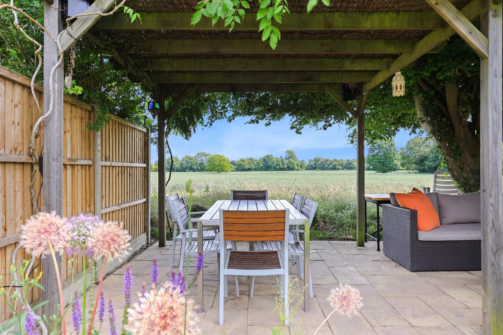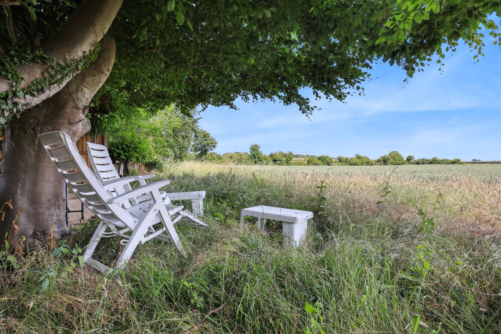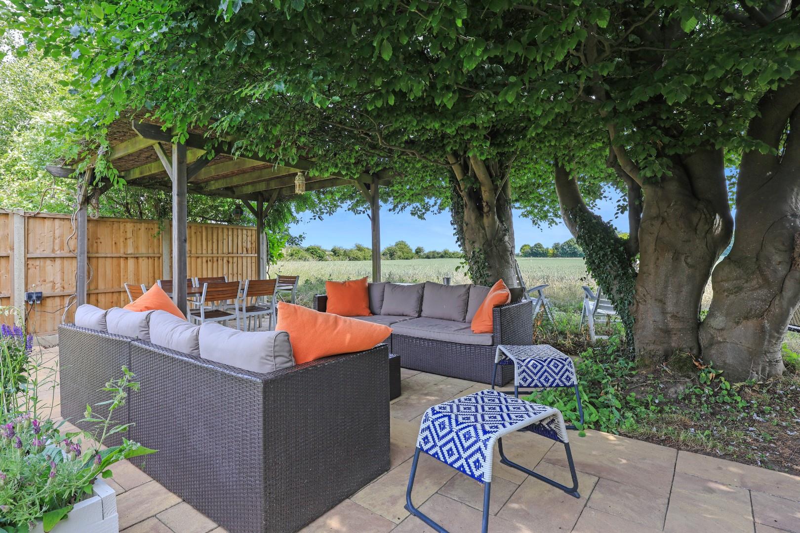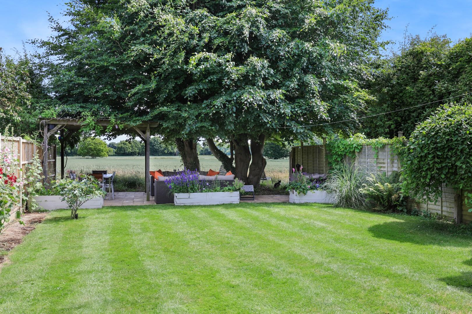 Outside, a gravel driveway provides parking for at least four cars and leads to the garage with folding doors, power and light connected, fitted shelving, laminate flooring and a wall mounted gas-fired central heating boiler. The garage could easily be converted into additional living space if required, subject to planning consents. Gated access leads to the rear garden, which is laid mainly to manicured lawns flanked by well-stocked flower and shrub borders, a generous patio ideal for alfresco dining, a selection of specimen trees and bushes, plus an attractive office/studio room. At the end of the garden there is an additional patio with wonderful views over farmland.