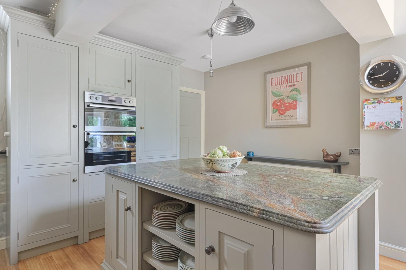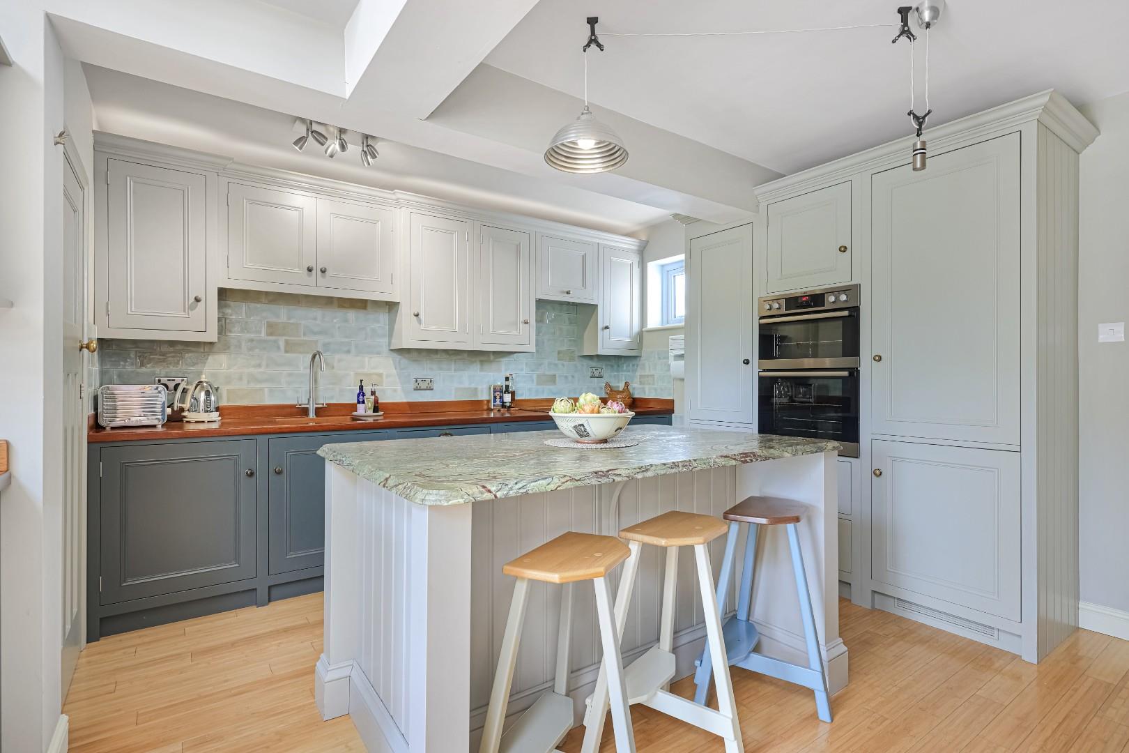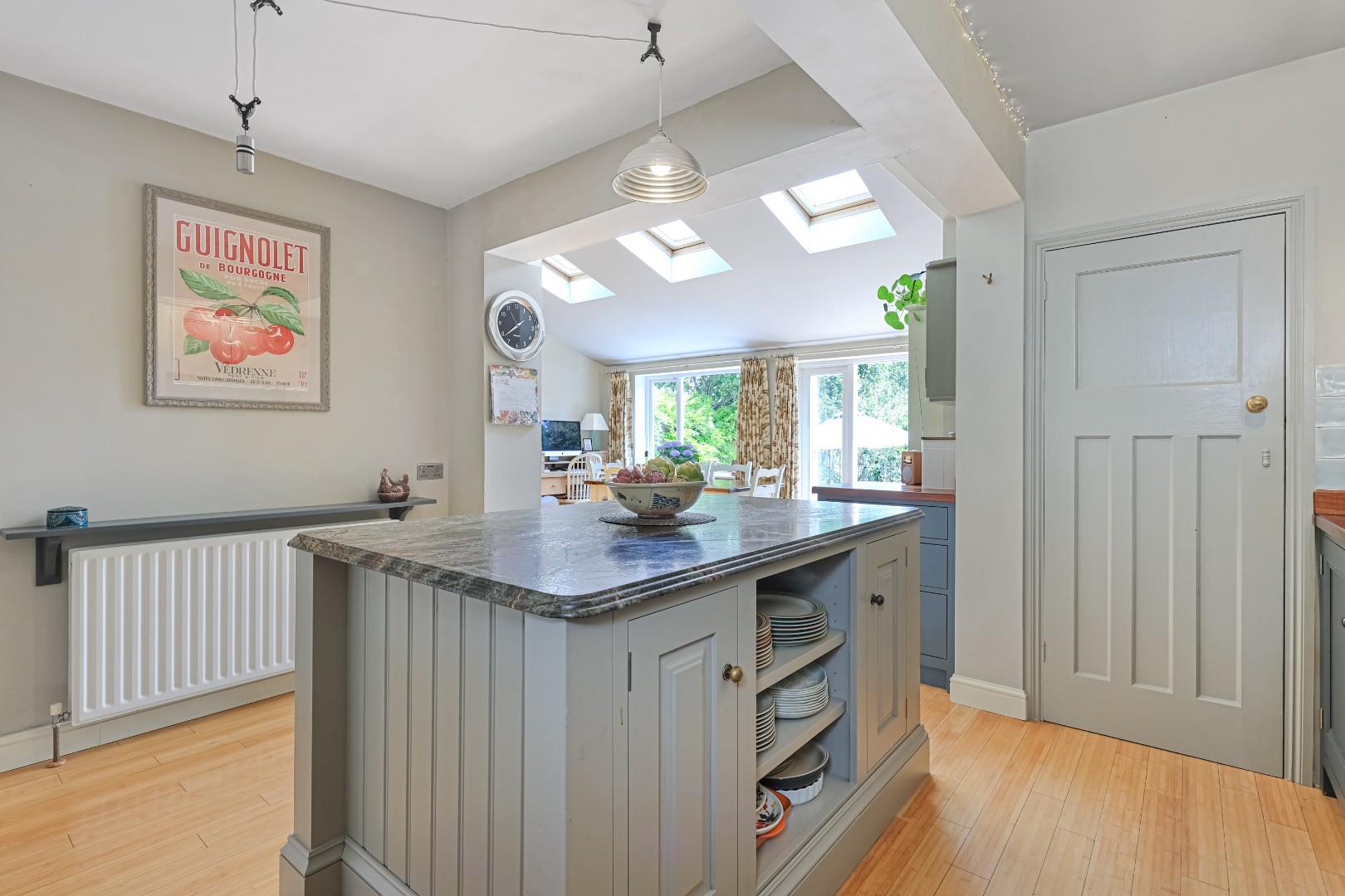 In brief, the accommodation comprises a spacious reception hall with stairs to first floor accommodation, fitted cupboards under the stairs and hardwood flooring. The bay-windowed sitting room boasts a beautiful 1960’s fireplace with decorative tiles surrounding a Contura wood burner. Bespoke arched doors lead through to the lounge, which has a second Contura wood burning stove with a beautiful mantle and over mirror, along with bespoke alcove fitted cabinets and book shelving. The kitchen/dining room has a vaulted ceiling incorporating Velux roof lights with remote controlled blinds and patio doors to the garden. The kitchen is fitted with hand-made cabinetry, complemented by Iroko work surfaces and a walk-in pantry. There are a host of integrated appliances which include an induction hob, double oven, fridge/freezer and a Miele dishwasher. Off the kitchen is a utility room, which incorporates a shower and WC.