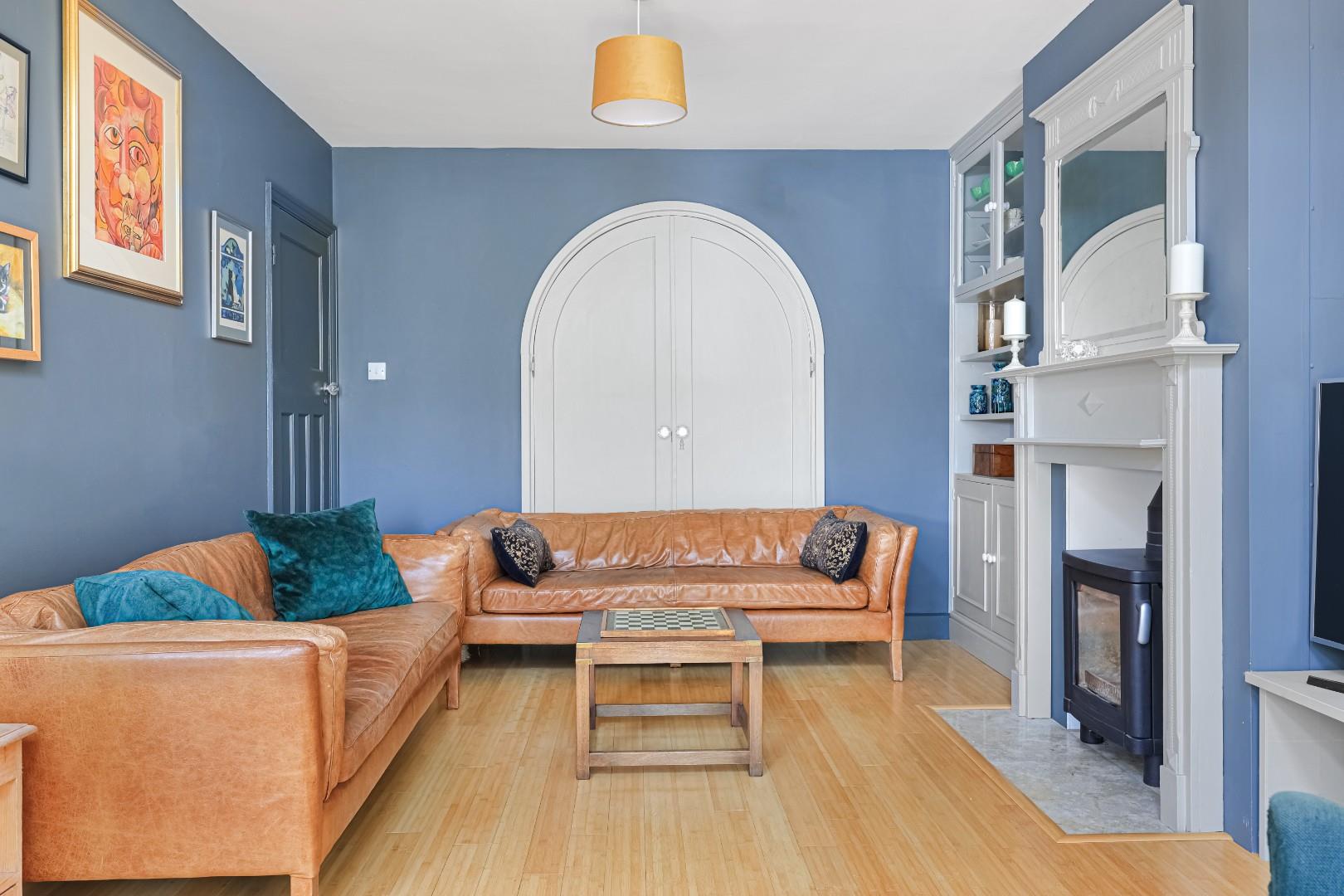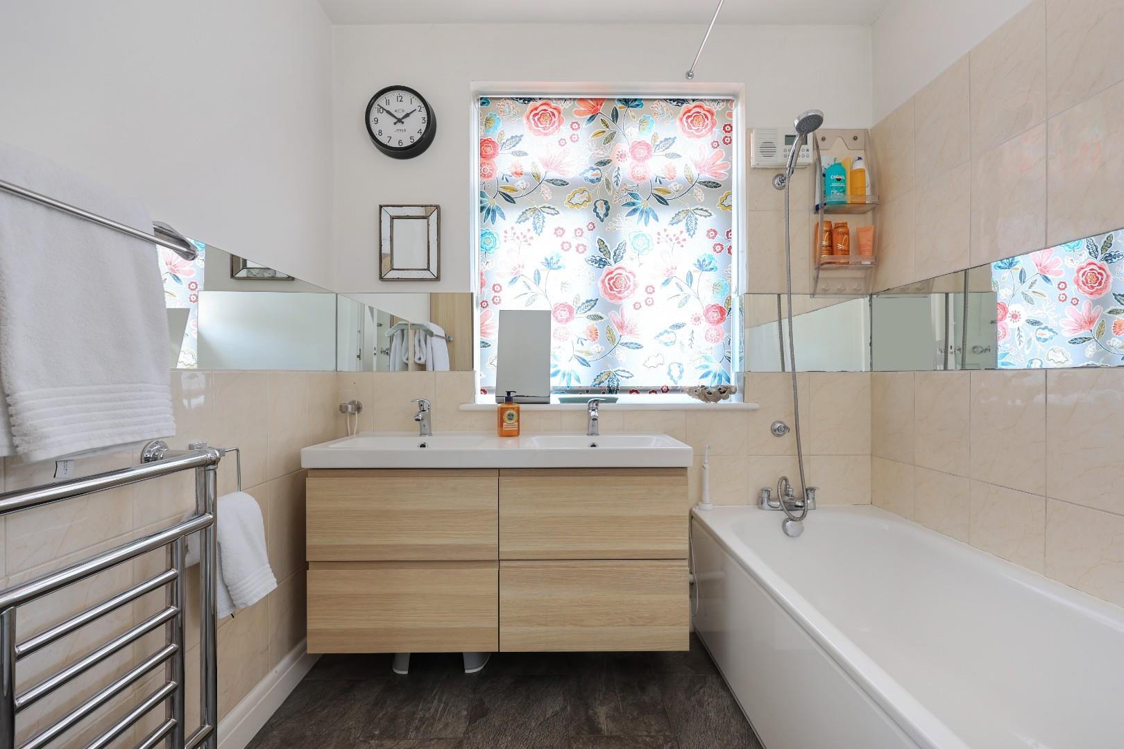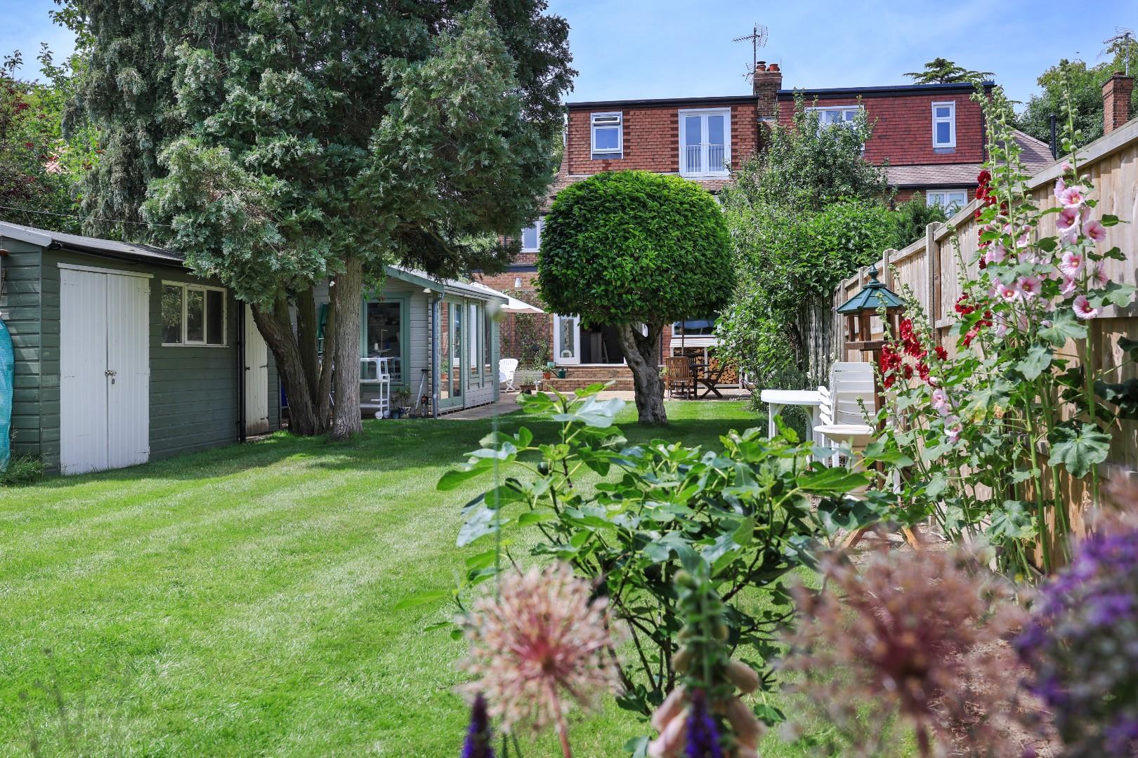 In brief, the accommodation comprises a spacious reception hall with stairs to first floor accommodation, fitted cupboards under the stairs and hardwood flooring. The bay-windowed sitting room boasts a beautiful 1960’s fireplace with decorative tiles surrounding a Contura wood burner. Bespoke arched doors lead through to the lounge, which has a second Contura wood burning stove with a beautiful mantle and over mirror, along with bespoke alcove fitted cabinets and book shelving. The kitchen/dining room has a vaulted ceiling incorporating Velux roof lights with remote controlled blinds and patio doors to the garden. The kitchen is fitted with hand-made cabinetry, complemented by Iroko work surfaces and a walk-in pantry. There are a host of integrated appliances which include an induction hob, double oven, fridge/freezer and a Miele dishwasher. Off the kitchen is a utility room, which incorporates a shower and WC.