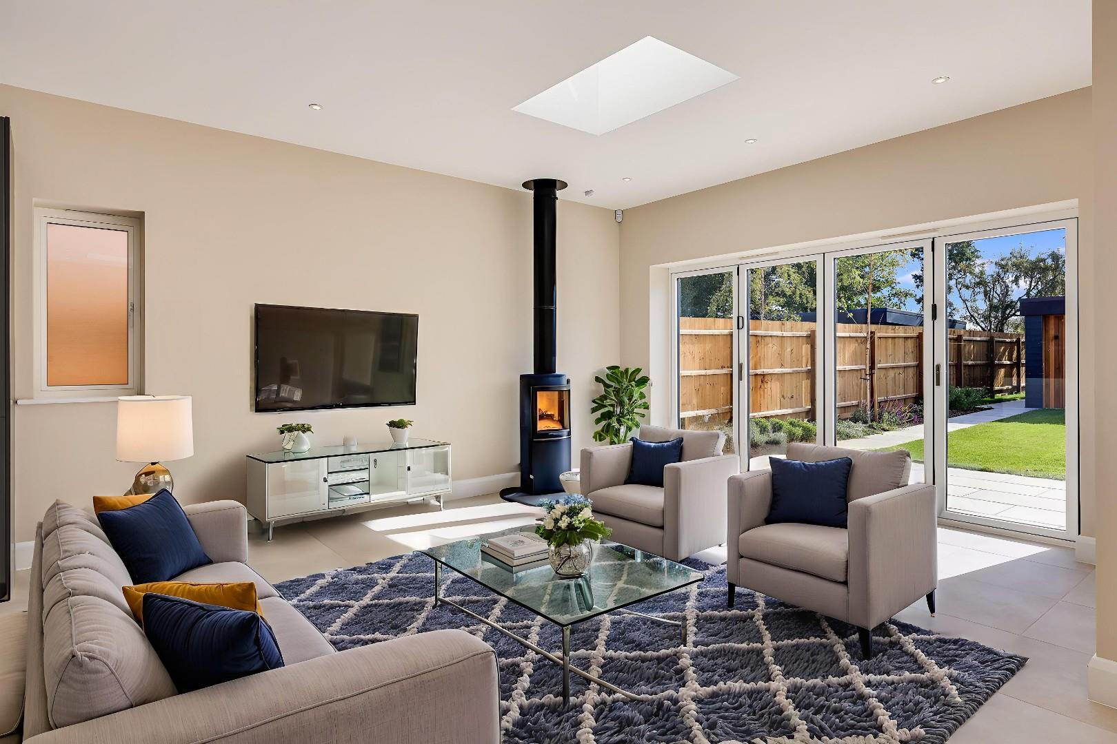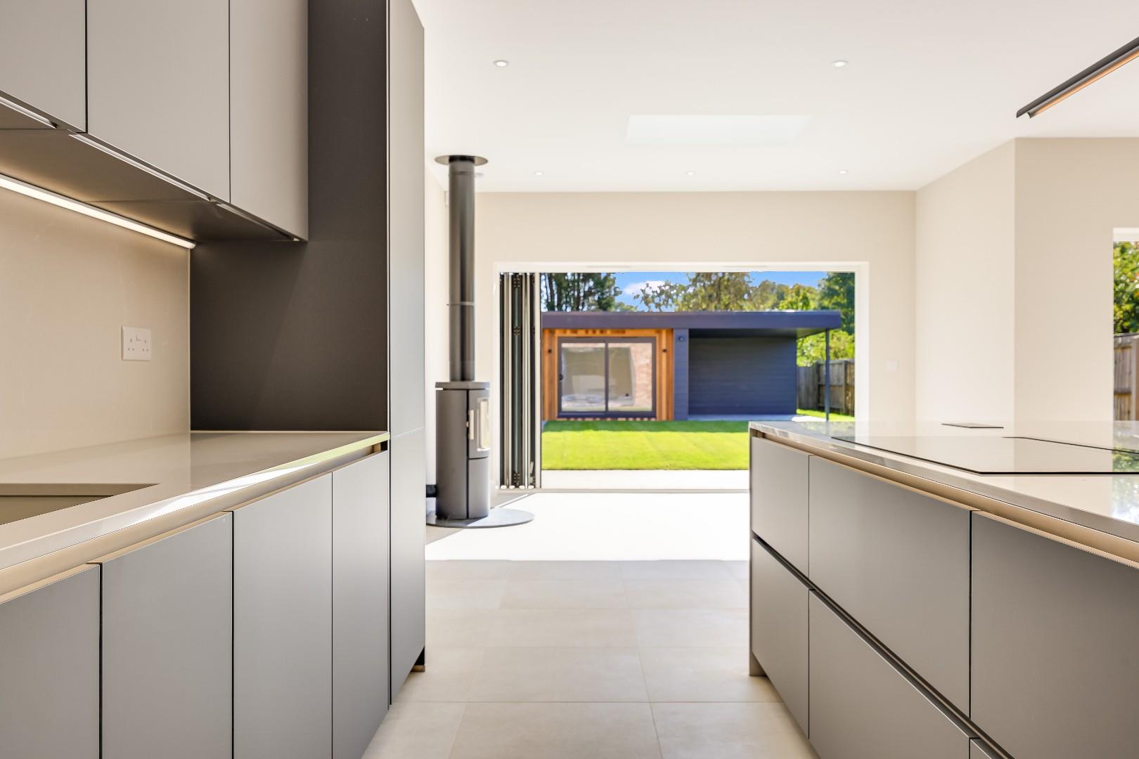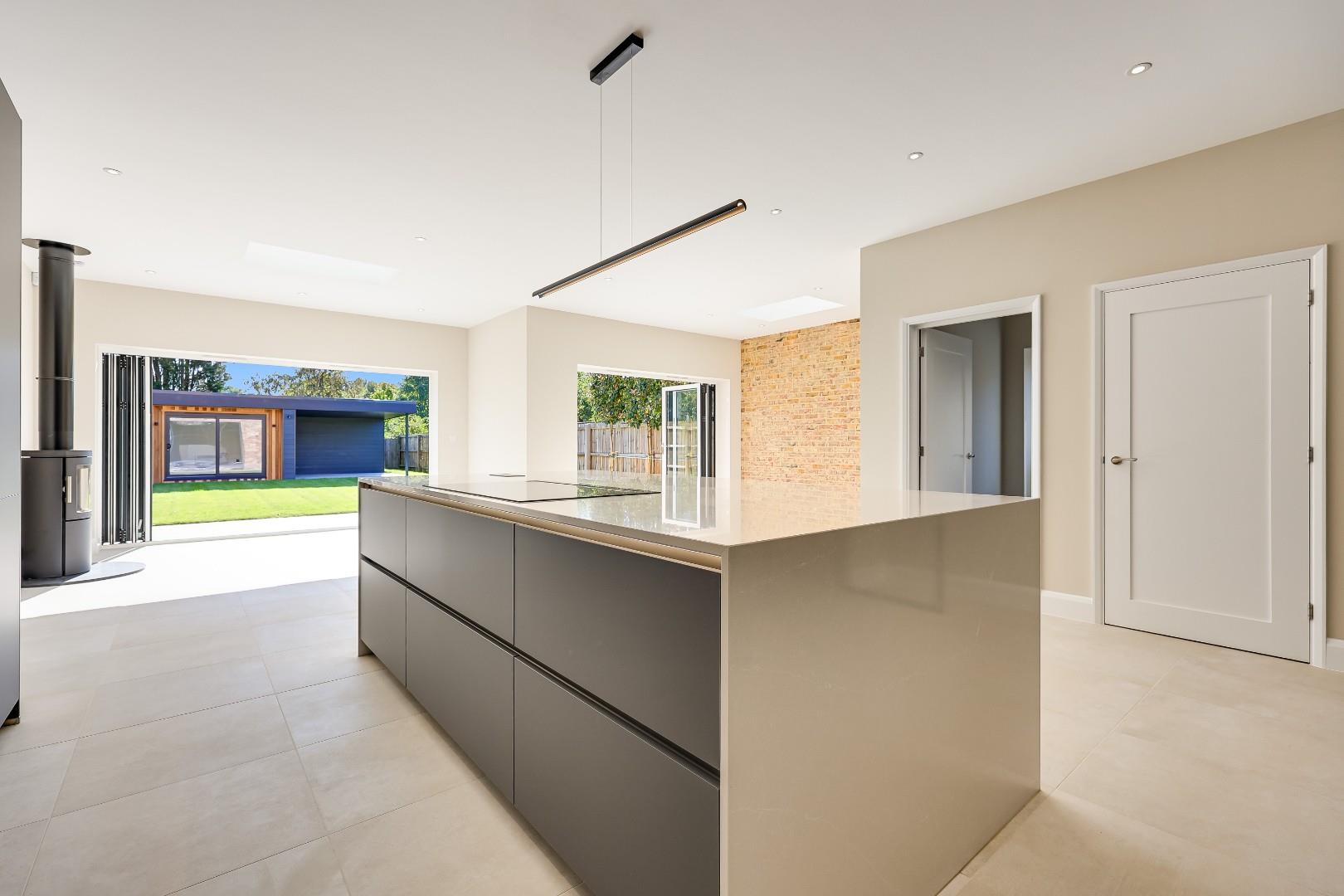 From the entrance hall you step down to the most impressive kitchen/dining/family room with two sets of folding doors opening to a large rear terrace and landscaped rear garden. The kitchen itself features luxury ‘ByDesign’ custom-built units complimented with quartz work surfaces and integrated Miele appliances.