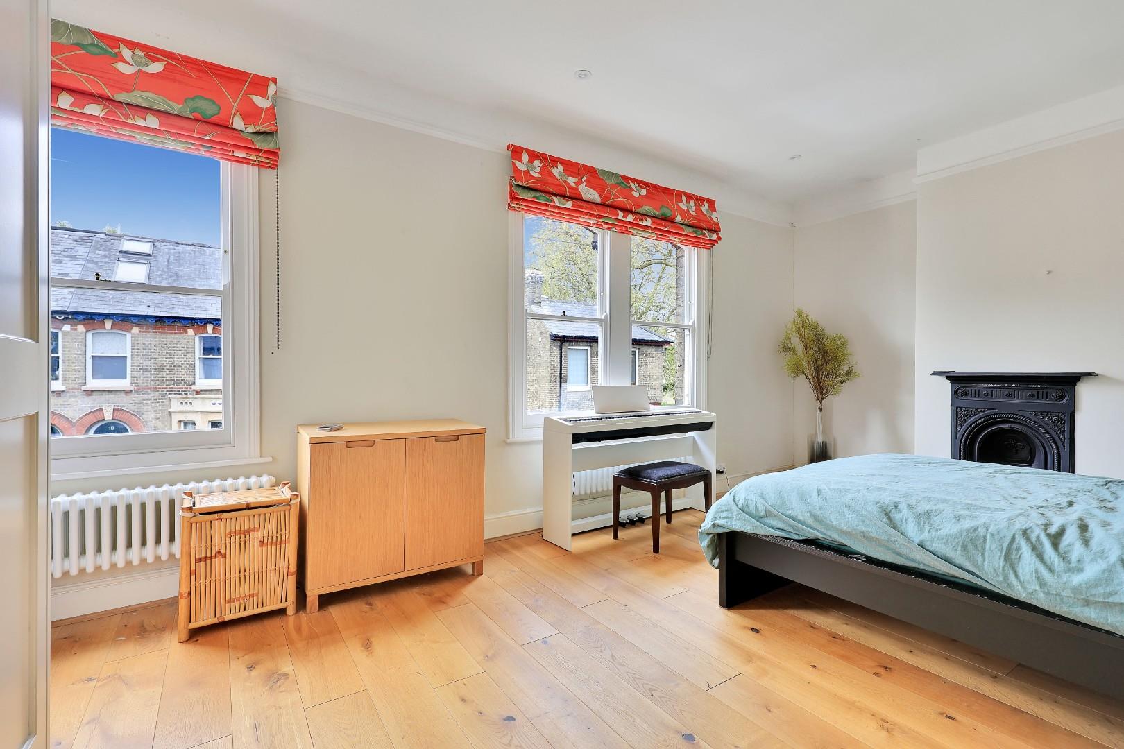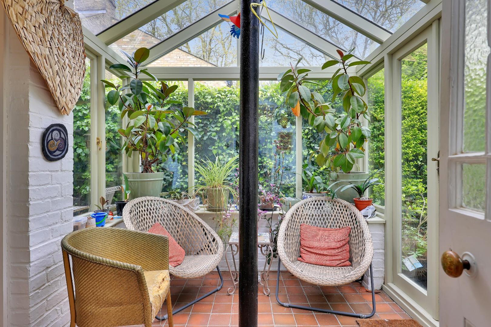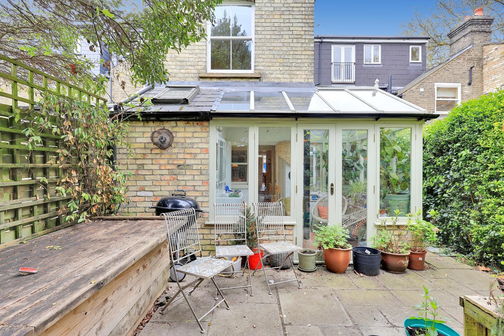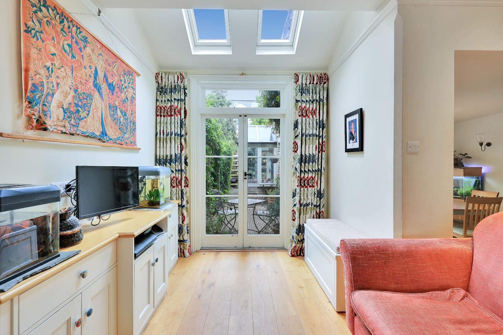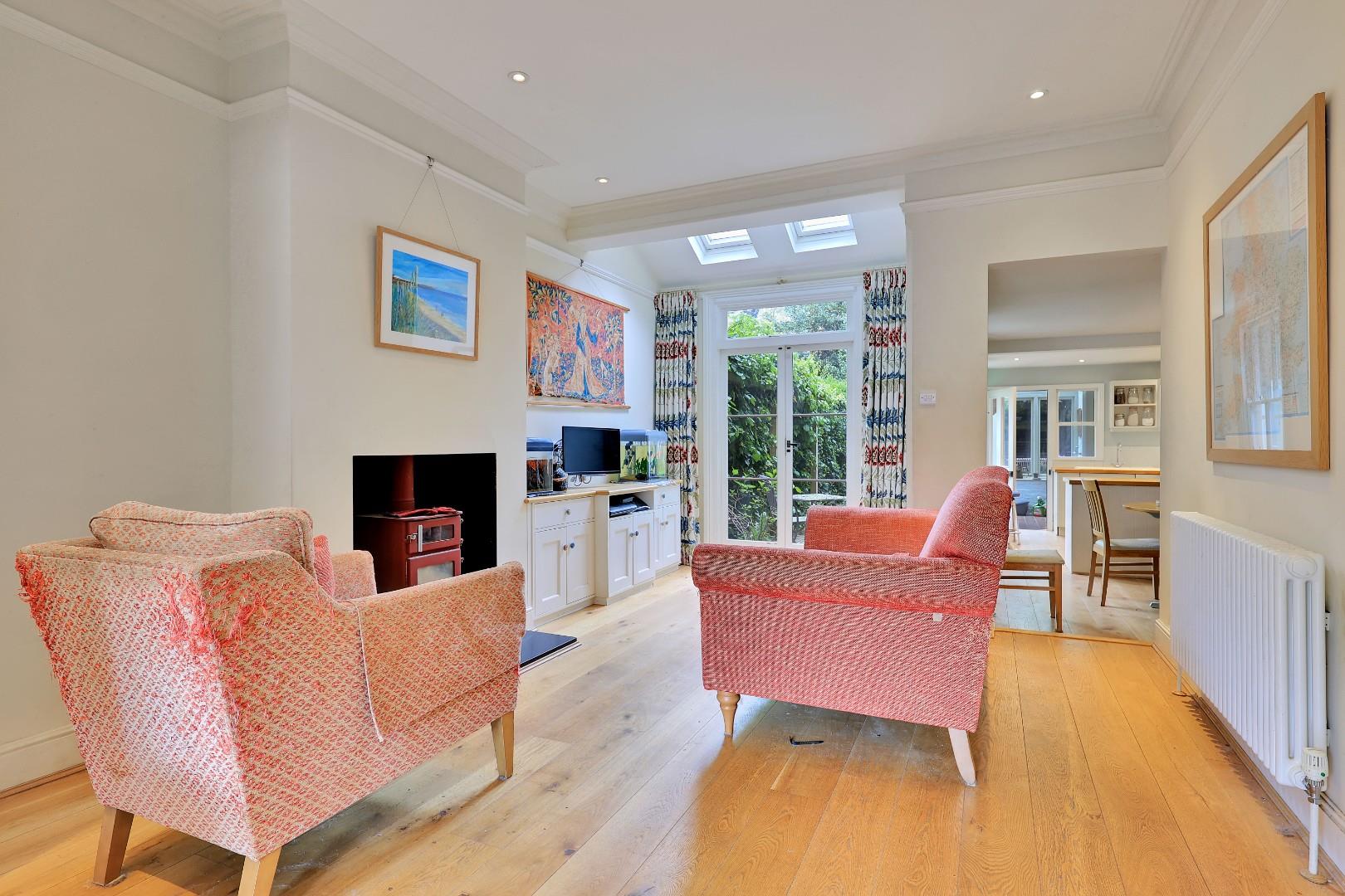 The accommodation extends over three light and spacious floors; the ground floor comprises an entrance hall with a WC, two elegant and well-proportioned reception rooms, which connect by impressive folding doors with stained-glass panels. The front reception room has a beautiful period fireplace and a bay window overlooking the front aspect. The back reception room has a contemporary woodburning stove and a snug/study area, Velux windows and glazed double doors providing access to a private outside courtyard area. A generous open plan kitchen/dining room overlooks the courtyard and has a well-equipped modern kitchen with solid wood working surfaces and a peninsula. A charming garden room and a utility room providing plumbing and additional storage complete the ground floor accommodation.
