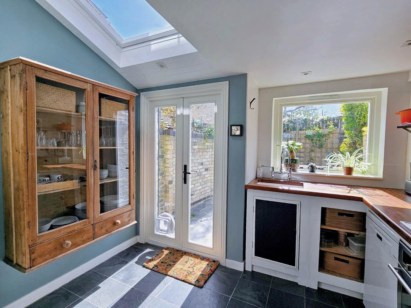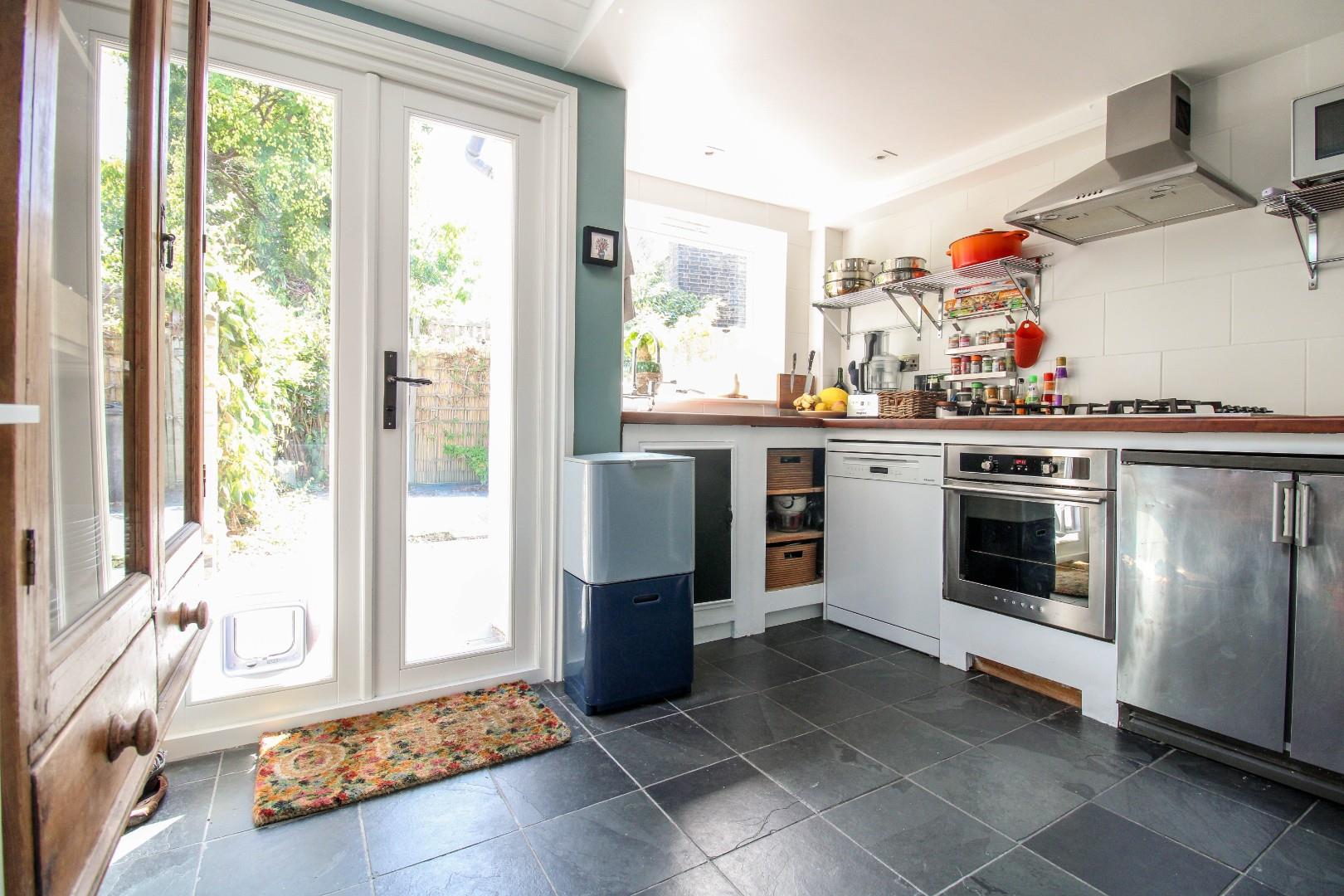 The property enters into the living/dining room, which has a working fireplace and stairs to the first floor with built-in, open shelves beneath and a tasteful cast iron handrail. To the rear, the well-appointed and extended kitchen has a part-vaulted ceiling and is replete with slate flooring, wooden worktops, Belfast sink, electric oven with 5-burner gas hob and extractor hood over, space for fridge/freezer and plumbing for dishwasher. French doors provide views of and access to the rear garden.