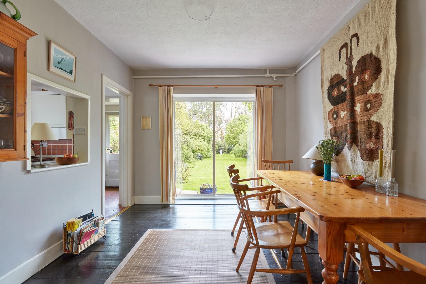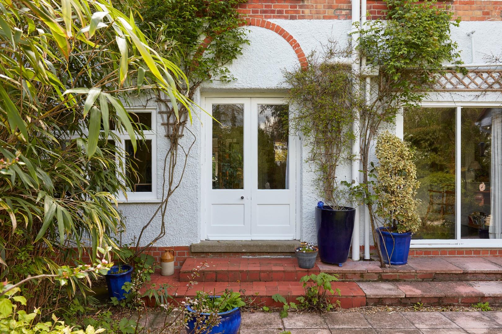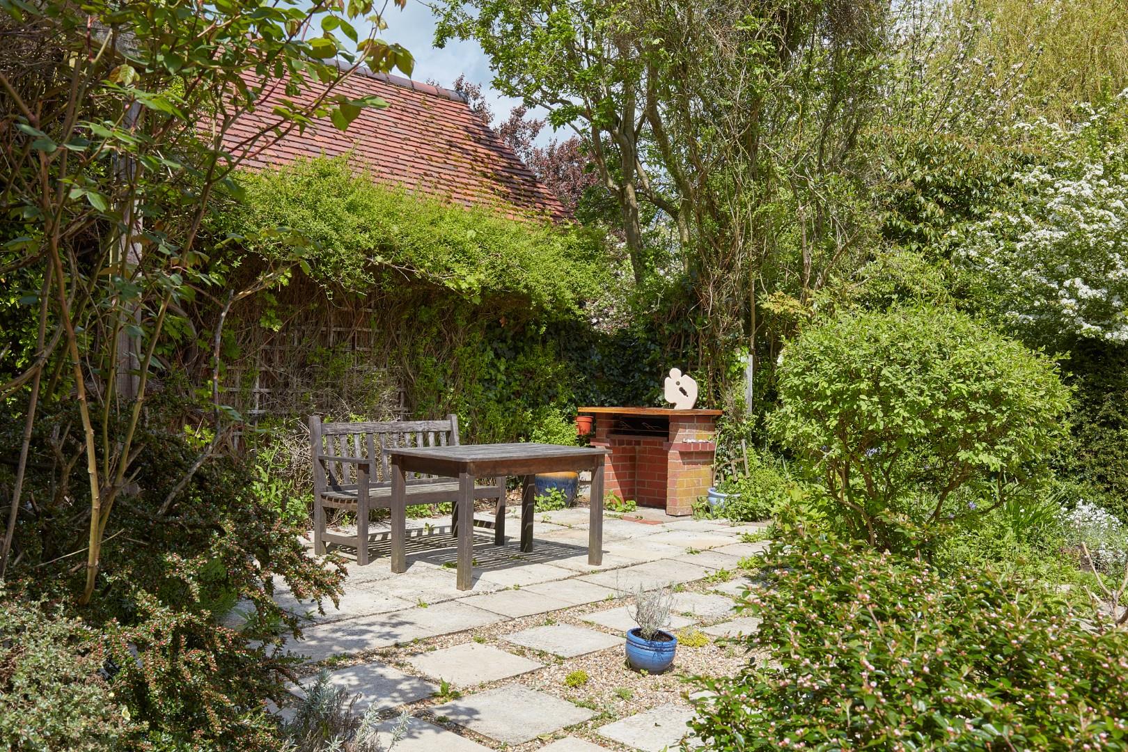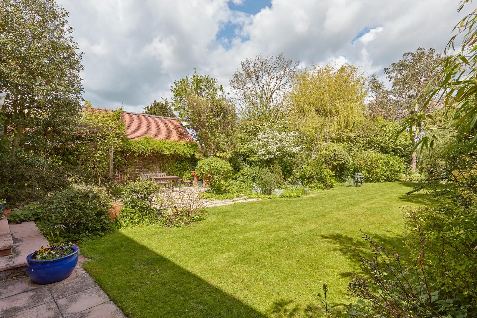 Outside, the property sits back from the road behind a generous frontage, with mature shrubs and hedging, providing screening and ample off-road parking. A side gate leads to the rear garden and a detached studio/workshop with a utility room and power connected. The large rear garden, which is predominately laid to lawn, has been beautifully designed and has attractive mature trees and shrubs set to borders on both sides. Doors from both the sitting and dining room open to steps leading down to a shallow terrace, which in turn leads to a large paved terrace area. With a brick barbeque and views of the house and garden, this terrace is lovely spot on which to entertain. To the rear of the plot, there is a large shed and a gazebo and space for a kitchen garden/vegetable patch.