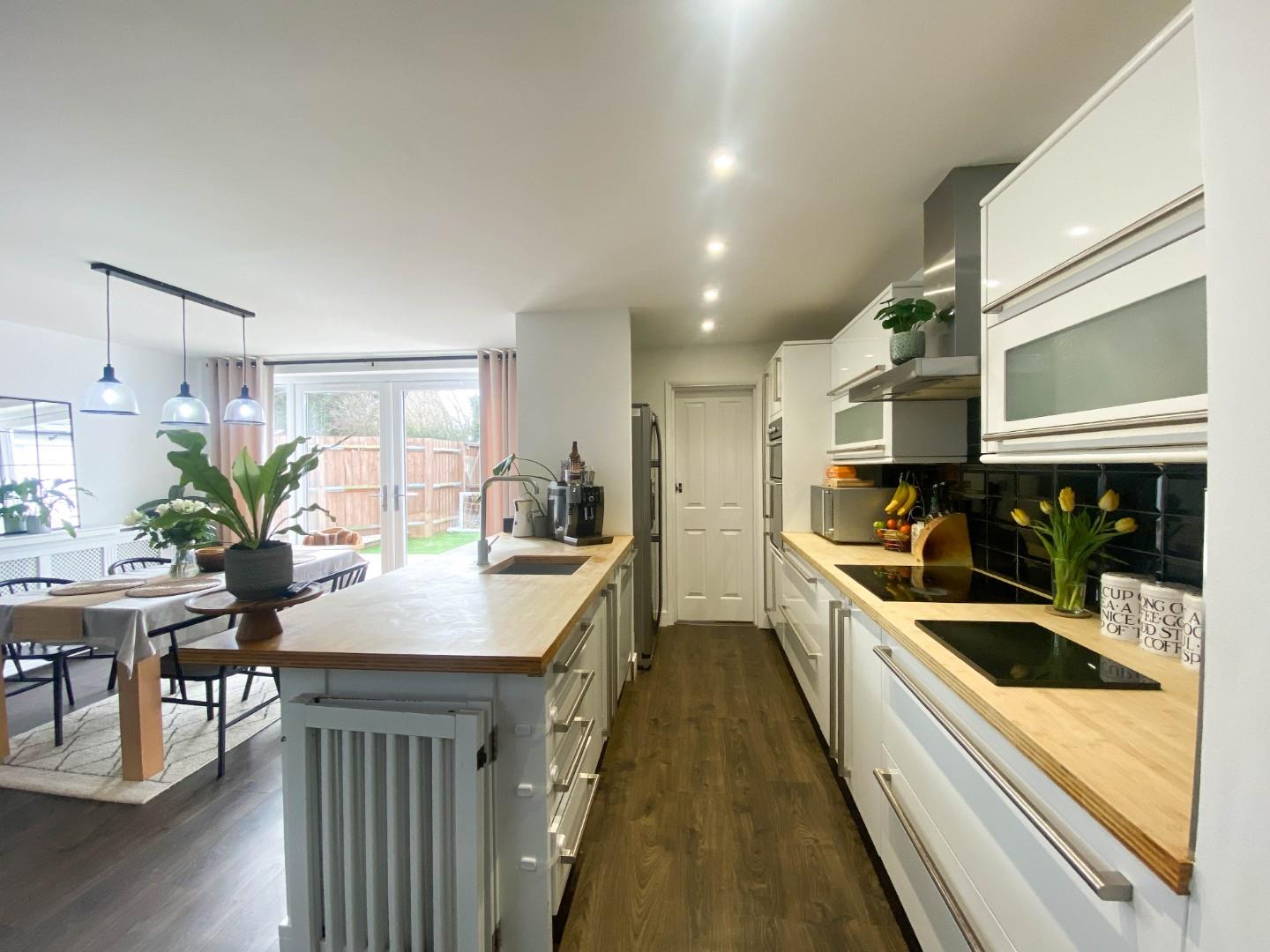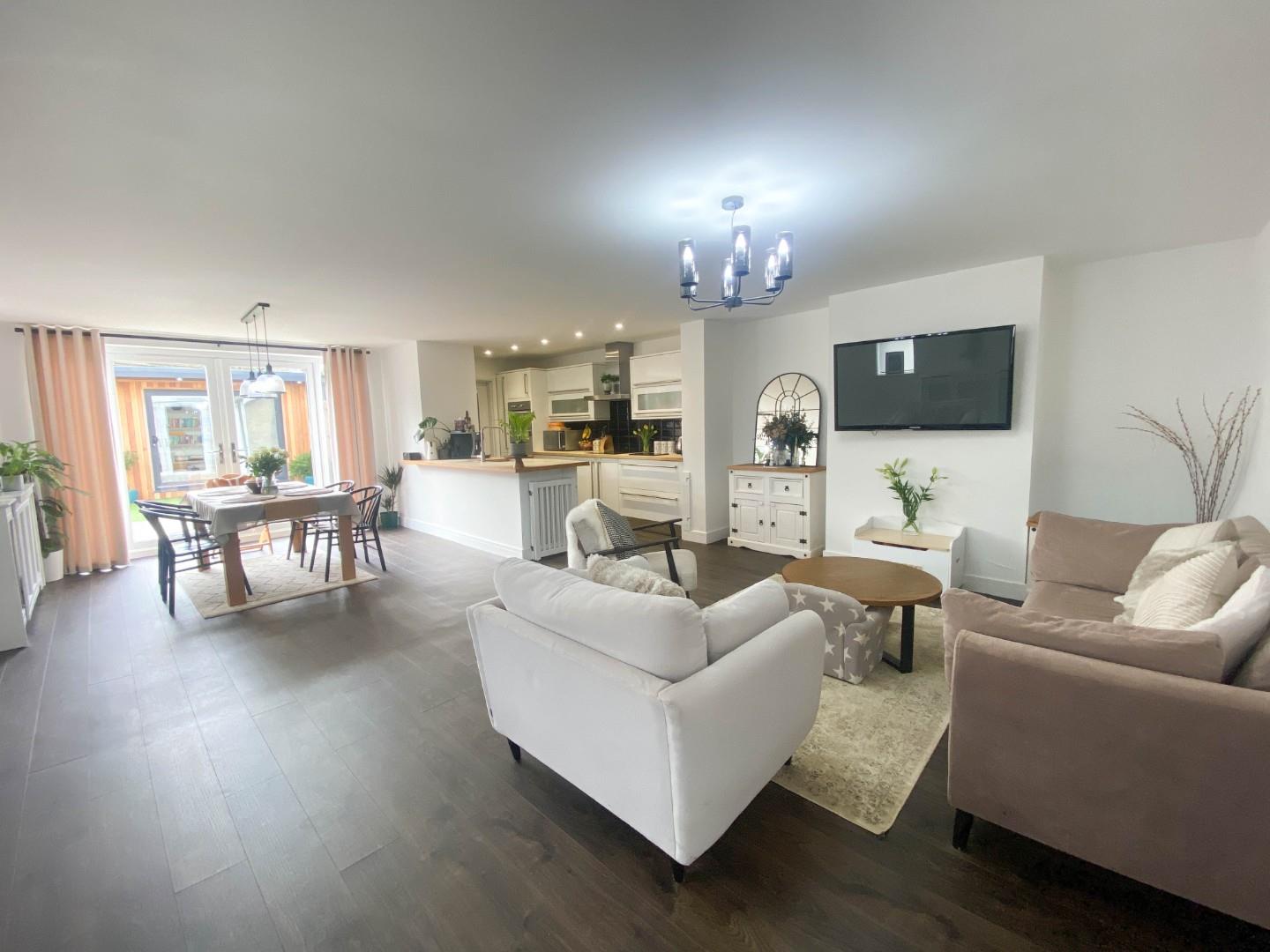 The accommodation comprises a welcoming reception hall with stairs to first floor accommodation, LVT flooring and a cloakroom/WC just off. The heart of this beautiful home is the large open planned kitchen/dining/family room with French doors to the rear garden and laid again to LVT flooring. The kitchen area is fitted with attractive contemporary cabinetry, solid bamboo working surfaces with matching peninsular island with inset single sink unit and a range of integrated appliances including a four ring induction hob, double oven, dishwasher and space for an American style fridge/freezer. Adjacent is a handy utility room with door to garden, space for the usual white goods and a free standing oil fired central heating boiler.