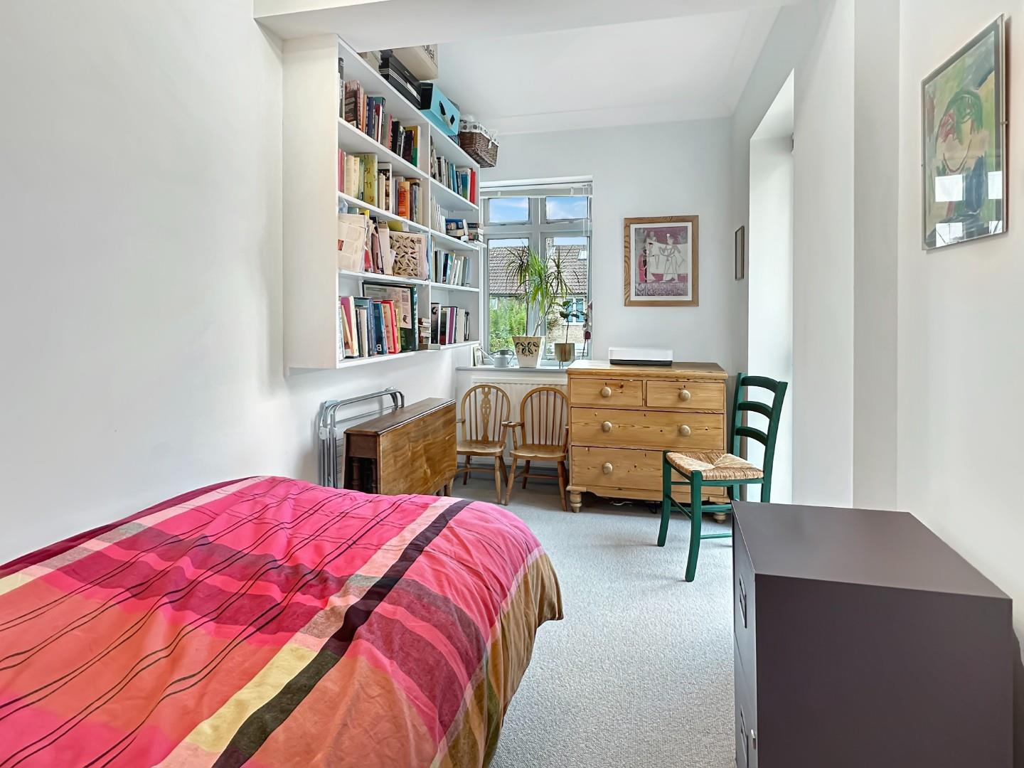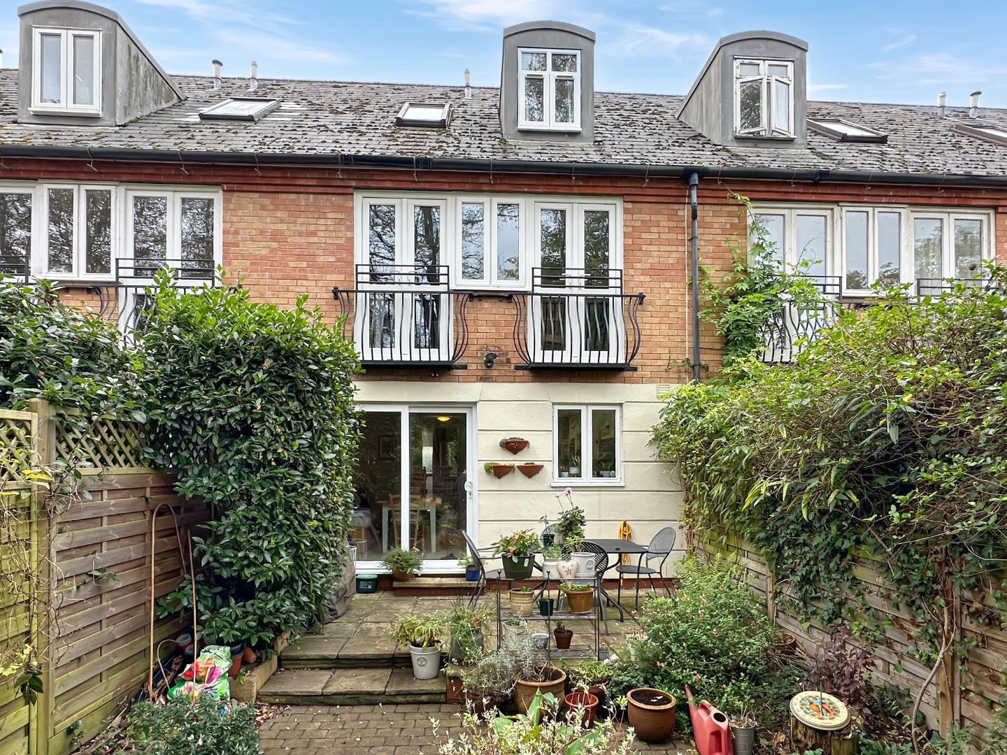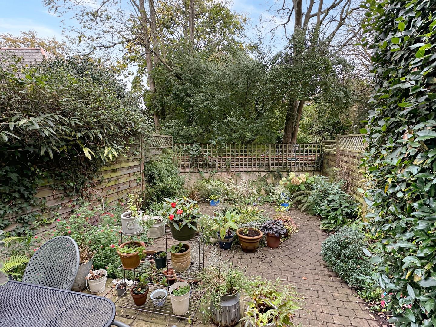 The front garden is mainly hard landscaped with an established amelanchier tree. There is a parking space, access to the garage and an externally accessed boiler cupboard. The garage has light and power and an electrically powered up-and-over door. There is plumbing for a washing machine, space for a dryer and a cold water tap next to the up and over door. The fenced east facing rear garden is about 26ft deep x 16ft wide and is paved and on two levels with mature shrub borders. There is an outside tap. The garden is very private and enjoys the benefit of the mature trees located on the land behind the house.